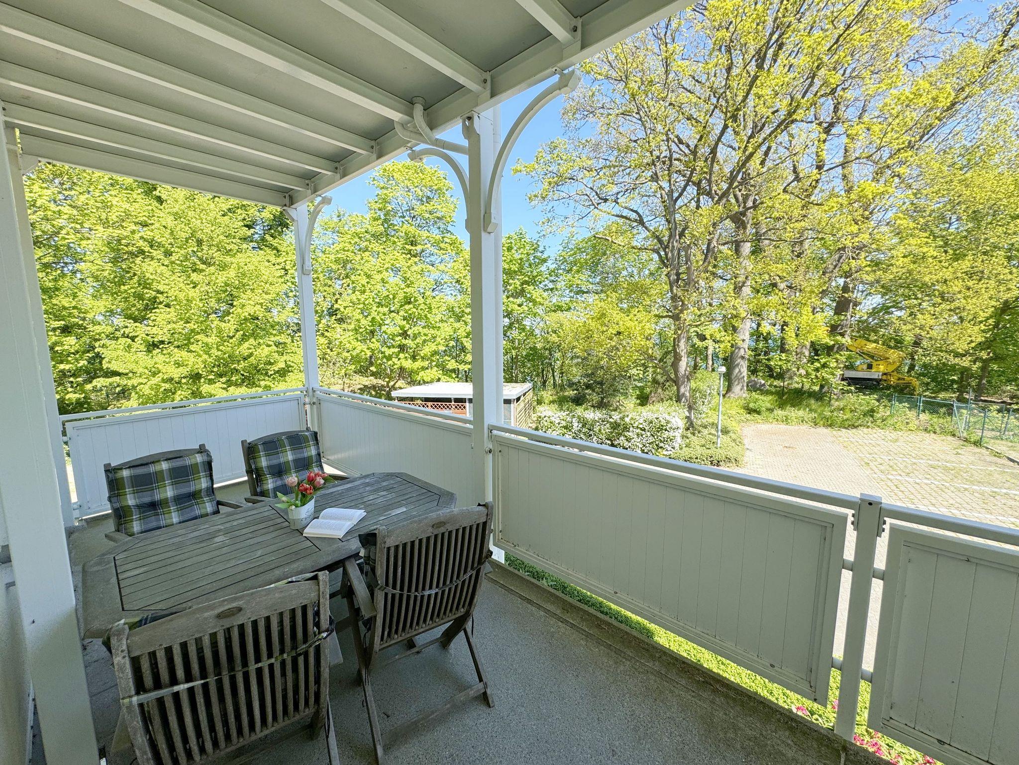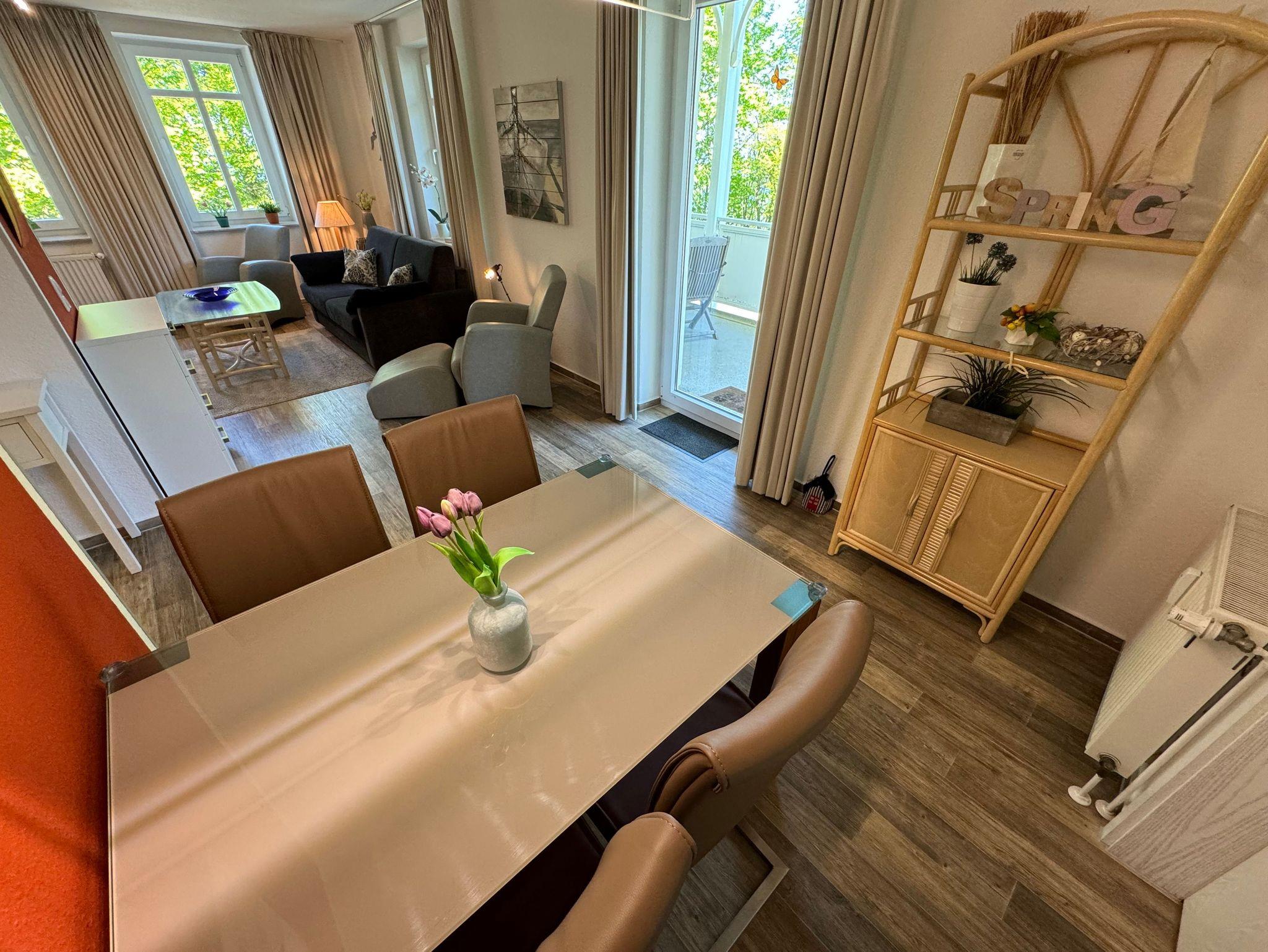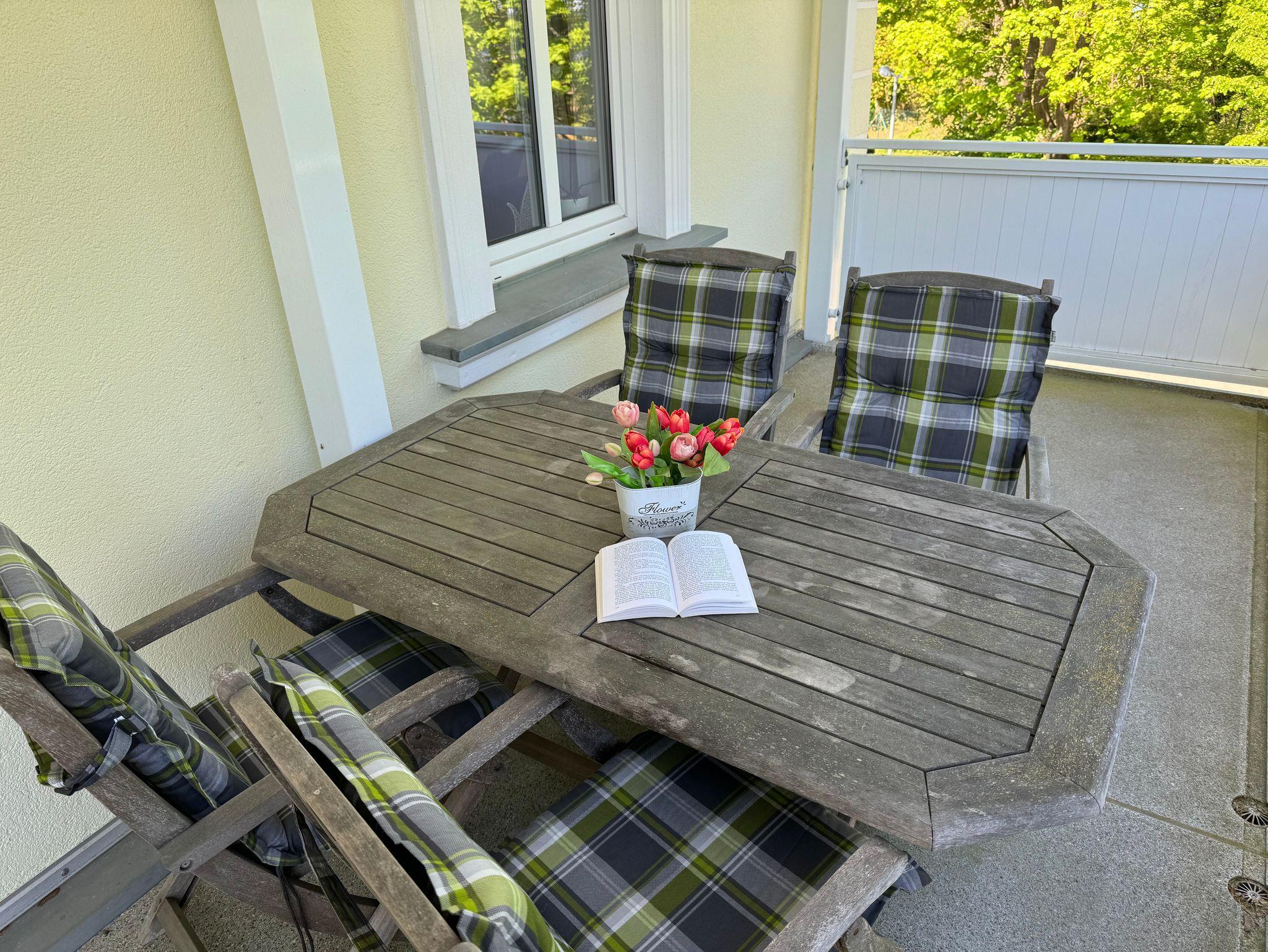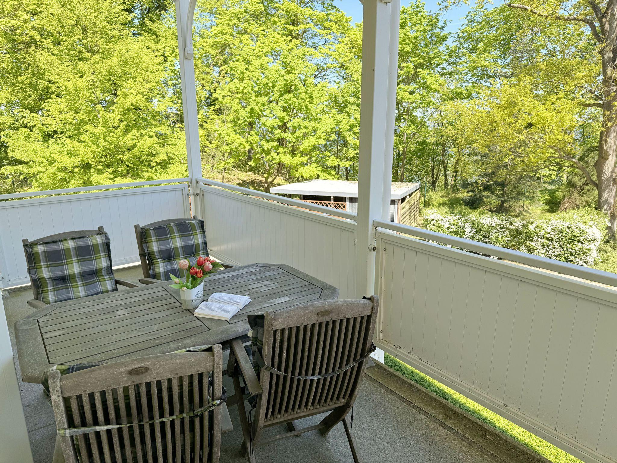 Die 2-Raumferienwohnung ist als Nichtraucher deklariert und befindet sich im 1. Obergeschoss des Hauses. Mit Ihren ca. 60 qm Wohnfläche bietet Sie ausreichend Platz für 2 - 4 Personen. Die Ferienwohnung ist komfortabel und geschmackvoll eingerichtet. Der Wohnbereich verfügt über eine Couchecke mit Ausziehfunktion (Aufbettung 3. und 4. Person, 1,80m x 2,00m), Couchtisch und Sideboard, Leselampe, mit Smart-TV, Radio + CD-Player. Die angrenzende Küchenzeile mit Esstisch ist komplett ausgestattet mit Geschirrspüler, Backofen mit 4-Zonen-Ceranfeld, Mikrowelle, Kühlschrank mit Eisfach, Kaffeemaschine, Toaster, Wasserkocher sowie diversen Küchenutensilien. Das Badezimmer umfasst eine Dusche, WC, Fön und Waschtisch. Das separate Schlafzimmer mit einem Doppelbett (0,90 x 1,80 m) mit Nachtischkonsolen und geräumigen Kleiderschrank rundet die Ferienwohnung ab. Zu den Highlights der Wohnung gehören der große überdachte Balkon und der traumhafte Blick auf die Steilküste und das Meer (im Sommer eingeschränkt durch die Blätter des alten Baumbestandes am Hang). Auch in Ihrem Urlaub brauchen Sie auf einen Internetzugang (WLAN) nicht verzichten, dieser ist vorhanden und inklusive. Ein PKW-Stellplatz ist direkt vor dem Haus. Ihre mitgebrachten oder auch vor Ort geliehenen Fahrräder können Sie im Abstellraum unterstellen. Haustiere sind in der Wohnung nicht erlaubt. Die Erstausstattung eines Wäschepaketes (komplette Bettwäsche, 1 Duschhandtuch, 1 kleines Handtuch) können Sie bis 14 Tage vor Anreise gegen einen Aufpreis dazu buchen oder durch eigene ergänzen. Ab 2 gebuchten Paketen erhalten Sie einmalig 1 Geschirrhandtuch und 1 Duschvorleger hinzu.