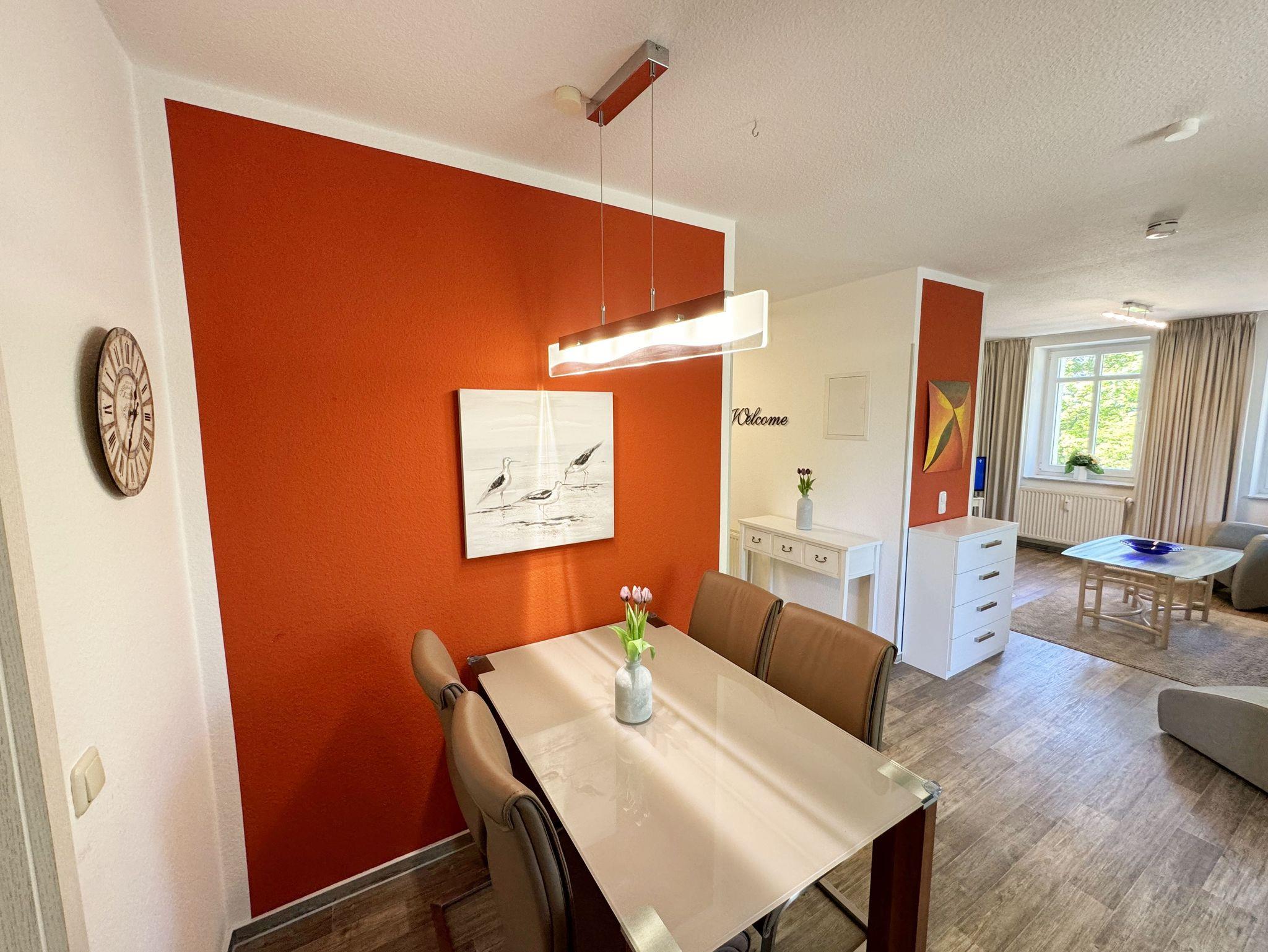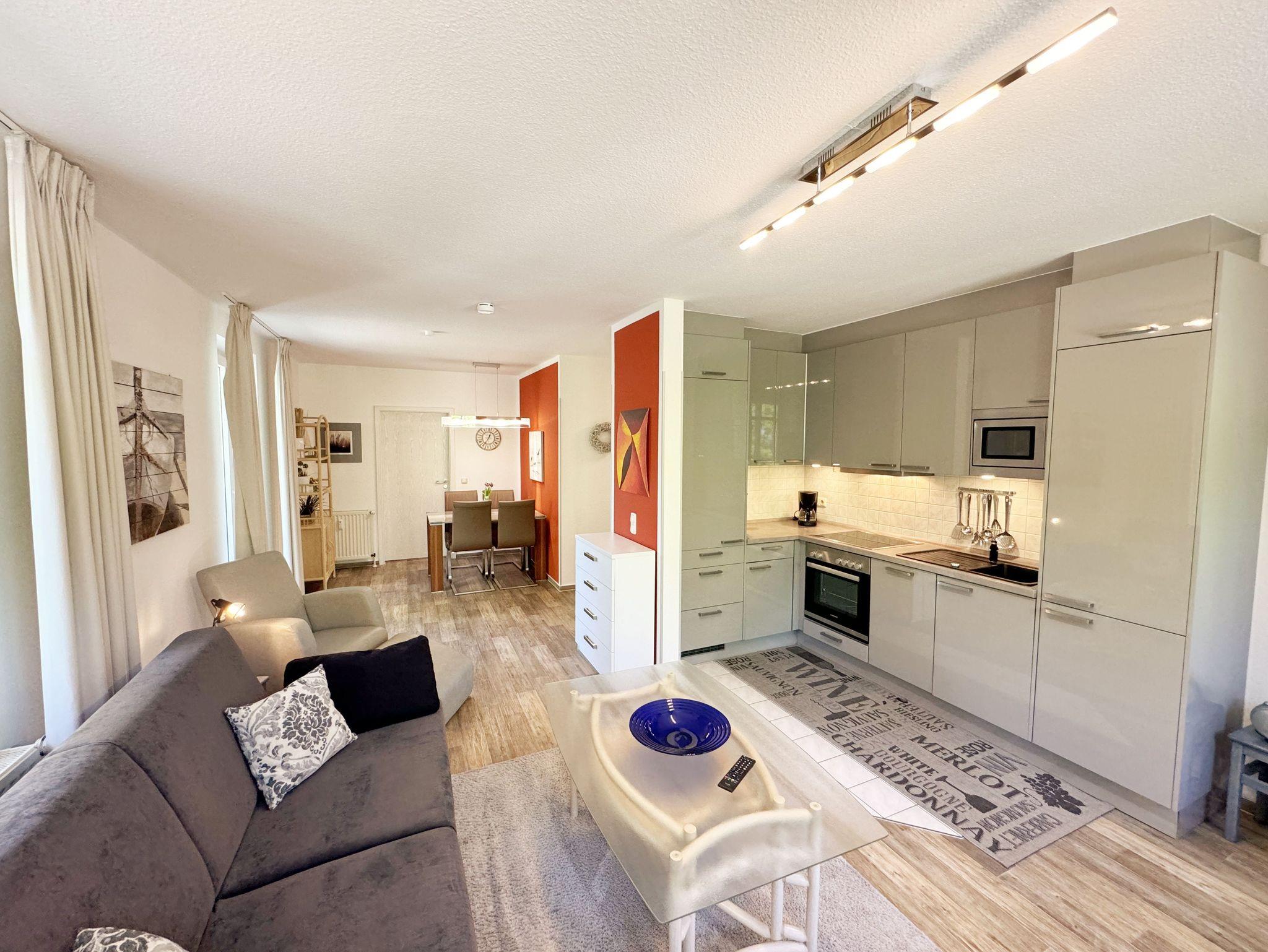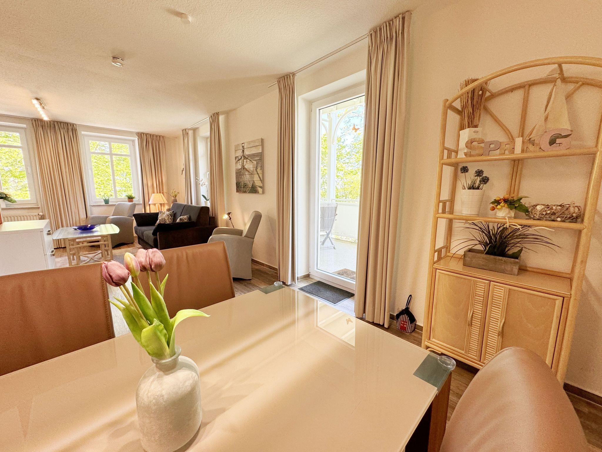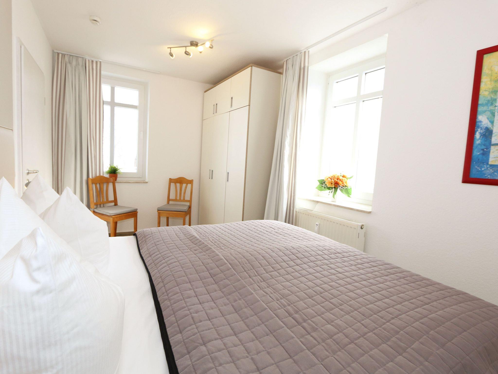 Die 2-Raumferienwohnung ist als Nichtraucher deklariert und befindet sich im 1. Obergeschoss des Hauses. Mit Ihren ca. 60 qm Wohnfläche bietet Sie ausreichend Platz für 2 - 4 Personen. Die Ferienwohnung ist komfortabel und geschmackvoll eingerichtet. Der Wohnbereich verfügt über eine Couchecke mit Ausziehfunktion (Aufbettung 3. und 4. Person, 1,80m x 2,00m), Couchtisch und Sideboard, Leselampe, mit Smart-TV, Radio + CD-Player. Die angrenzende Küchenzeile mit Esstisch ist komplett ausgestattet mit Geschirrspüler, Backofen mit 4-Zonen-Ceranfeld, Mikrowelle, Kühlschrank mit Eisfach, Kaffeemaschine, Toaster, Wasserkocher sowie diversen Küchenutensilien. Das Badezimmer umfasst eine Dusche, WC, Fön und Waschtisch. Das separate Schlafzimmer mit einem Doppelbett (0,90 x 1,80 m) mit Nachtischkonsolen und geräumigen Kleiderschrank rundet die Ferienwohnung ab. Zu den Highlights der Wohnung gehören der große überdachte Balkon und der traumhafte Blick auf die Steilküste und das Meer (im Sommer eingeschränkt durch die Blätter des alten Baumbestandes am Hang). Auch in Ihrem Urlaub brauchen Sie auf einen Internetzugang (WLAN) nicht verzichten, dieser ist vorhanden und inklusive. Ein PKW-Stellplatz ist direkt vor dem Haus. Ihre mitgebrachten oder auch vor Ort geliehenen Fahrräder können Sie im Abstellraum unterstellen. Haustiere sind in der Wohnung nicht erlaubt. Die Erstausstattung eines Wäschepaketes (komplette Bettwäsche, 1 Duschhandtuch, 1 kleines Handtuch) können Sie bis 14 Tage vor Anreise gegen einen Aufpreis dazu buchen oder durch eigene ergänzen. Ab 2 gebuchten Paketen erhalten Sie einmalig 1 Geschirrhandtuch und 1 Duschvorleger hinzu.
