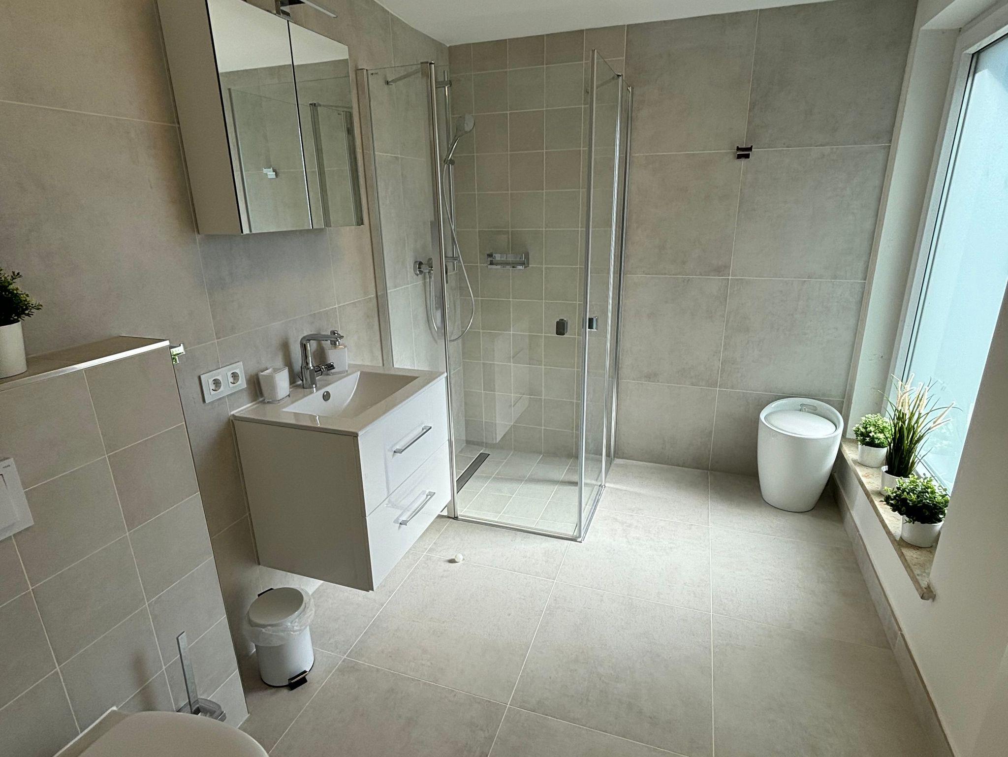 Geräumiges Badezimmer mit ebenerdiger Dusche und WC