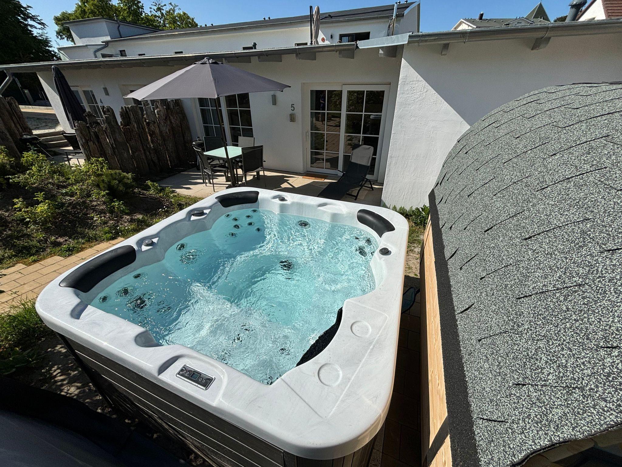 Südterrasse mit Sitzmöbeln, Grill und eigenem Whirlpool