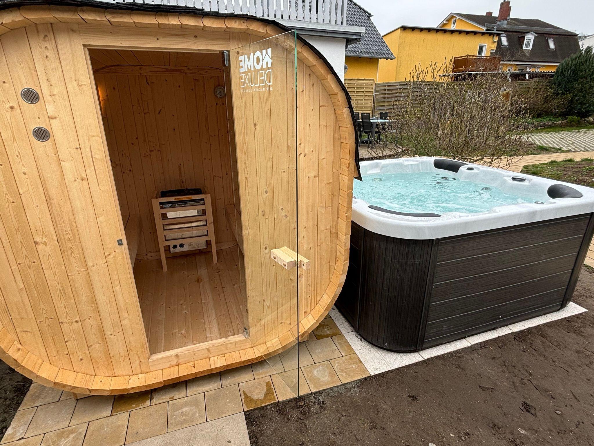 Die Ferienwohnung verfügt über eine eigene Südterrasse und einen Grill. Zur alleinugen Nutzung steht eine Fasssauna und ein Whirlpool zur Verfügung.