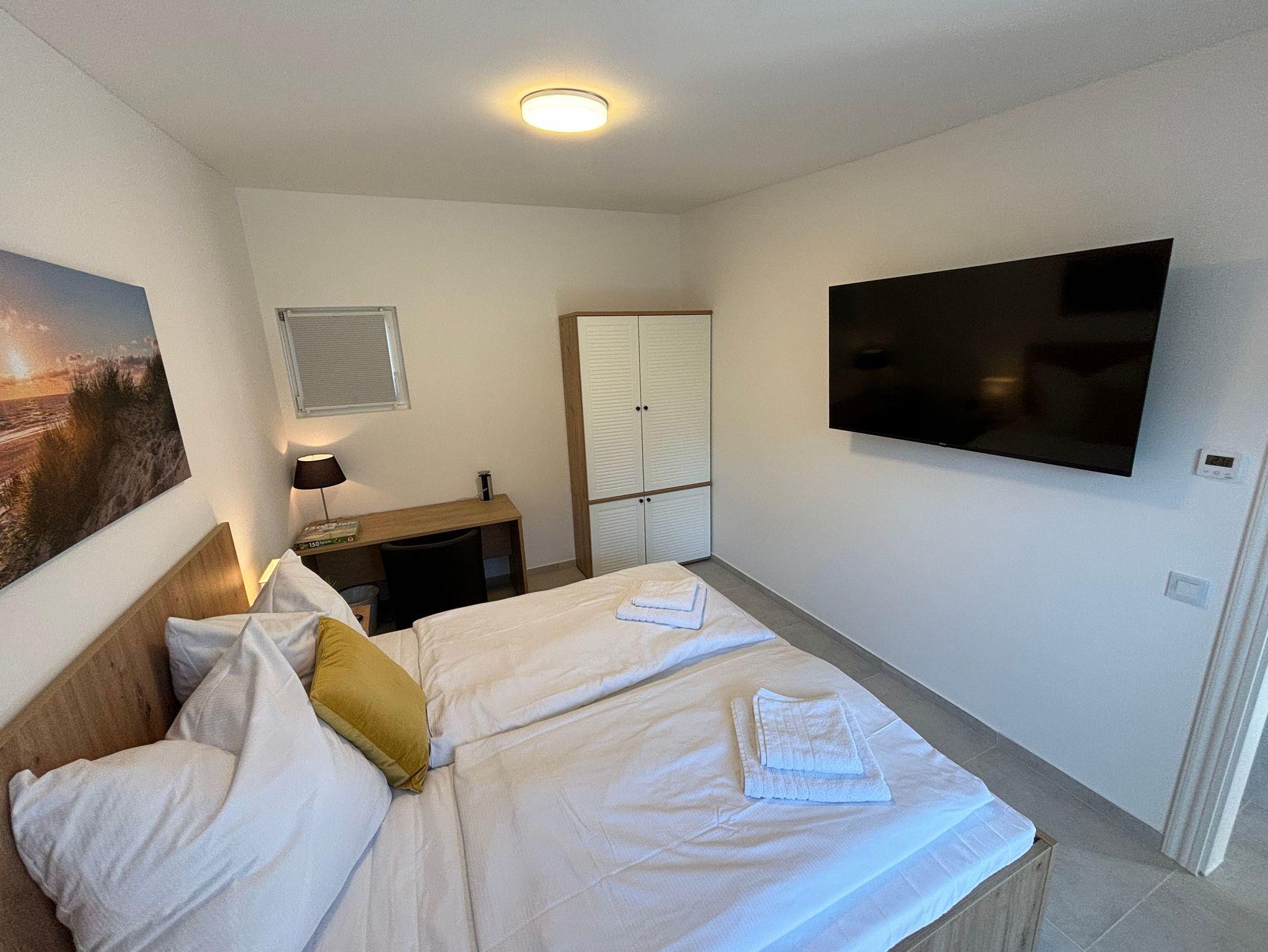 Schlafzimmer mit Doppelbett, TV