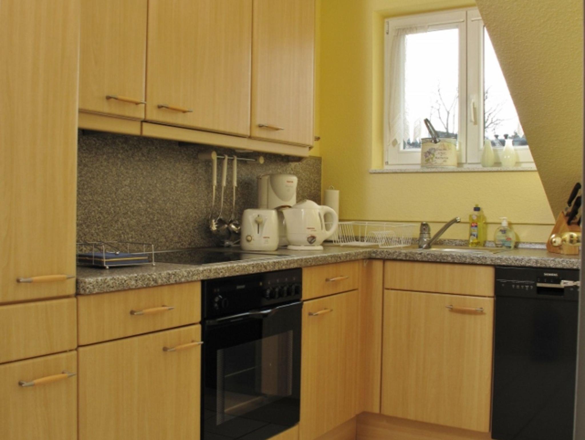 * die separate Küche, komplett ausgestattet (4 Platten-Cerankochfeld, Backofen, Mikrowelle, Kühlschrank mit 3*TK-Fach, Geschirrspüler, Wasserkocher, Kaffeemaschine, Toaster) mit vielen liebevollen Details versehen. Hier erwartet Sie nach der langen Reise eine Erfrischung.