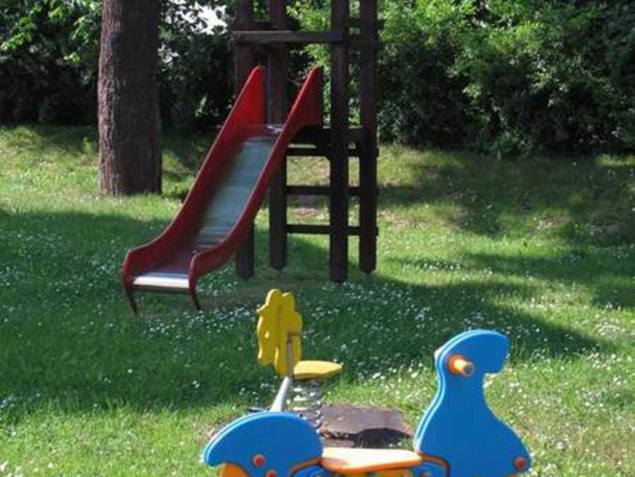 Die Villa ist umgeben von einem Rosen-Lavendel-Gärtchen und einer Rasenfläche mit alten Bäumen und Spielgeräten.