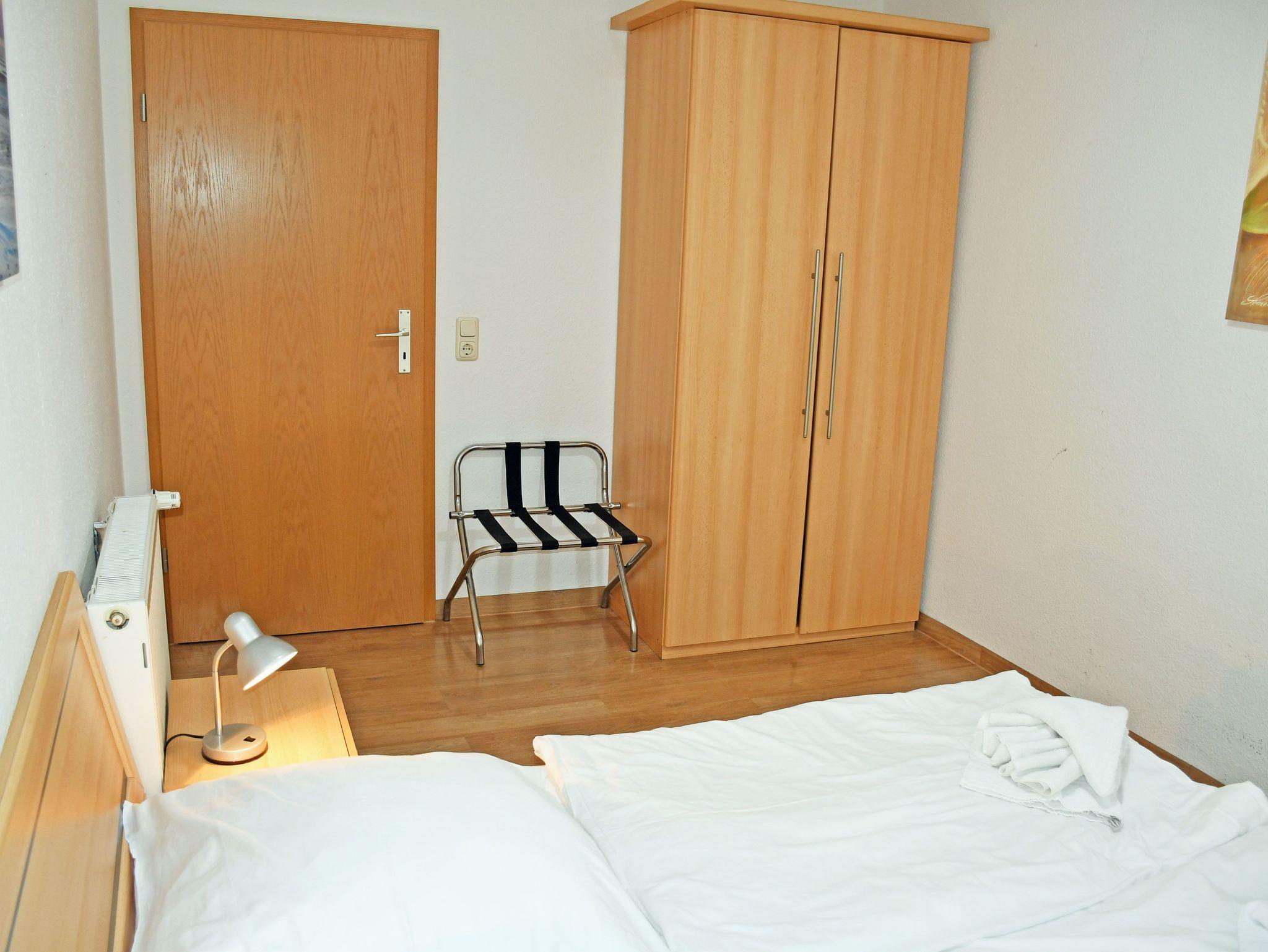 Schlafzimmer mit einem Doppelbett (180 x 200 cm) und großem Kleiderschrank
