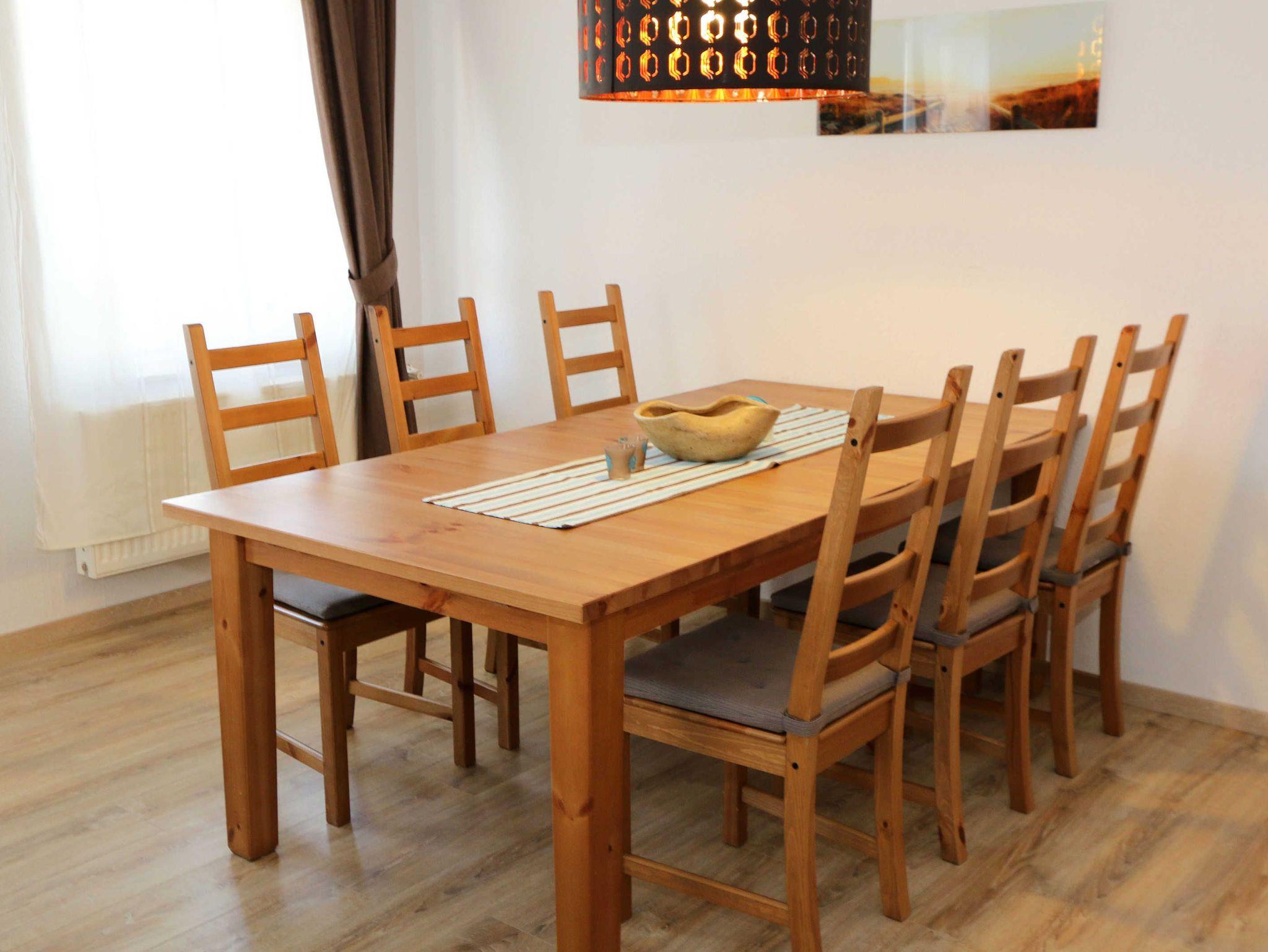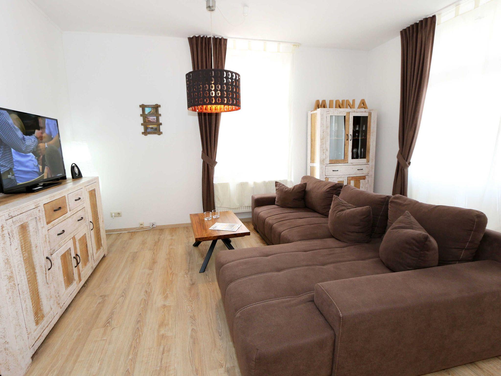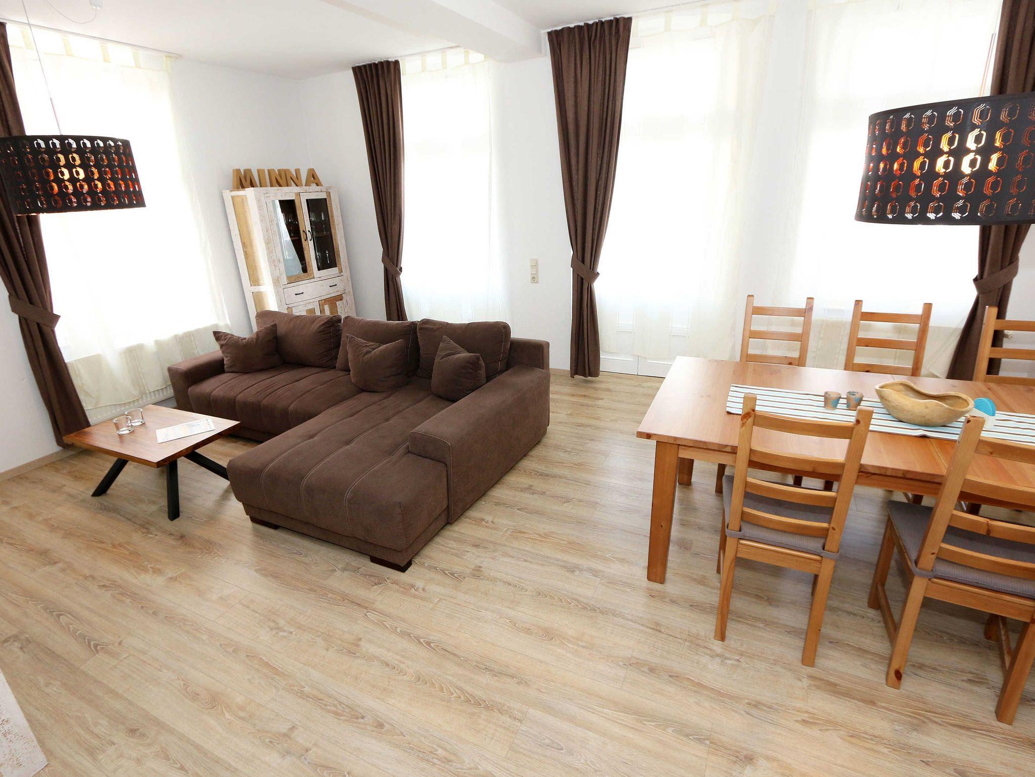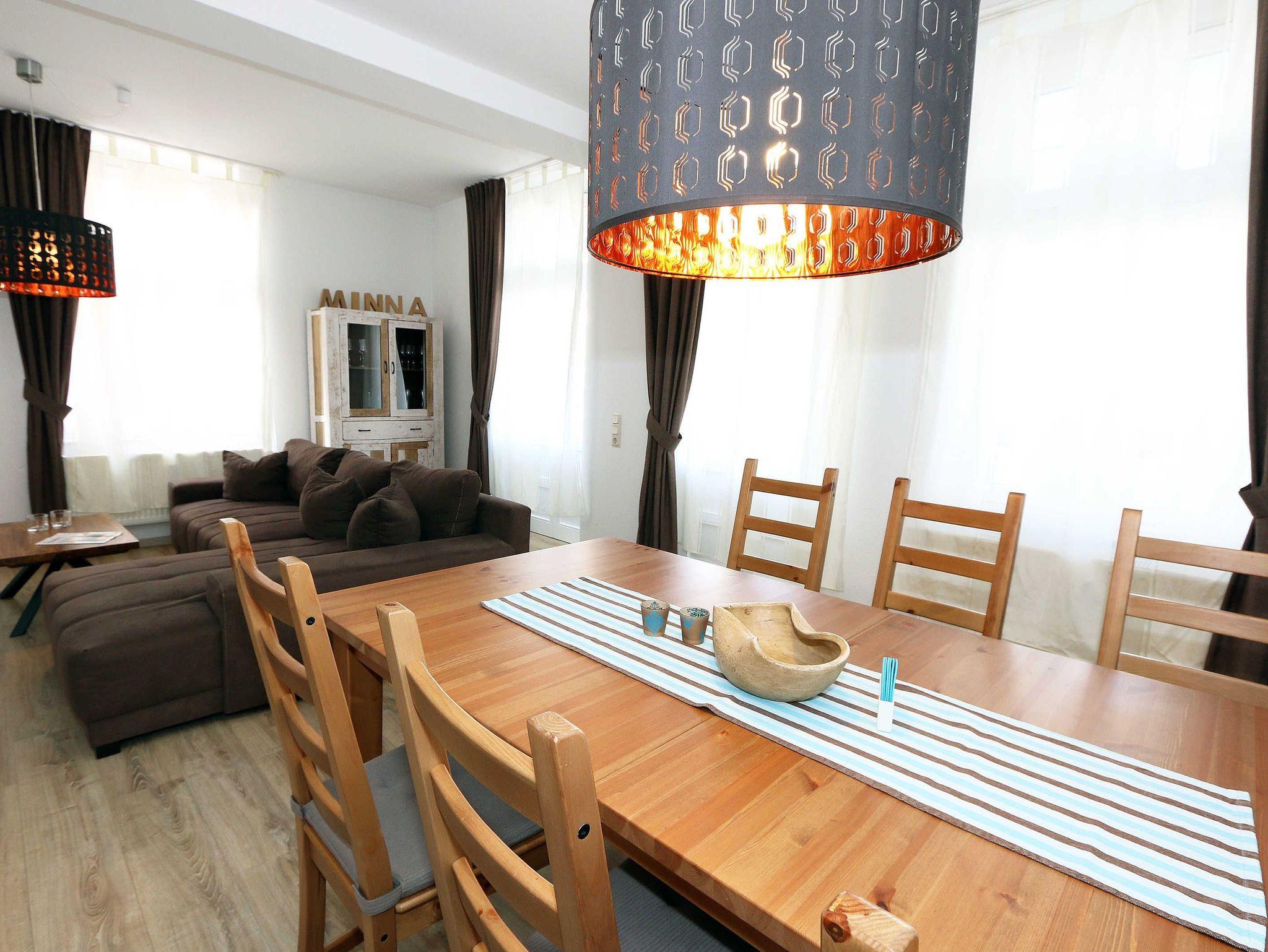 Fühlen Sie sich wie zu Hause in der Villa Minna! Die Nichtraucher-Ferienwohnung ist mit viel Liebe zum Detail eingerichtet worden. Sie wohnen in einer großzügigen 3-Zimmer-Wohnung mit einer Größe von ca. 88 qm. Die Wohnung ?Meine Minna? befindet sich im Hochparterre der denkmalgeschützten Villa und bietet für 2 bis 6 Personen Platz. Die Wohnräume sind Allergiker Freundlich mit Laminat ausgelegt, Bad und Küche sind hell gefliest. Die separate Küche ist mit einer kompletten Einbauküche ausgestattet. Neben einem Herd mit Ceranfeld, Geschirrspüler, Kühlschrank mit Gefrierfach und einer Mikrowelle finden Sie eine Kaffeemaschine, Senseo Padmaschine, Toaster und Wasserkocher sowie alle anderen Dinge, die Sie zum Kochen benötigen. Im Wohnzimmer mit der gemütlichen Couch, die ausgezogen 2 Schlafplätze für die 5. und 6. Person bietet (1,30m x 2,00m), finden Sie vor den großen lichtgebenden Balkonfenstern den großzügigen Essbereich für 6 Personen. Das Wohnzimmer bietet neben einem großen Smart-TV (43 Zoll, Kabelfernsehen) auch eine Heimkinoanlage mit Bluetooth-Funktion, auf der Sie auch Ihre DVDs und Blu-Ray-Discs abspielen können. Auch auf einen Internetanschluss müssen Sie nicht verzichten. Dieser steht Ihnen für die Dauer Ihres Aufenthaltes über WLAN kostenlos zur Verfügung! Der große Balkon (Ost) mit einer Fläche von ca. 15 qm schließt sich an das Wohnzimmer an und lädt zum Verweilen bei einem Glas Wein ein. Das 1. Schlafzimmer ist mit einem Doppelbett (1,80 m x 2,00 m), verstellbaren Lattenrosten, Nachttischablagen Kleiderschrank und einem weiteren LCD-Fernseher ausgestattet. Das 2. Schlafzimmer hat zwei Einzelbetten (0,90 m x 2,00 m), Nachttischablagen sowie einen weiteren Kleiderschrank. Für unsere kleinen Gäste stehen kostenlos 1x Hochstuhl und 1x Kinderreisebett (ohne Bett Inlett und ohne Matratze) zur Verfügung. Für den guten Schlaf sorgen Verdunklungsrollos. Das hell geflieste Bad verfügt neben einer Badewanne auch über eine separate Dusche, Fön, einem Waschtisch mit Spiegelschrank sowie einem WC. Eine Gemeinschaftswaschmaschine und Trockner können Sie im Keller des Hauses gegen eine Extragebühr nutzen. Ihr PKW-Stellplatz (Nr. 3) können Sie auf dem Hof der Villa Minna abstellen. Ihre Fahrräder stellen Sie bequem im Keller des Hauses ab, um von hier Ihre Unternehmungen auf 2 Rädern zu starten. Die Erstausstattung eines Wäschepaketes (komplette Bettwäsche, 1 Duschhandtuch, 2 kleine Handtücher) können Sie bis 14 Tage vor Anreise gegen einen Aufpreis dazu buchen oder durch eigene ergänzen. Ab 2 gebuchten Paketen erhalten Sie einmalig 1 Geschirrhandtuch und 1 Duschvorleger dazu. Bitte lassen Sie Ihre Haustiere zu Hause, diese sind aus hygienischen Gründen nicht erlaubt.