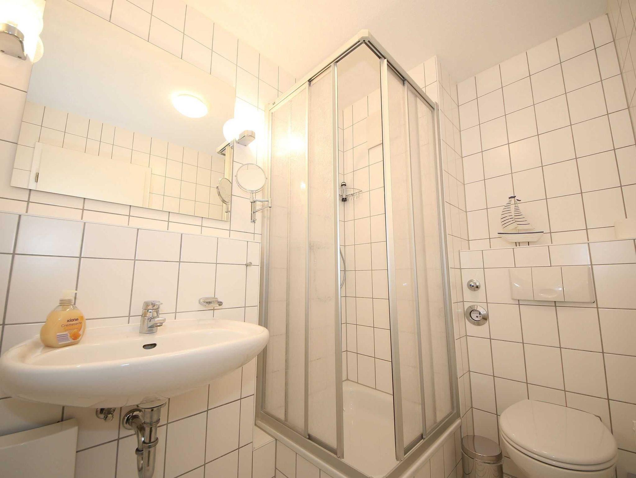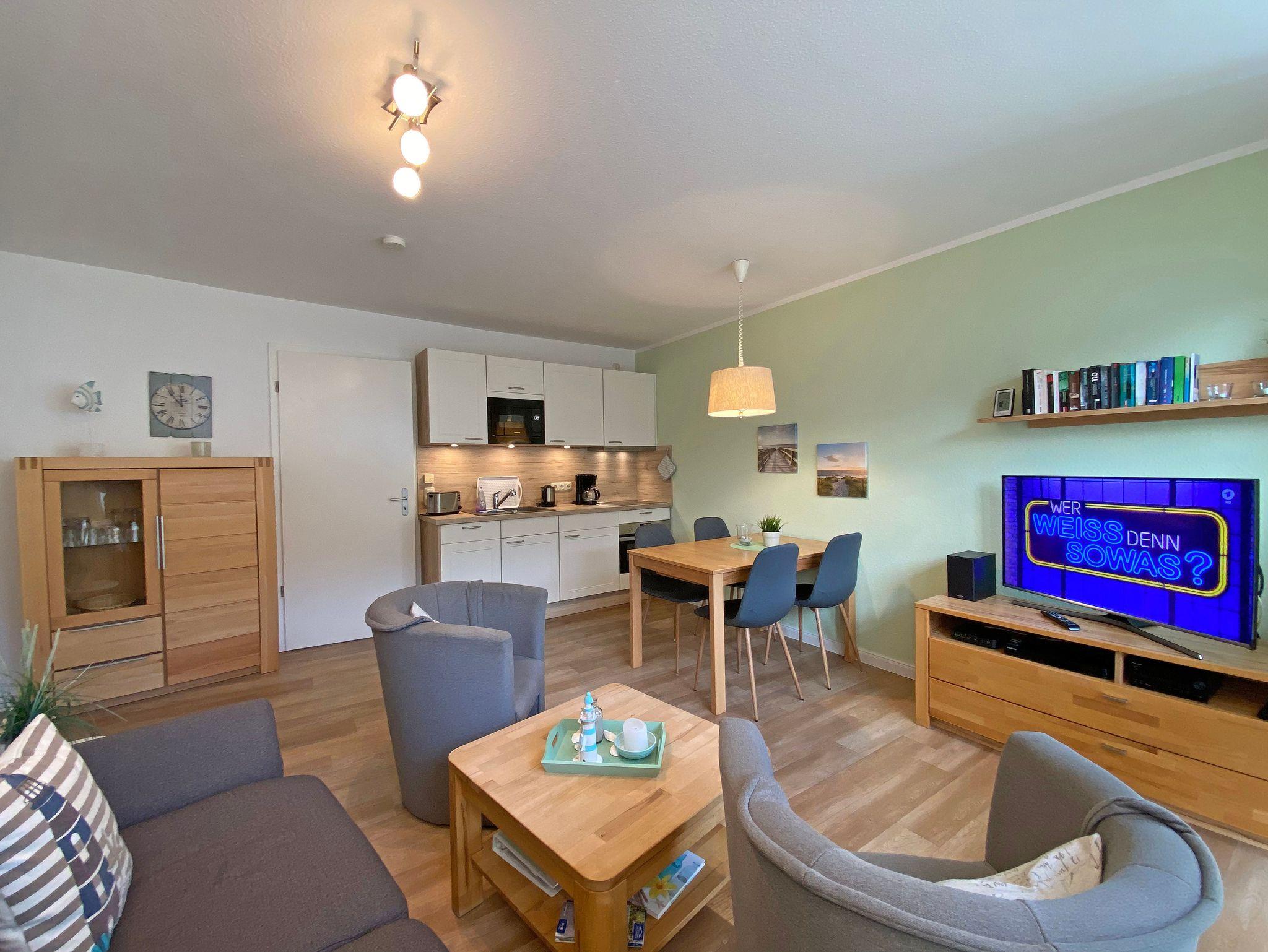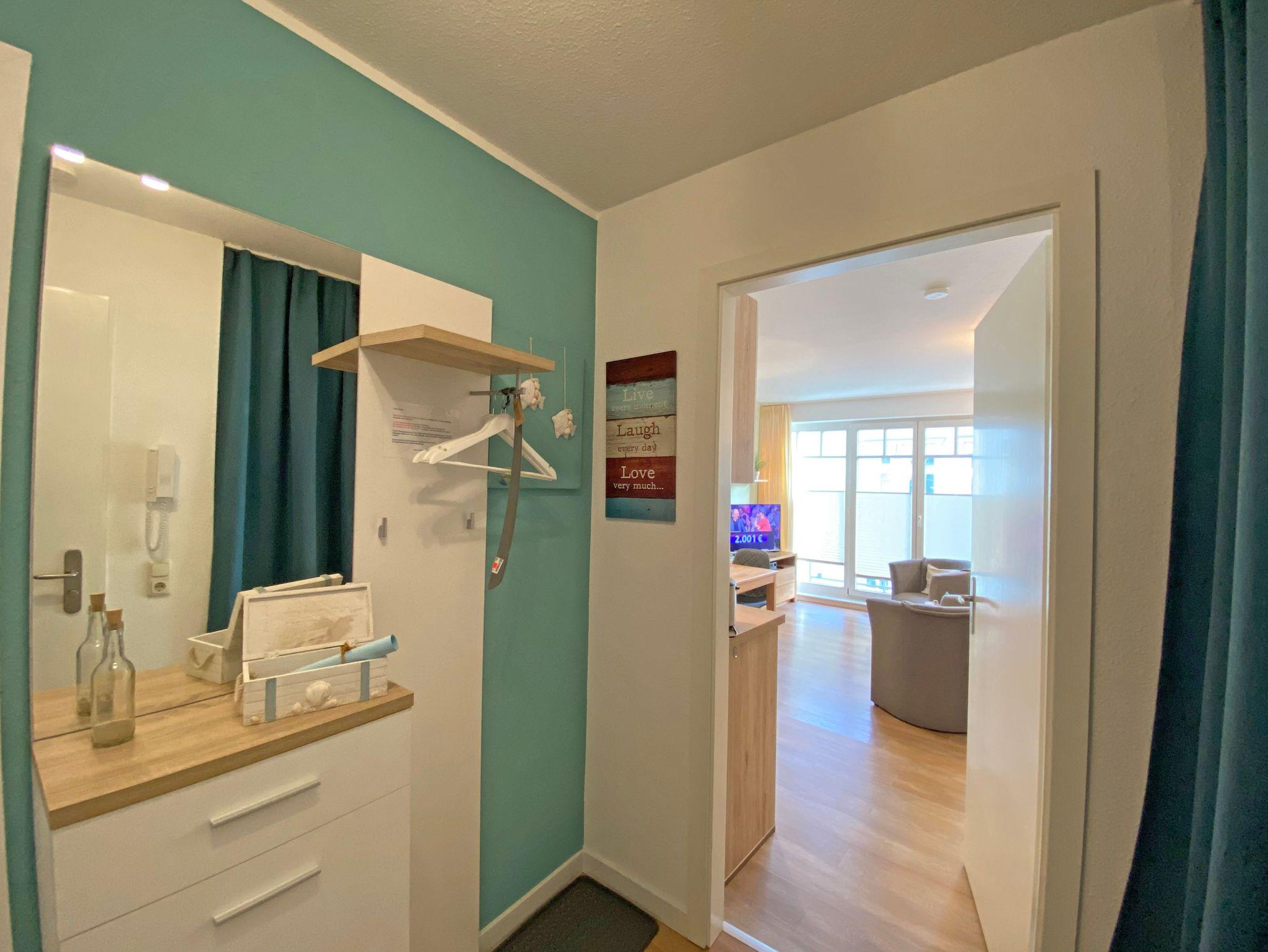 Die gemütliche 2-Raumwohnung (Nichtraucher) befindet sich in der 1. Etage der Appartementanlage Villa Granitz. Die Wohnfläche beträgt ca. 45m², die mit 2 -4 Personen genutzt werden kann. Der Wohnbereich mit offener Küchenzeile wird durch eine hochwertige Schlafcouch (Faltbett, Maße 1,30m x 2,00m, Aufbettungsmöglichkeit für 3./4. Person) mit Couchtisch, Sideboard mit LCD-TV (40 Zoll), Blu-Ray-Player und einer Stereoanlage abgerundet. Der gemütliche Essplatz mit 4 Stühlen passt sich dem Wohnbereich an. Die Küchenzeile ist mit einem 4-Zonen Ceranfeld, Mikrowelle, Kompaktbackofen, Geschirrspüler, Kühlschrank mit Gefrierfach, Spüle, Kaffeemaschine, Toaster, Wasserkocher, Eierkocher und diversen Küchenutensilien ausgestattet. Vom Wohnzimmer aus erreichen Sie den überdachten und bestuhlten Balkon. Im Schlafzimmer befindet sich ein Doppelbett (1,80 x 2,00m, mit getrennten Matratzen), ein Kleiderschrank, Ablageflächen sowie Verdunklungsmöglichkeiten. Ein Kinderreisebett kann hier aufgestellt werden. Das Schlafzimmer bietet zusätzlich einen Zugang zu einem schmalen Balkon, wo Sie mit einem seitlichen Meerblick die Abendsonne genießen können. Das hell geflieste Bad mit einem Waschbecken, Dusche, WC, Ablageflächen, Kosmetikspiegel und Fön runden den Sanitärbereich ab. Der Dielenbereich ist mit einer Garderobe versehen. Alle Räumlichkeiten sind mit einer Fußbodenheizung versehen. Für unsere kleinen Gäste stehen 1x Kinderreisebett mit Matratze (ohne Bett Inlett) und 1x Hochstuhl inklusive zur Verfügung. Ein Internetzugang (WLAN) ist für Sie inklusive. Haustiere sind in der Wohnung nicht erlaubt. In der Tiefgarage befindet sich ein inklusiver PKW-Stellplatz, der zur Wohnung gehört. Im Nebengebäude können Sie eine Waschmaschine und einen Trockner gegen eine Extragebühr nutzen. Ein Fahrradkeller steht Ihnen für Ihre mitgebrachten sowie geliehenen Fahrräder zur Verfügung. Die Erstausstattung eines Wäschepaketes (komplette Bettwäsche, 1 Duschhandtuch, 1 kleines Handtuch) können Sie bis 14 Tage vor Anreise gegen einen Aufpreis dazu buchen oder durch eigene ergänzen. Ab 2 gebuchten Paketen erhalten Sie einmalig 1 Geschirrhandtuch und 1 Duschvorleger hinzu.