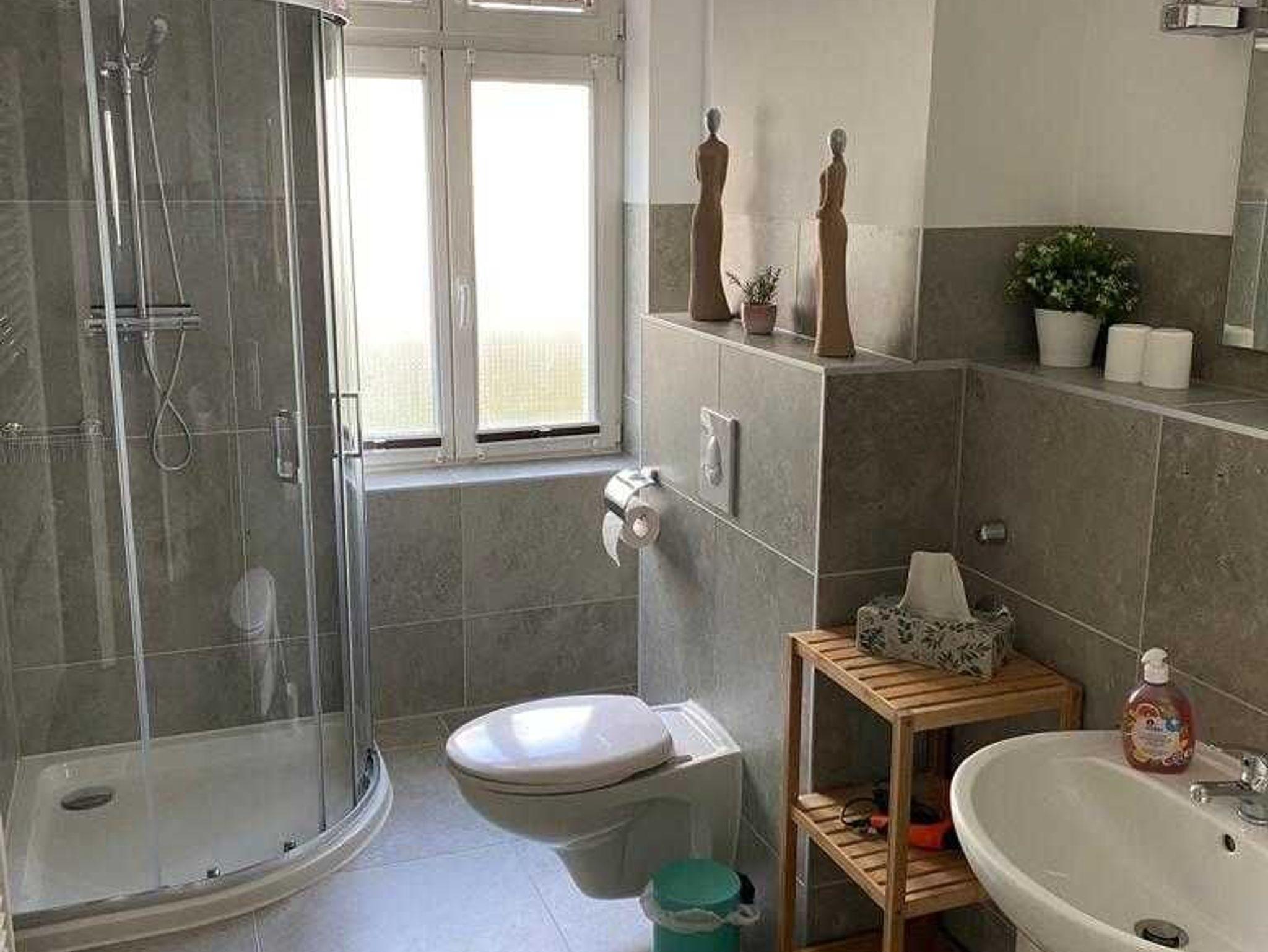 * im Jahr 2021 modernisiertes Badezimmer mit Dusche, Waschtisch, WC und Fön
