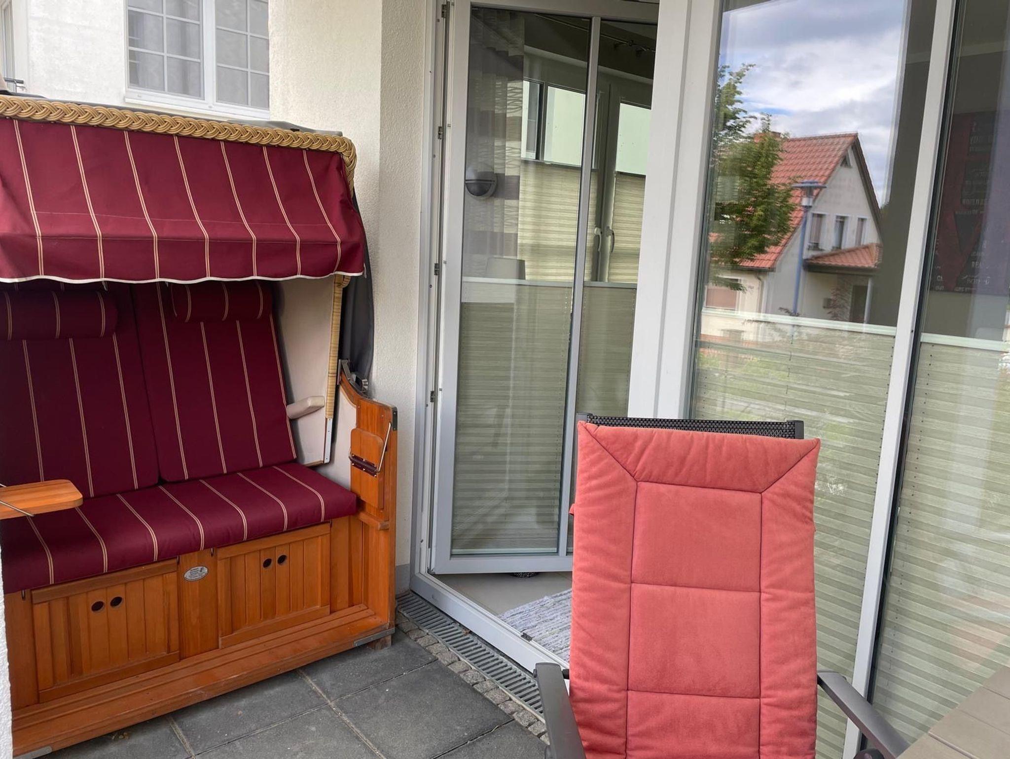 • möblierte Wohnzimmerterrasse mit Strandkorb und Sitzecke