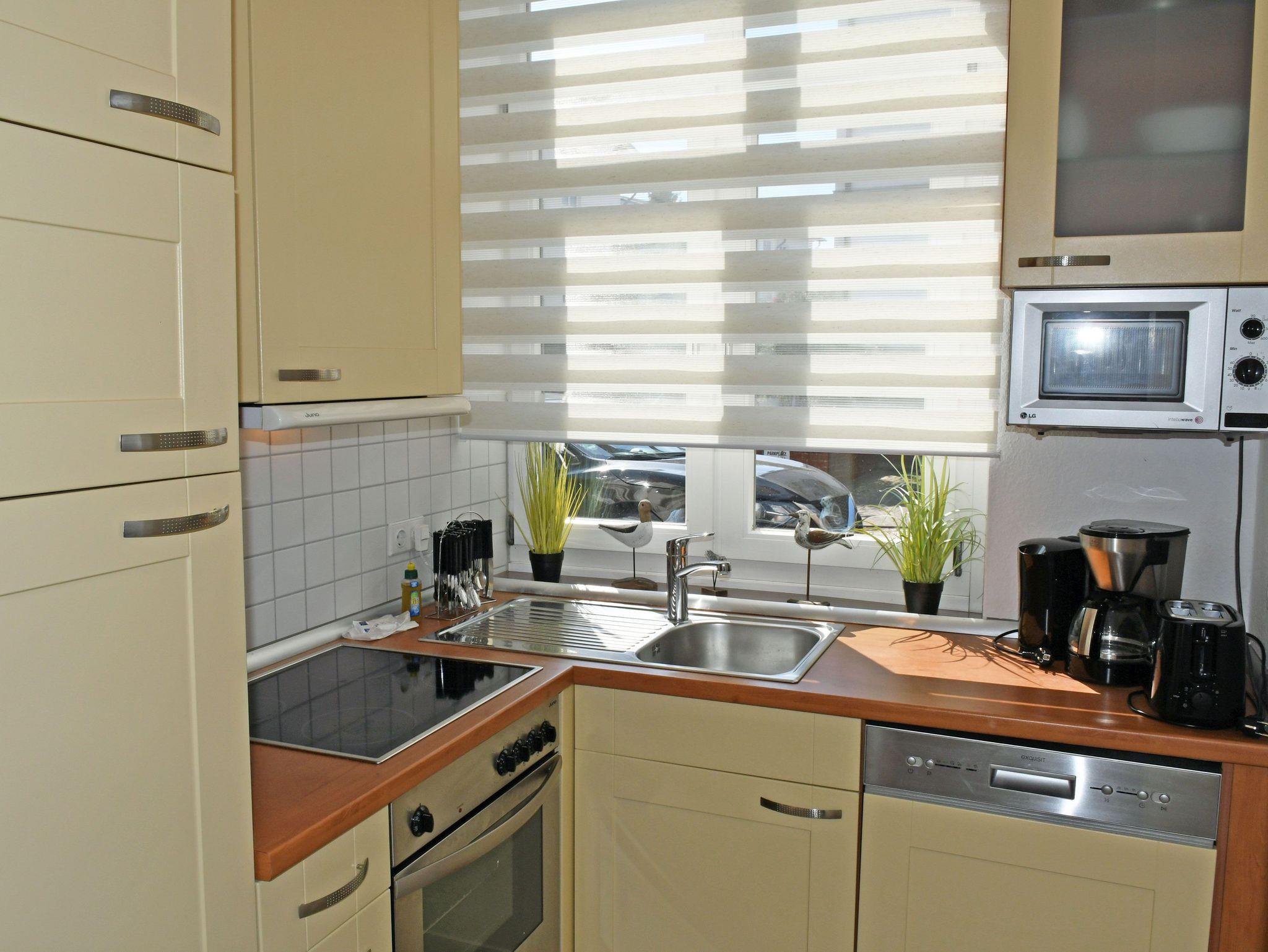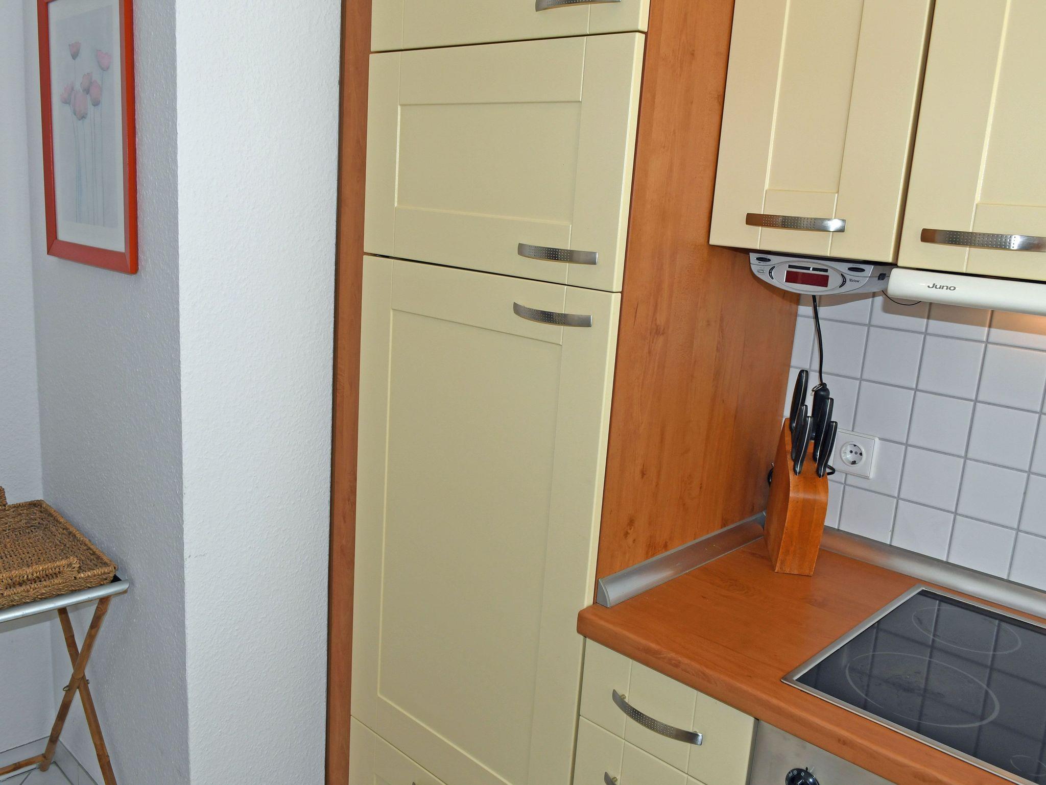 * Vom Wohnbereich abgegrenzte Einbauküche, ausgestattet mit 4-Platten-Ceran-Kochfeld und Backofen, Dunstabzugshaube, großer Kühlschrank mit Gefrierfach, Spüle, Spülmaschine, Toaster, Kaffeemaschine, Wasserkocher, Eierkocher, Mixer und diversen Küchenutensilien
