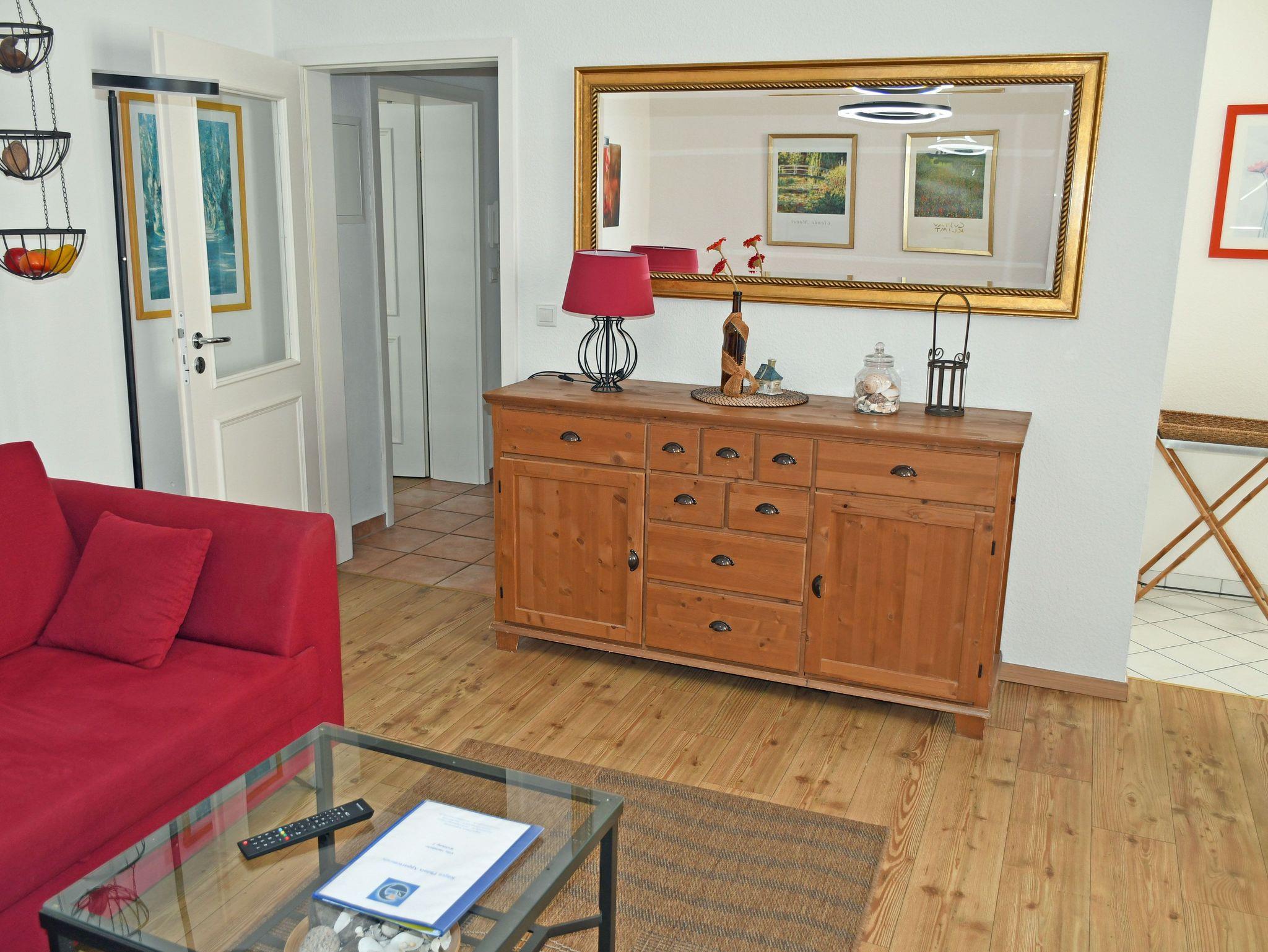 * Wohnzimmer mit ausziehbarer Schlafcouch für zwei Personen, 1 kleiner Couchtisch, Anrichte, TV-Schrank mit Fernseher, DVD-Player und Radio/CD-Anlage, 1 Esstisch mit 4 Stühlen