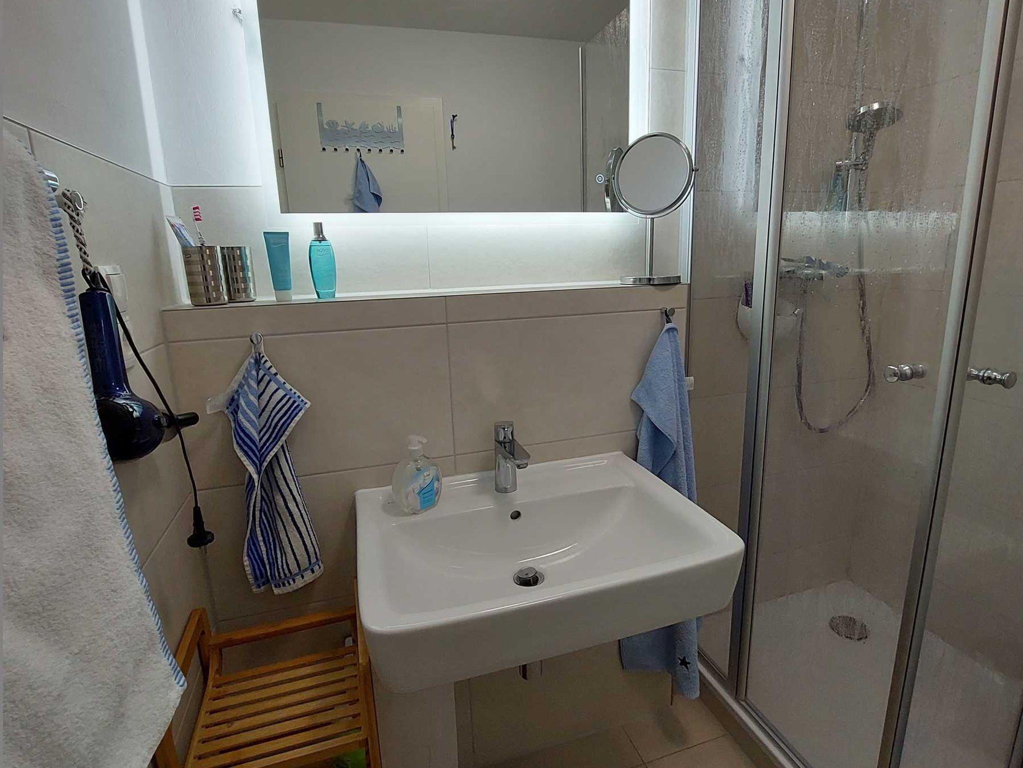 Das hell geflieste Bad ist zweckmäßig mit Dusche und WC, Waschbecken und Ablagen ausgestattet. Es wurde im Jahr 2022 renoviert.