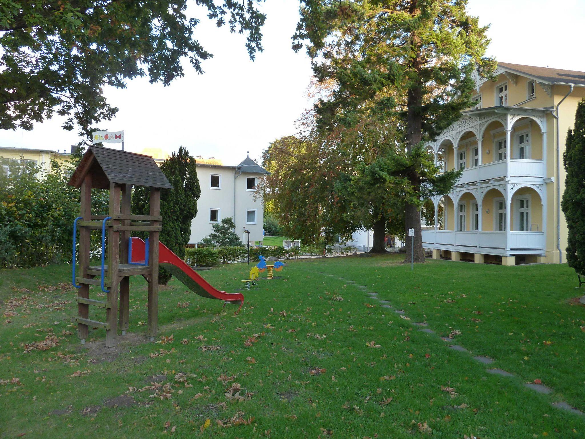 Für Kinder steht eine große Rasenfläche mit Spielgeräten zur Verfügung.