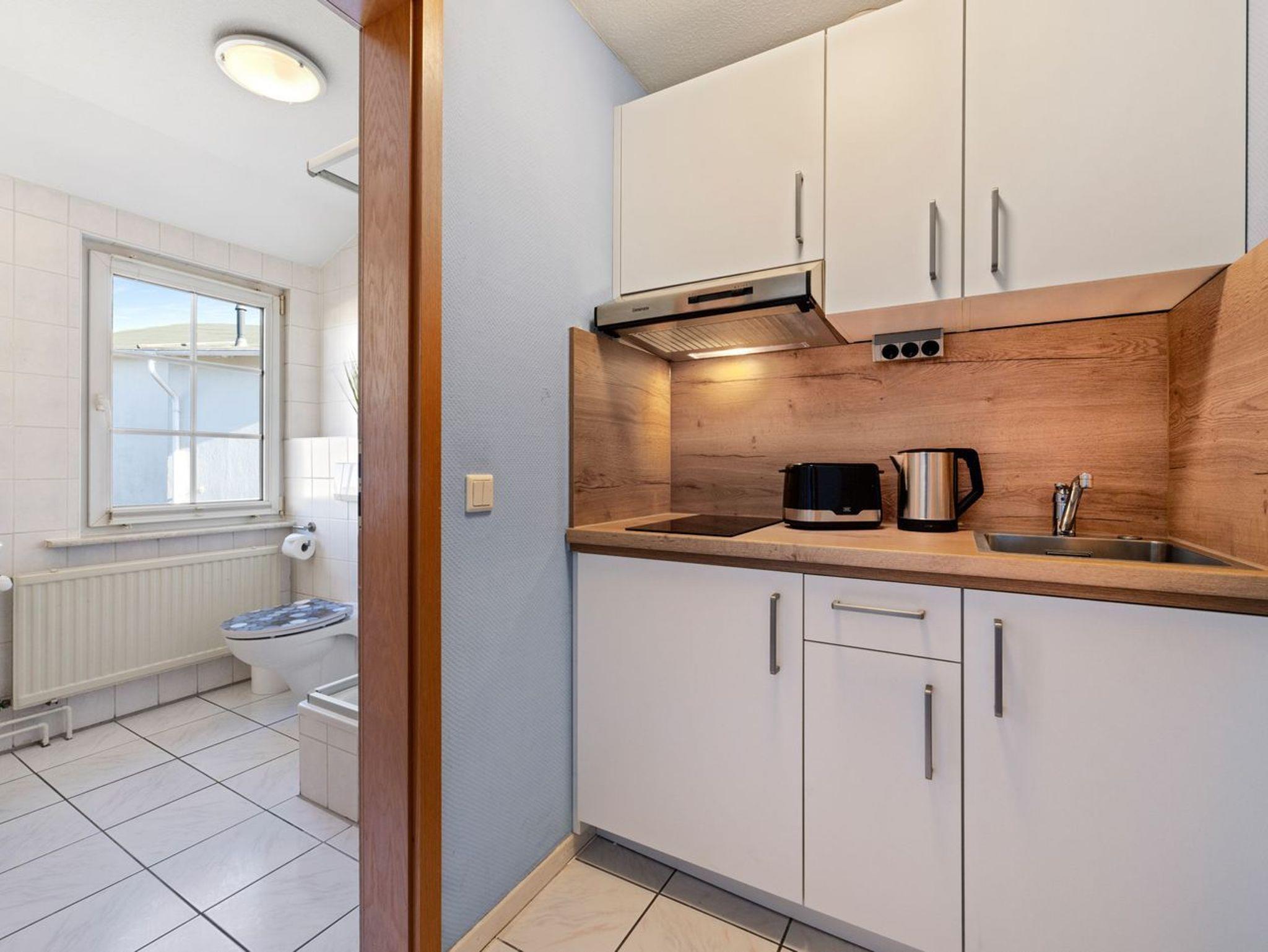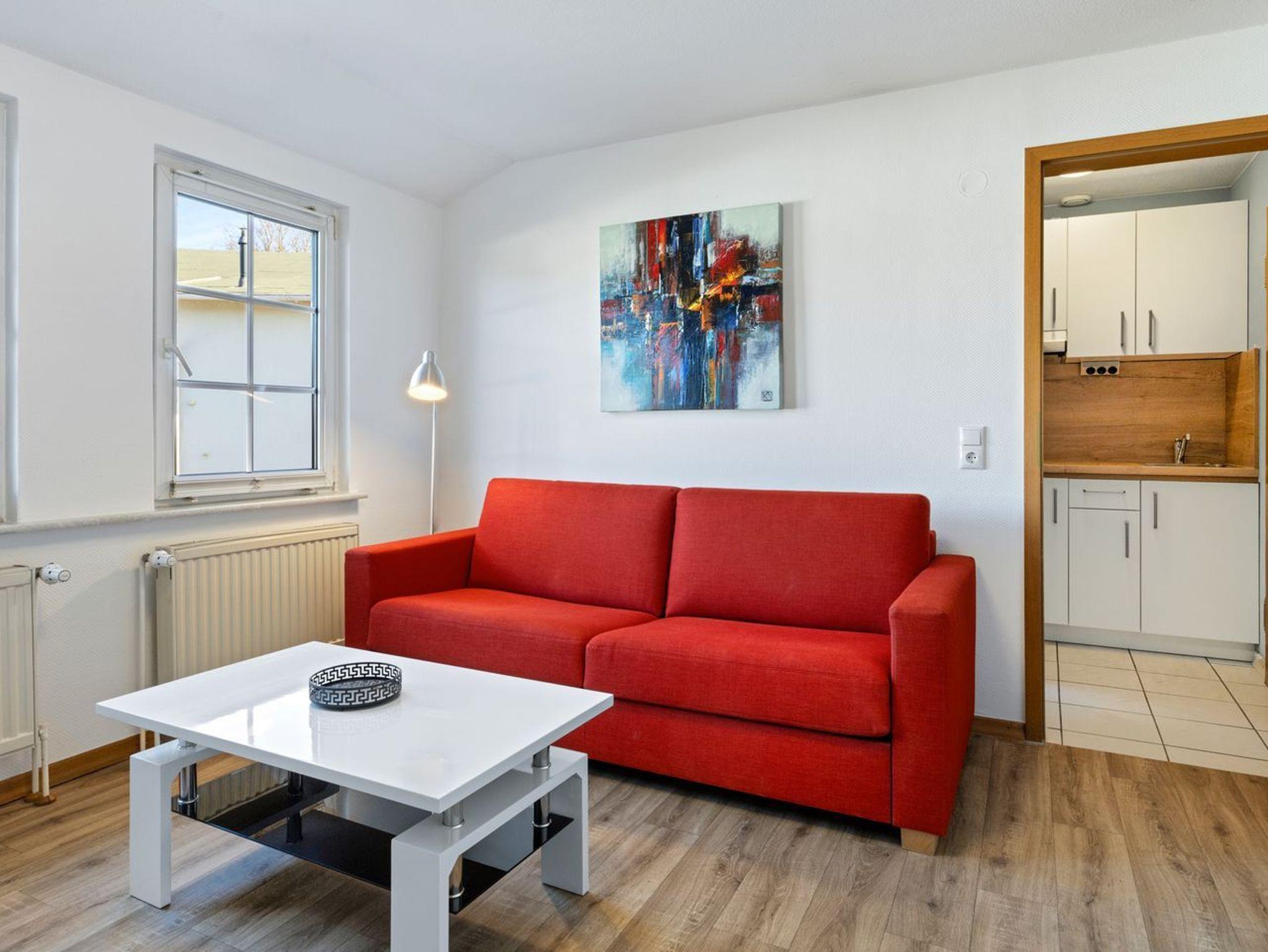 Der Wohnbereich ist offen gestaltet und mit einer zum Wohnzimmer offenen Küche verbunden. Ein Esstisch, eine Sofaecke, TV mit digitalem Anschluss sowie WLAN sorgen für Komfort im Alltag. Die Küche ist funktional ausgestattet und verfügt über einen 2-Platten-Herd, Kühlschrank mit Gefrierfach im Kühlschrank, Mikrowelle, Kaffeemaschine, Toaster, Wasserkocher, Küchenutensilien sowie Geschirr und Besteck. So können Sie sich unkompliziert selbst versorgen.
