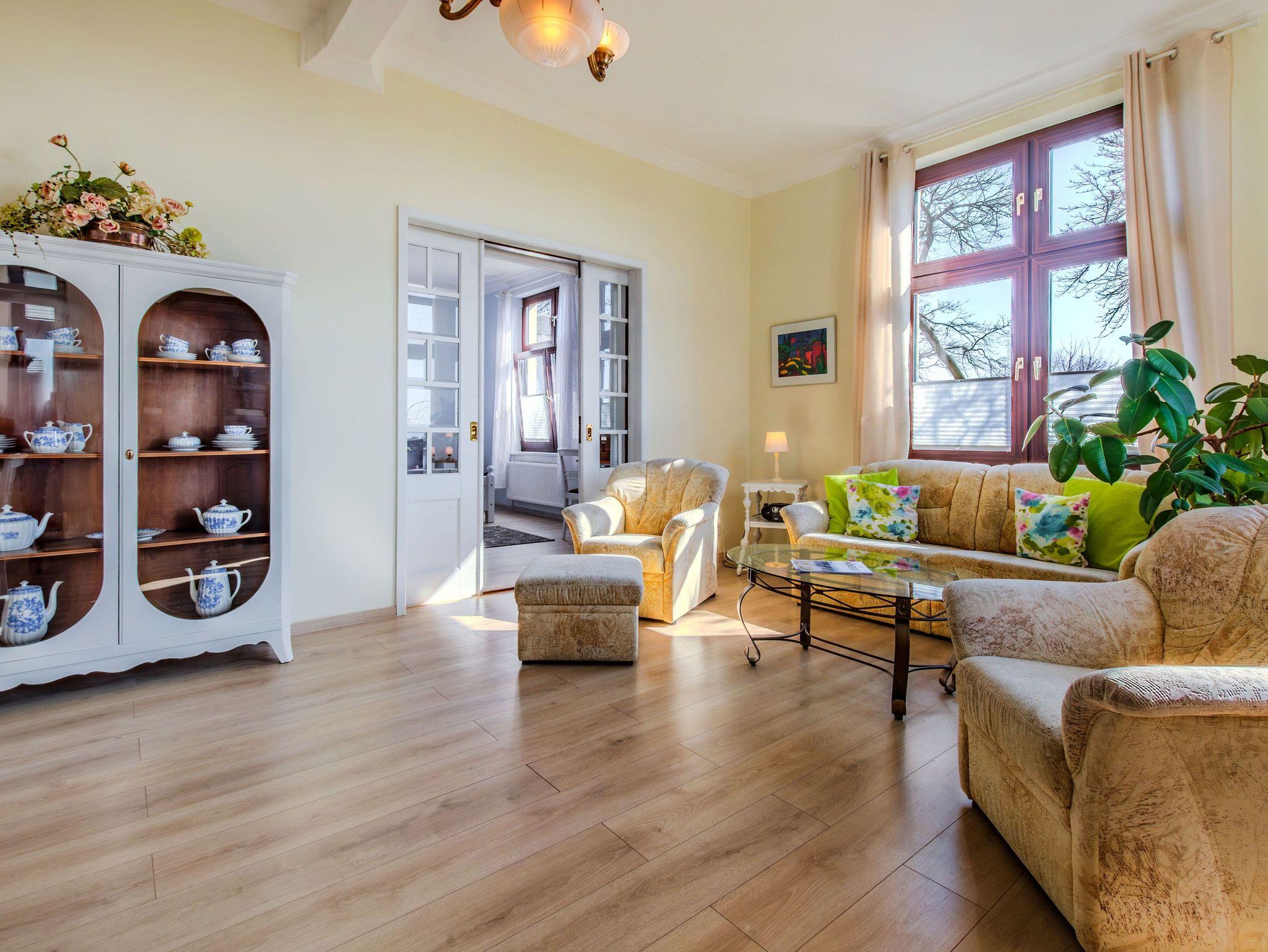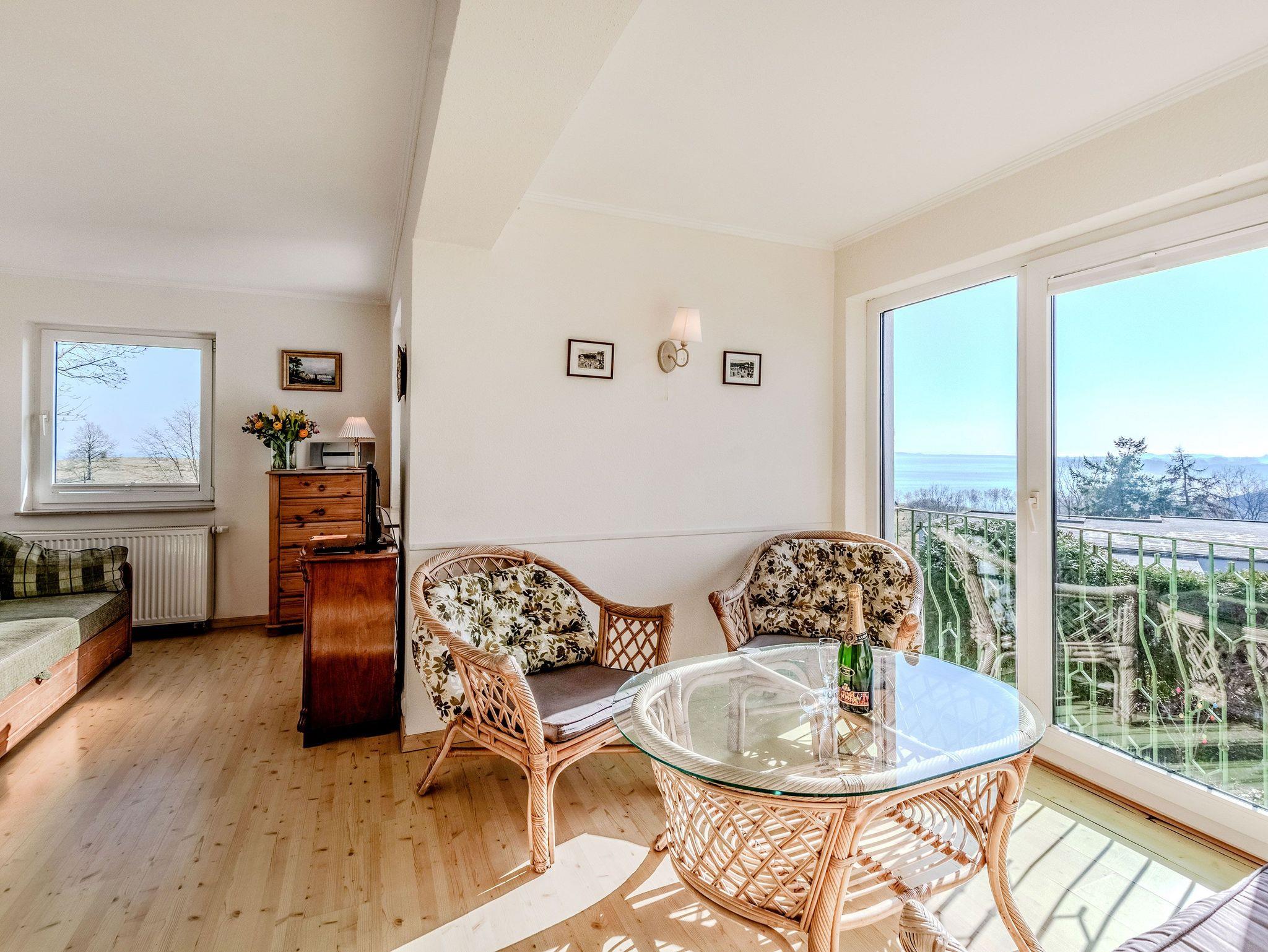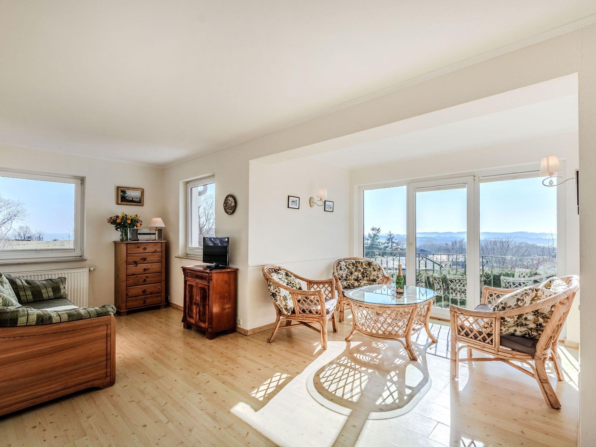 Die Ferienwohnung 1 ist hell und großzügig geschnitten, mit tollem Meeresblick und Terrasse. Eine sehr geräumige und stilvolle Wohnung mit großem Wohnzimmer und gemütlicher Sitzgruppe im Verandazimmer mit Blick auf die Ostsee.