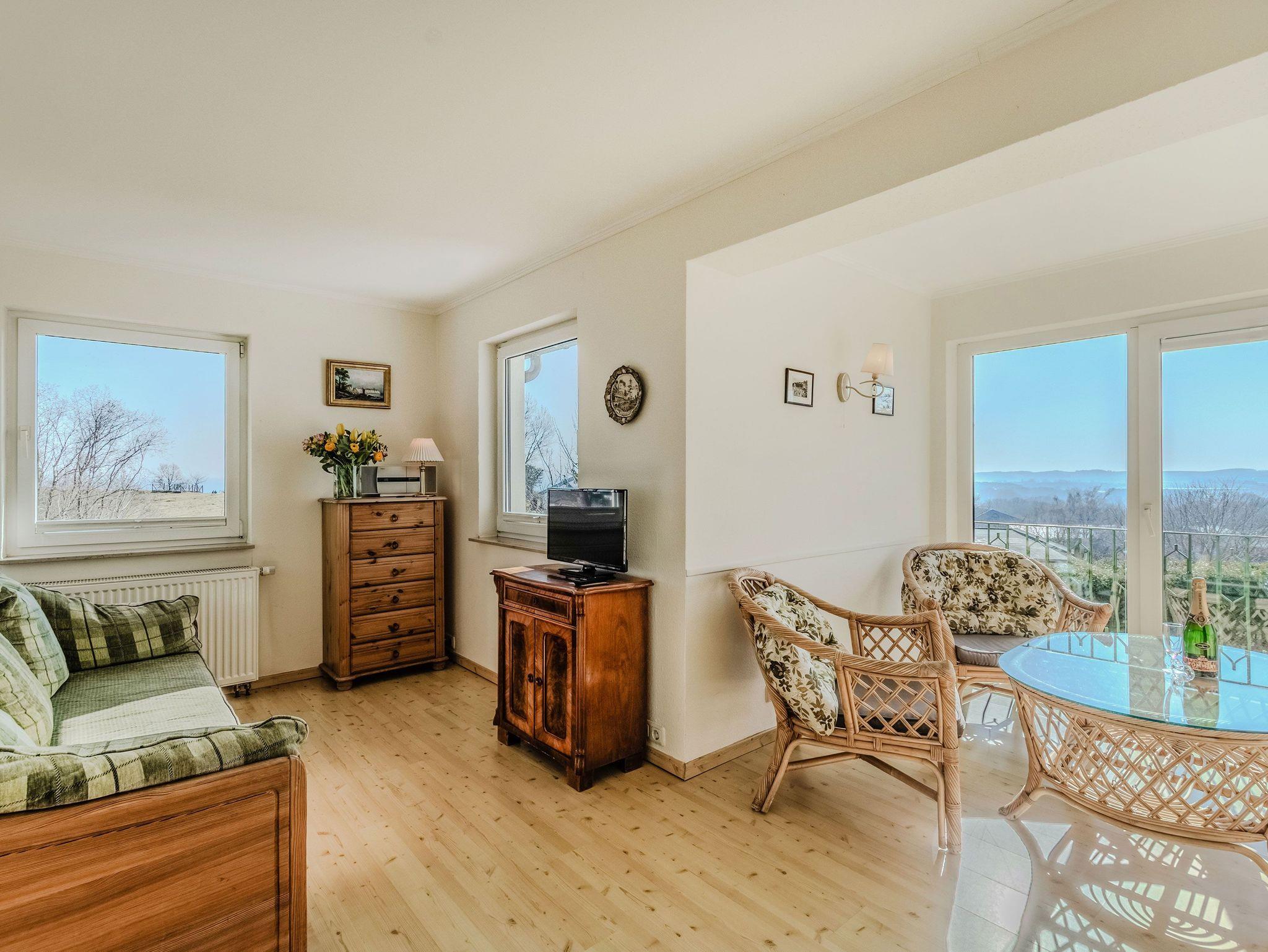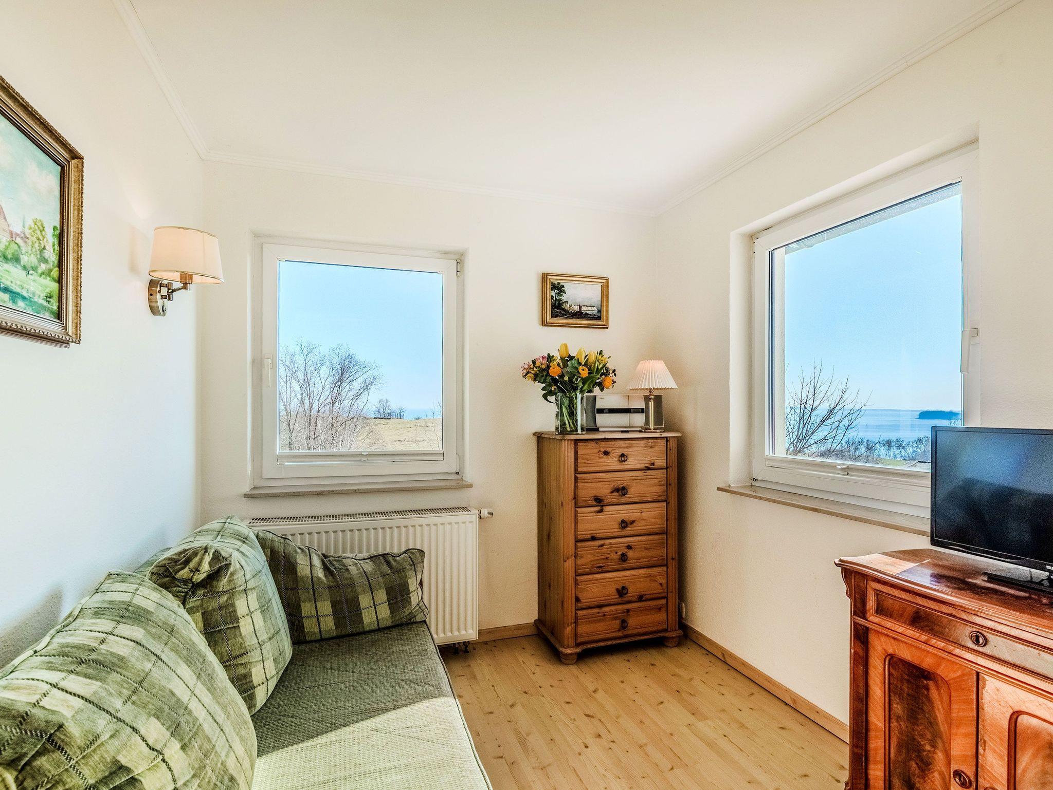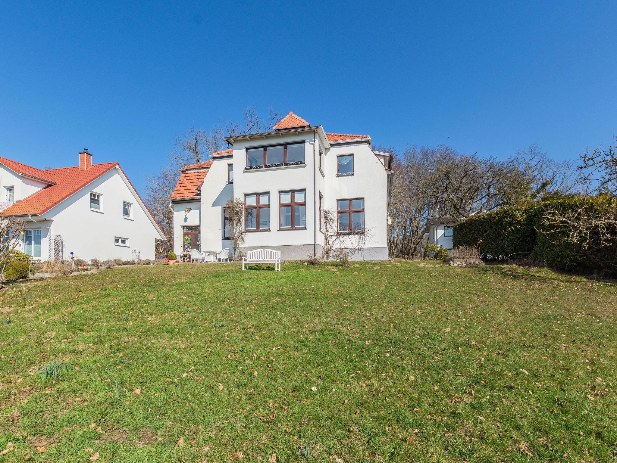 Die Ferienwohnung 1 ist hell und großzügig geschnitten, mit tollem Meeresblick und Terrasse. Eine sehr geräumige und stilvolle Wohnung mit großem Wohnzimmer und gemütlicher Sitzgruppe im Verandazimmer mit Blick auf die Ostsee.
