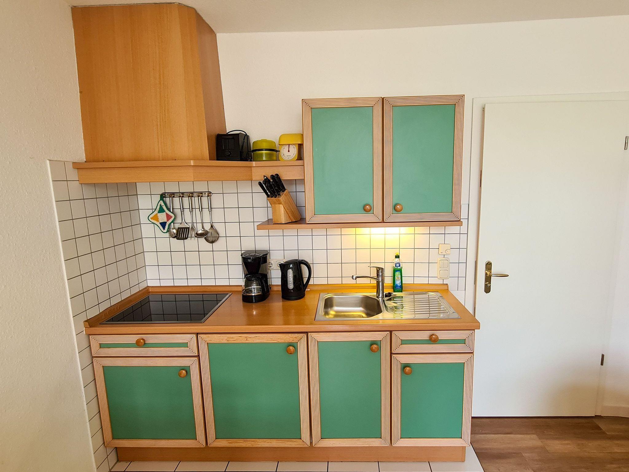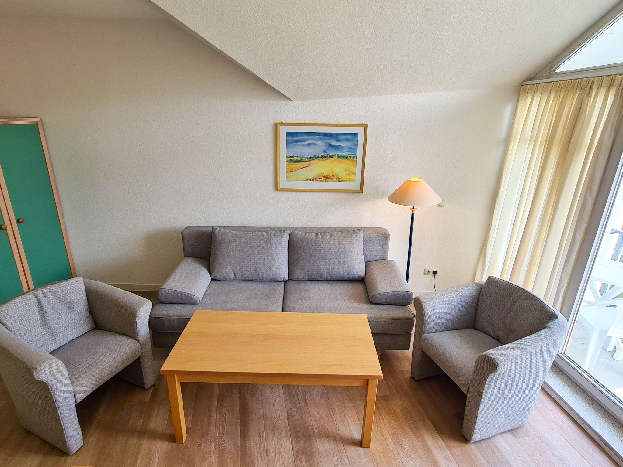 Die Wohnung verfügt über ein Schlafzimmer mit zwei Einzelbetten, Kleiderschrank und ein Wohnzimmer mit mit Sitzecke (Doppelschlafsofa) , TV und Essecke. Eine komplett eingerichtete Küchenzeile (4-Plattenherd, Kühlschrank, Mikrowelle, Kaffeemaschine, Toaster, komplett Geschirr, etc.) als auch ein Bad mit Dusche und WC gehören zur Wohnung.