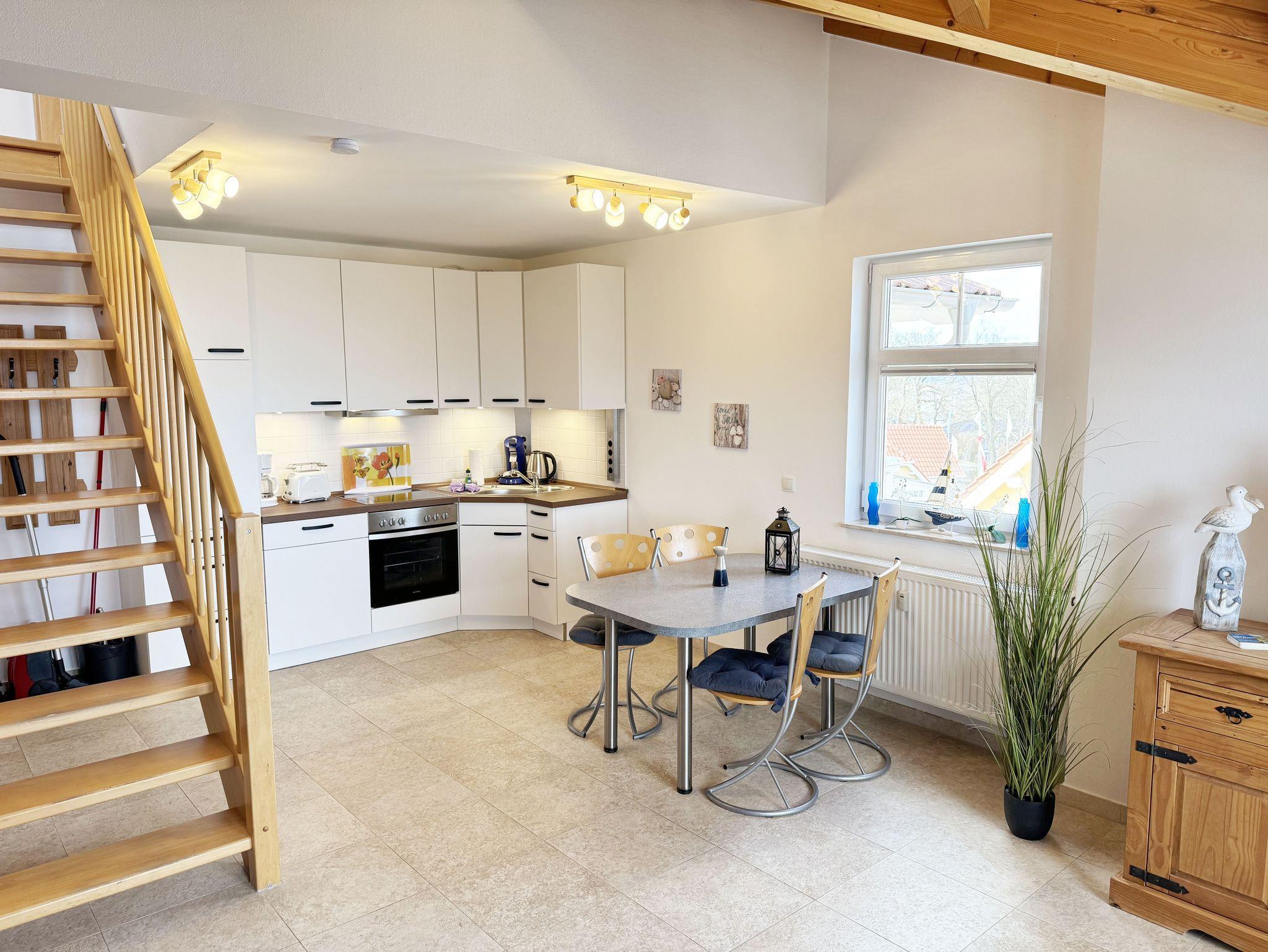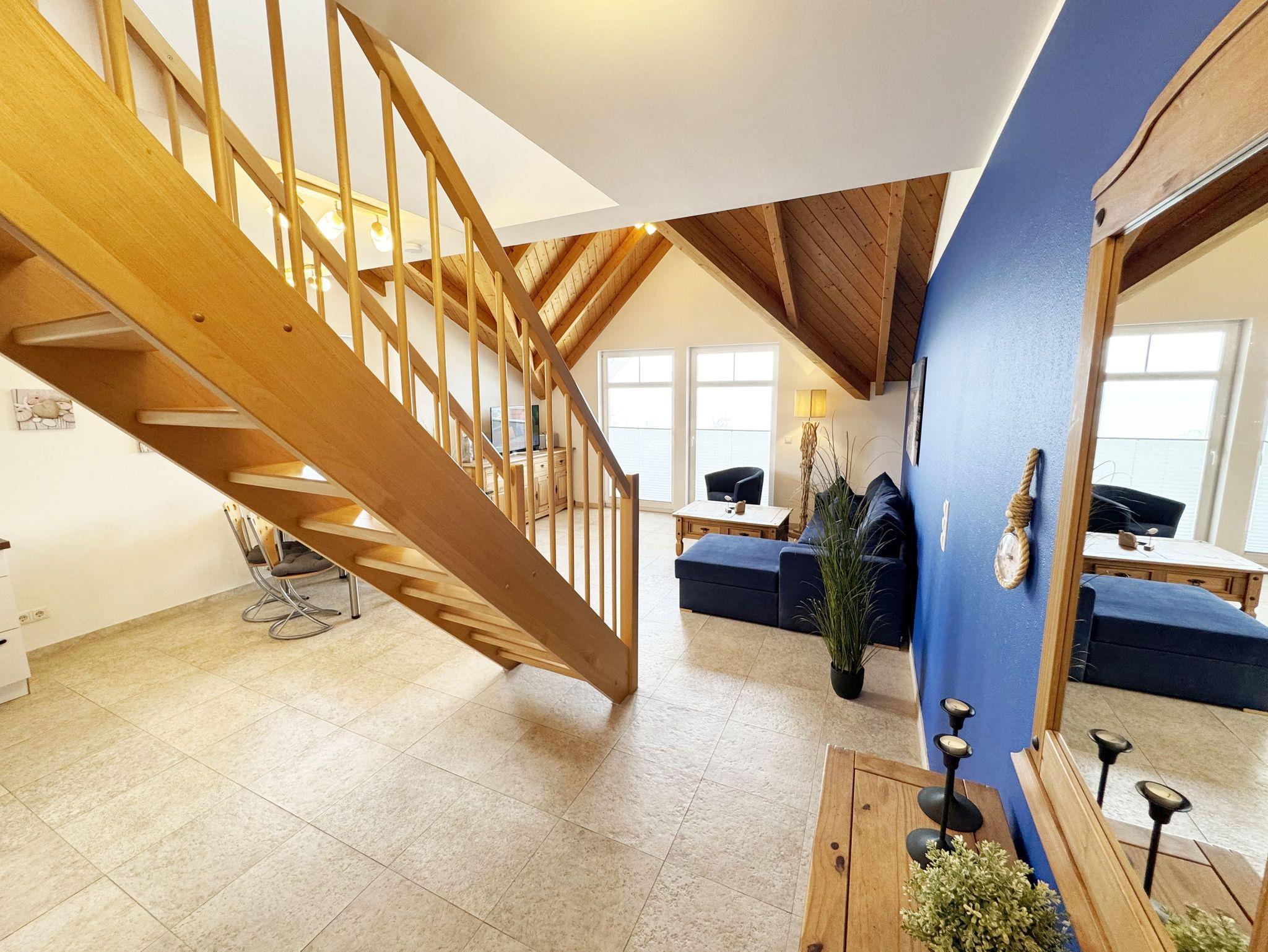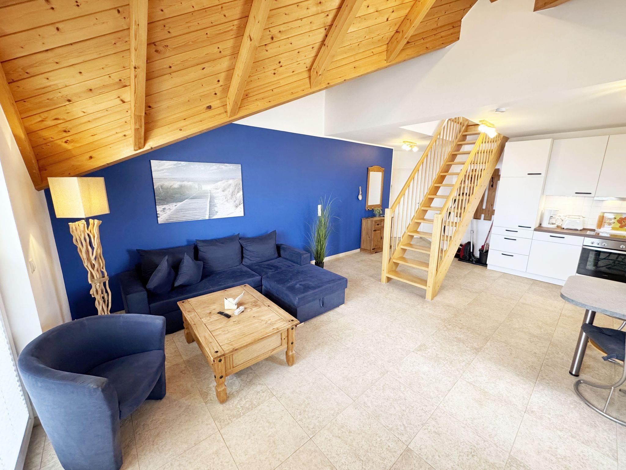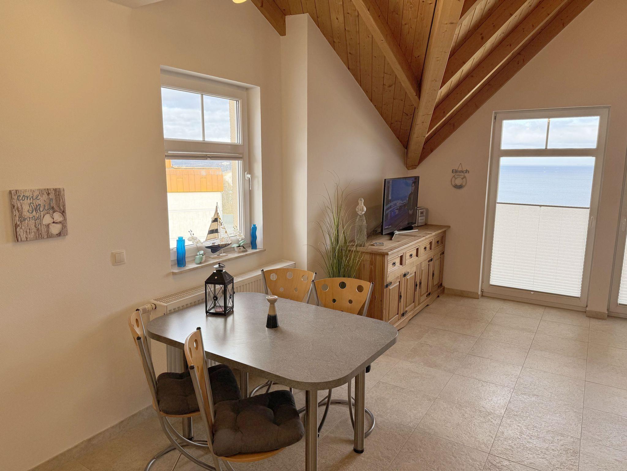 Die komfortable Maisonette Ferienwohnung (Nichtraucher) bietet mit ca. 53 qm Platz für 2 Personen und ein Kleinkind bis 3 Jahre im Kinderreisebett. Die Wohnung befindet sich in der 2. Etage. Der Wohn- und Essbereich besteht aus einer gemütlichen Couchecke, sowie einer Anrichte mit SMART-TV, DVD-Player, Radio und CD-Player. Sie brauchen auch im Urlaub auf einen Internetzugang (WLAN) in Ihrer Wohnung nicht zu verzichten. Dieser ist für Sie inklusive! Gleichzeitig finden Sie hier den angrenzenden Essbereich mit einer voll ausgestatteten modernen Küchenzeile mit Geschirrspüler, einer Spüle, einen Kühlschrank mit Eisfach, einen Backofen mit 4-Zonen-Cerankochfeld, einen Wasserkocher, einer Kaffeemaschine, einer Senseo-Padmaschine, diversen Küchenutensilien sowie einen Esstisch mit Bestuhlung. Vom Wohnbereich aus können Sie den bestuhlten Balkon mit Sonnenschirm erreichen. Hier können Sie bei einem Glas Wein den herrlich, traumhaften Panoramablick Richtung Nordstrand auf das Meer genießen. Das Schlafzimmer erreichen Sie über die Treppe, welche sich im Wohnbereich befindet. Hier finden Sie ein Doppelbett mit 2 einzelnen Matratzen (je 0,80 m x 2,00 m), eine Kommode mit SMART-TV sowie einen Kleiderschrank. Auf der gleichen Etage befindet sich das Bad welches über eine ebenerdige Dusche mit WC, einen Kosmetikspiegel und einen Fön verfügt. Insektenschutzgitter befinden sich zum Teil an den Fenstern. Bis zu 2 Haustiere können Sie gegen eine Gebühr dazu buchen. Der PKW-Stellplatz Nr. 09 befindet sich direkt am Haus. Die Erstausstattung eines Wäschepaketes (komplette Bettwäsche, 1 Duschhandtuch, 2 kleine Handtücher) können Sie bis 14 Tage vor der Anreise gegen einen Aufpreis dazu buchen oder durch eigene ergänzen. Ab 2 gebuchten Paketen erhalten Sie einmalig 1 Geschirrtuch und einen Duschvorleger dazu.