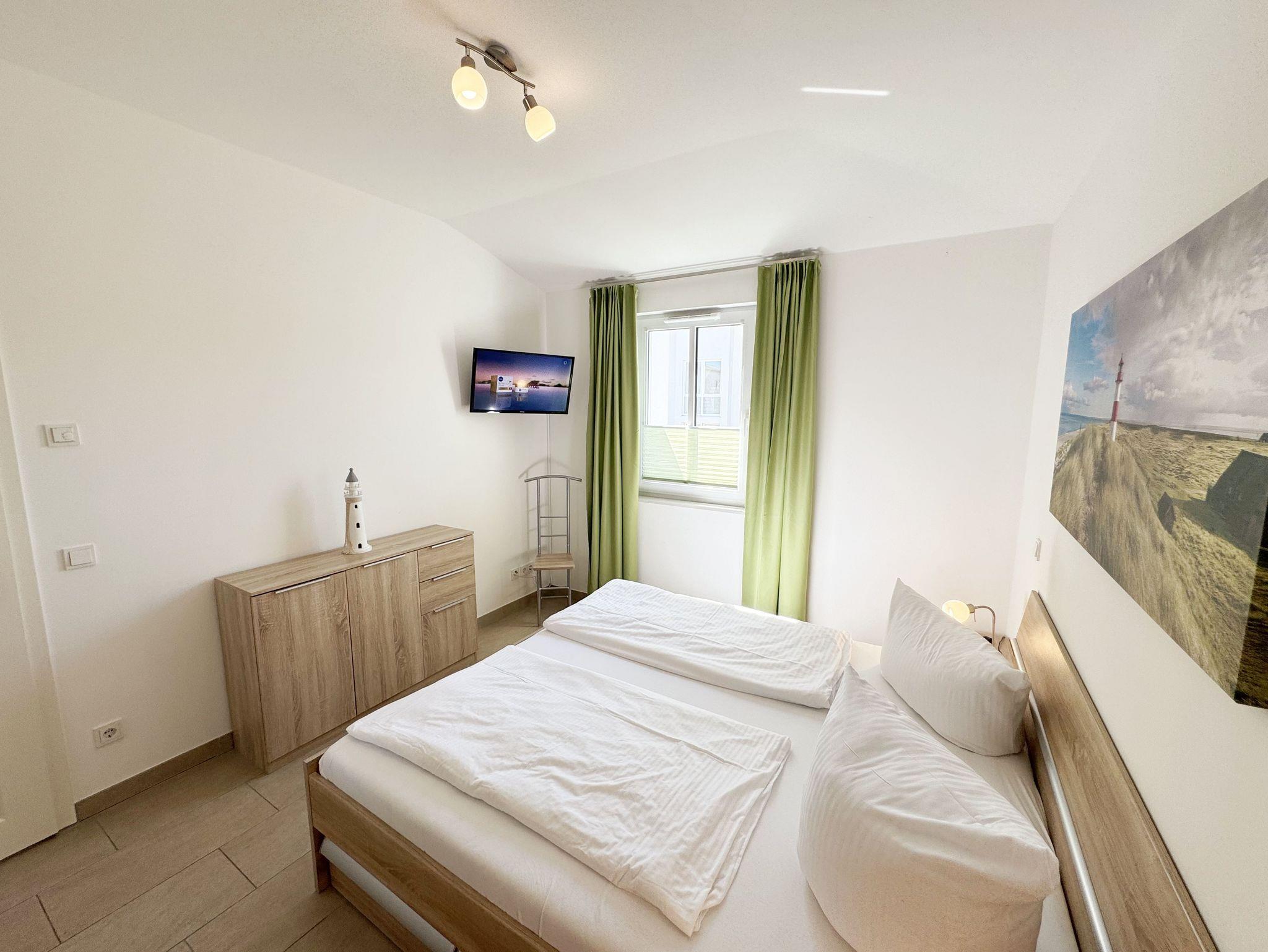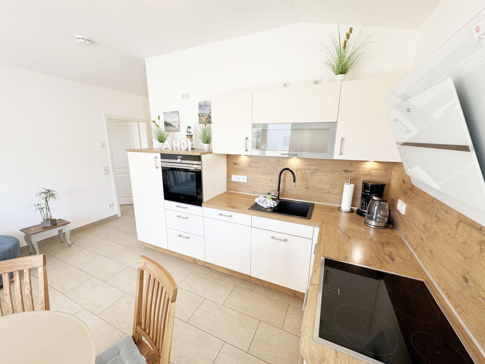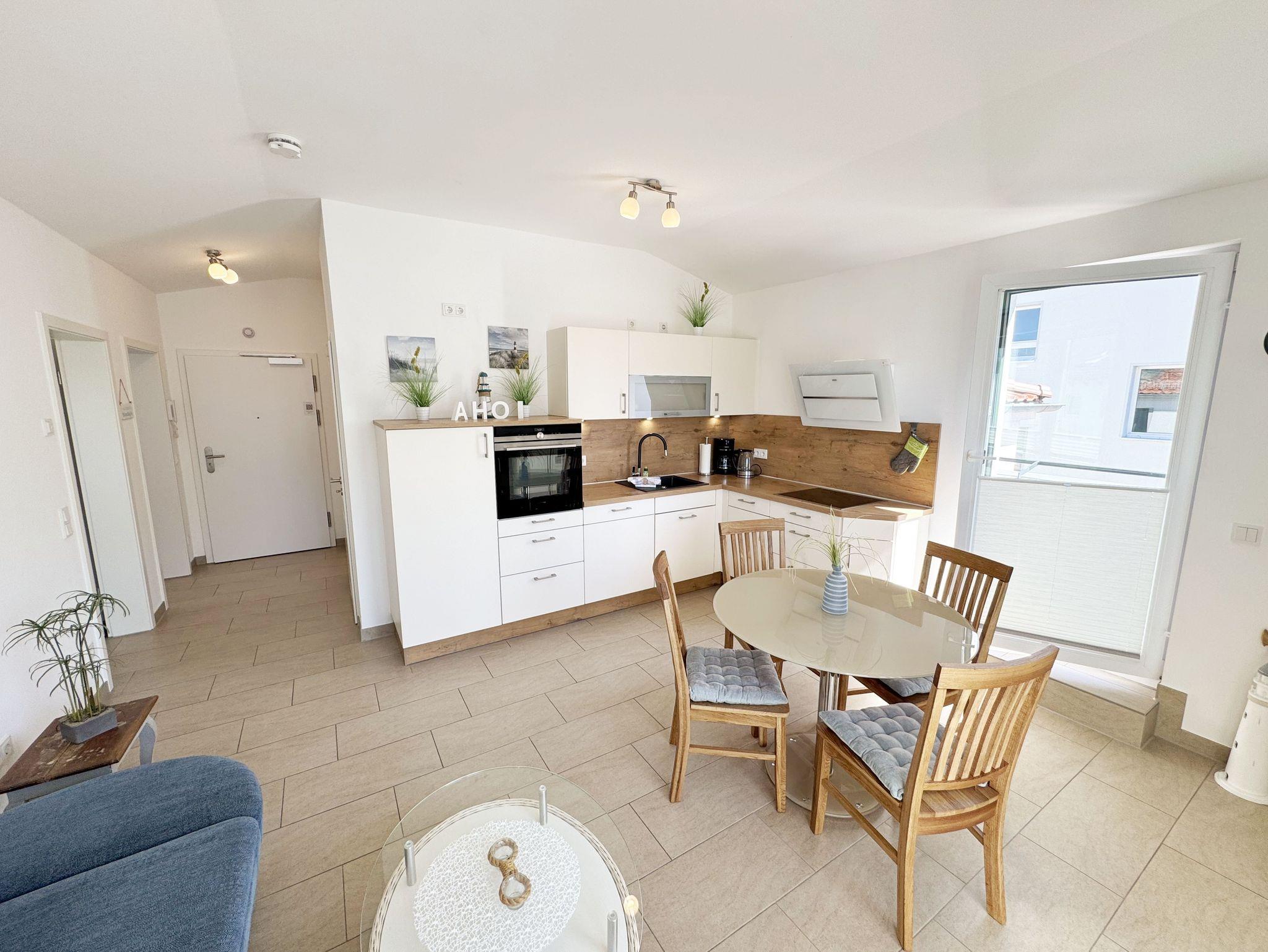 Die Wohnung Nr.08 in der Villa Anni ist eine moderne und stilvoll eingerichtete Nichtraucherwohnung in der 2.Etage. Sie bietet mit ihren ca. 54qm ausreichend Platz für max. 4 Personen. Der kombinierte Wohn- /Koch-und Essbereich mit einer modernen integrierten Küchenzeile lässt mit einem Induktionsfeld, einen Backofen mit Mikrowelle, einem Geschirrspüler, ein Kühlschrank mit Gefrierfach, einer Kaffeemaschine, einem Wasserkocher, einen Toaster, einen Eierkocher sowie diverse Küchenutensilien keine Wünsche offen. Ein runder Esstisch mit 4 Stühlen fügt sich der Küchenzeile an. Der übergehende Wohnbereich verfügt über eine gemütliche Couch mit Couchtisch, einem Sessel, einer Stehlampe mit flexibler Leseleuchte, ein Smart-TV mit einem Anschluss für Spielekonsolen und USB-Port und einen Blue-Ray Player. Ein WLAN-Anschluss komplettiert diesen Bereich für Sie, welcher inklusive ist. Eine kleine Auswahl an Gesellschaftsspielen und Urlaubslektüre steht Ihnen zusätzlich zur Verfügung. Über eine kleine Stufe vom Wohnbereich gelangen Sie auf den bestuhlten Balkon. Das erste Schlafzimmer verfügt über ein Doppelbett (1,80m x 2,00m, durchgehend), Nachttischablagen, einen Smart-TV, einem Kleiderschrank, eine Kommode, einen Wandspiegel sowie einem Herrendiener. Das zweite Schlafzimmer verfügt über ein Doppelbett (1,60m x 2,00m, Härtegrad 3, durchgehend) mit integrierten Nachttischlampen, verstellbare Lattenroste, einen Nachttisch, einen Smart-TV, eine Kommode sowie einen Herrendiener. Alle Räumlichkeiten wurden mit Plissee und Vorhängen ausgestattet. Das innenliegende Bad verfügt über eine ebenerdige und geräumige Dusche, einen Waschtisch mit Unterschrank, ein WC, einen Wandspiegel sowie einen Handtuchheizkörper. Die komplette Wohnung wurde mit einer Fußbodenheizung versehen und sorgt somit an kalten Tagen für eine angenehme Wärme. Ein Wäscheständer, ein Staubsauger und weitere Reinigungsutensilien stehen Ihnen zur Verfügung. Ihr PKW-Stellplatz (Nr.08) befindet sich in der Tiefgarage (Einfahrtshöhe 2,00m) des Hauses. Ihr Vierbeiner ist mit seinem eigenen Schlafplatz gegen eine Gebühr ein gern gesehener Gast. Die Erstausstattung eines Wäschepaketes (komplette Bettwäsche, 1 Duschhandtuch, 2 kleine Handtücher) können Sie bis 14 Tage vor Anreise gegen einen Aufpreis dazu buchen oder durch eigene ergänzen. Ab 2 gebuchten Paketen erhalten Sie einmalig 1 Geschirrhandtuch und 1 Duschvorleger dazu.
