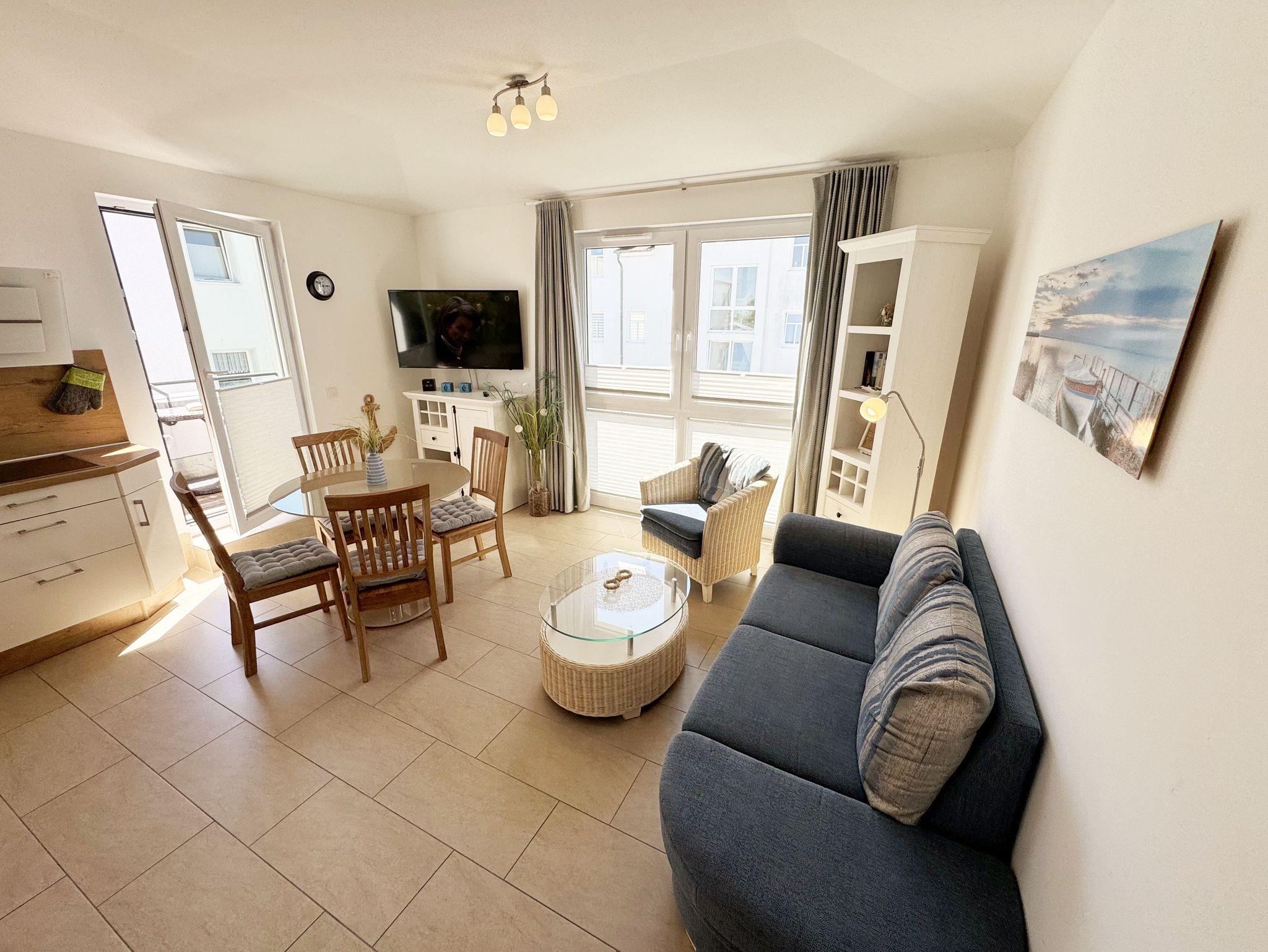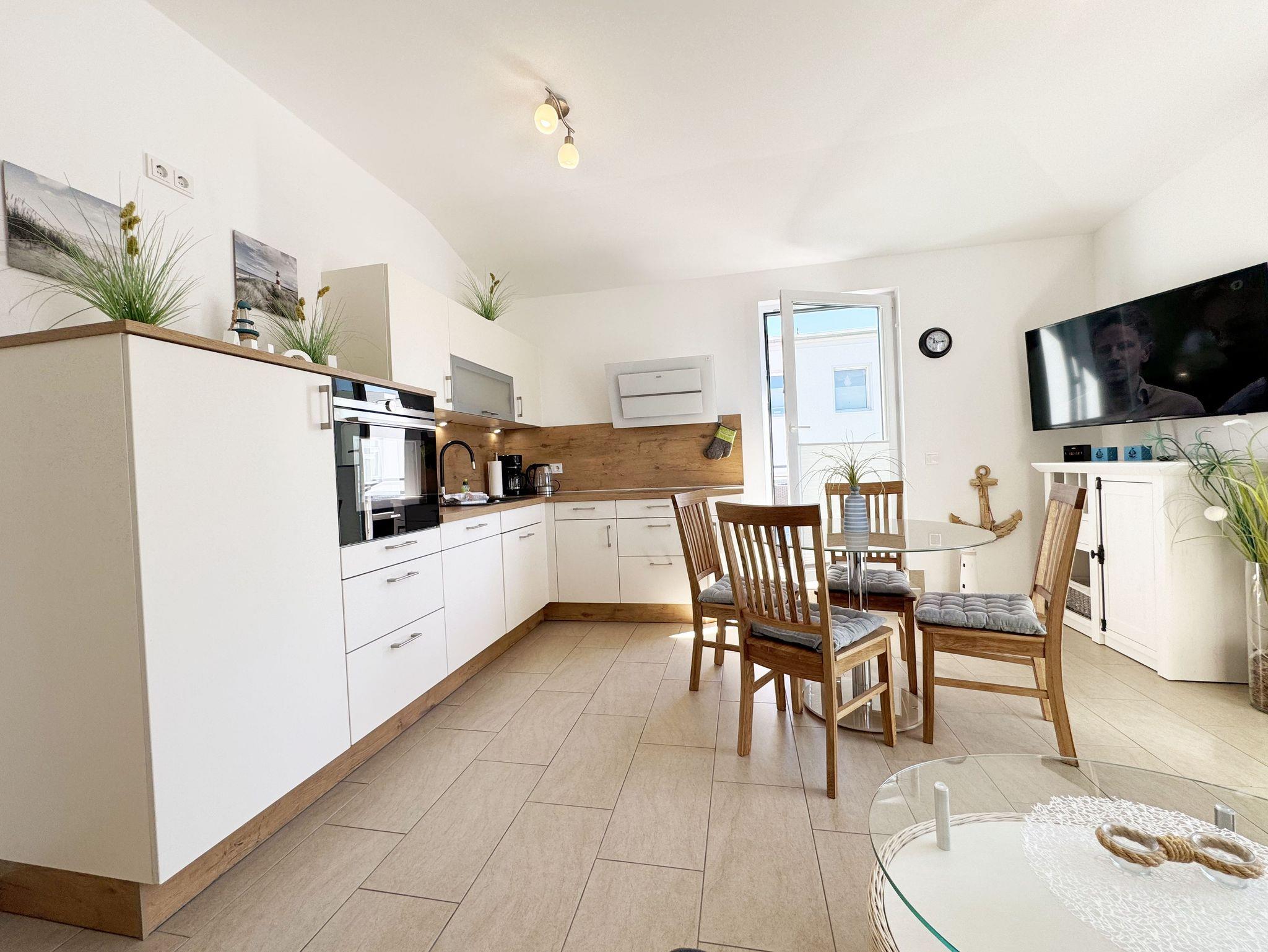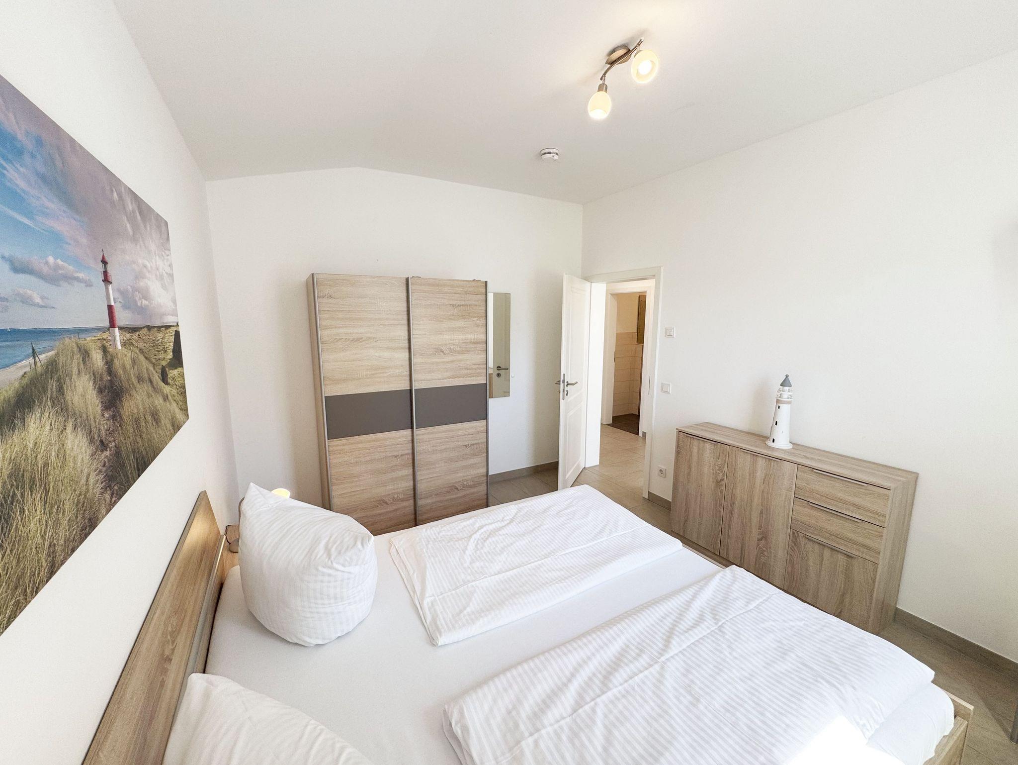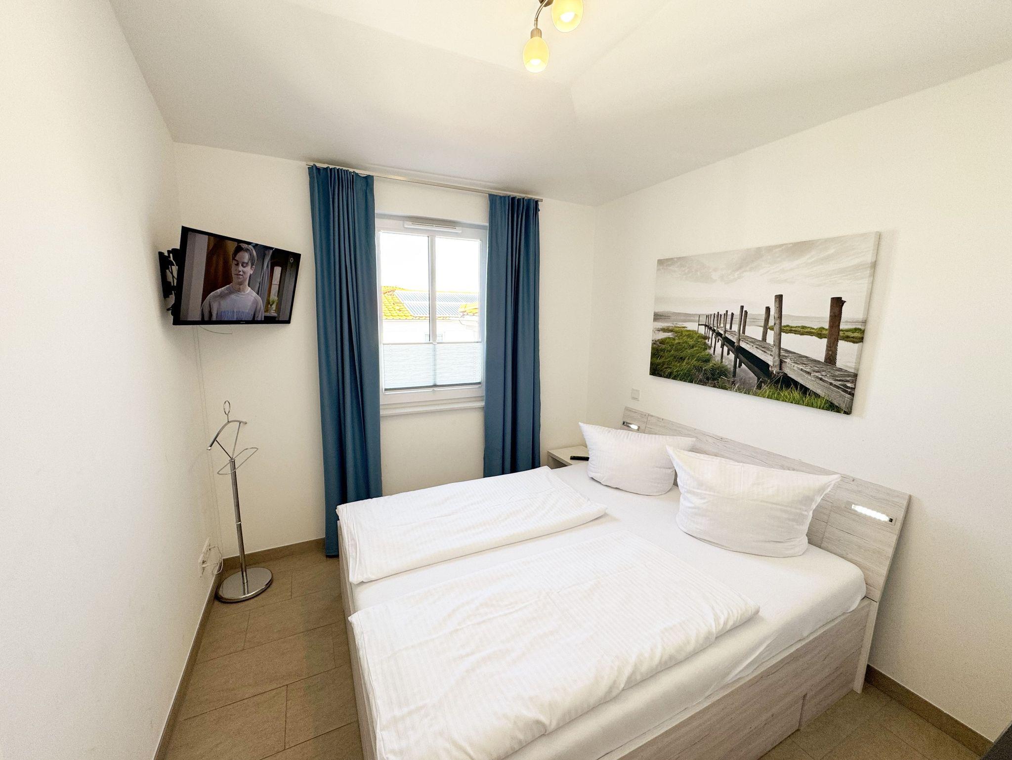 Die Wohnung Nr.08 in der Villa Anni ist eine moderne und stilvoll eingerichtete Nichtraucherwohnung in der 2.Etage. Sie bietet mit ihren ca. 54qm ausreichend Platz für max. 4 Personen. Der kombinierte Wohn- /Koch-und Essbereich mit einer modernen integrierten Küchenzeile lässt mit einem Induktionsfeld, einen Backofen mit Mikrowelle, einem Geschirrspüler, ein Kühlschrank mit Gefrierfach, einer Kaffeemaschine, einem Wasserkocher, einen Toaster, einen Eierkocher sowie diverse Küchenutensilien keine Wünsche offen. Ein runder Esstisch mit 4 Stühlen fügt sich der Küchenzeile an. Der übergehende Wohnbereich verfügt über eine gemütliche Couch mit Couchtisch, einem Sessel, einer Stehlampe mit flexibler Leseleuchte, ein Smart-TV mit einem Anschluss für Spielekonsolen und USB-Port und einen Blue-Ray Player. Ein WLAN-Anschluss komplettiert diesen Bereich für Sie, welcher inklusive ist. Eine kleine Auswahl an Gesellschaftsspielen und Urlaubslektüre steht Ihnen zusätzlich zur Verfügung. Über eine kleine Stufe vom Wohnbereich gelangen Sie auf den bestuhlten Balkon. Das erste Schlafzimmer verfügt über ein Doppelbett (1,80m x 2,00m, durchgehend), Nachttischablagen, einen Smart-TV, einem Kleiderschrank, eine Kommode, einen Wandspiegel sowie einem Herrendiener. Das zweite Schlafzimmer verfügt über ein Doppelbett (1,60m x 2,00m, Härtegrad 3, durchgehend) mit integrierten Nachttischlampen, verstellbare Lattenroste, einen Nachttisch, einen Smart-TV, eine Kommode sowie einen Herrendiener. Alle Räumlichkeiten wurden mit Plissee und Vorhängen ausgestattet. Das innenliegende Bad verfügt über eine ebenerdige und geräumige Dusche, einen Waschtisch mit Unterschrank, ein WC, einen Wandspiegel sowie einen Handtuchheizkörper. Die komplette Wohnung wurde mit einer Fußbodenheizung versehen und sorgt somit an kalten Tagen für eine angenehme Wärme. Ein Wäscheständer, ein Staubsauger und weitere Reinigungsutensilien stehen Ihnen zur Verfügung. Ihr PKW-Stellplatz (Nr.08) befindet sich in der Tiefgarage (Einfahrtshöhe 2,00m) des Hauses. Ihr Vierbeiner ist mit seinem eigenen Schlafplatz gegen eine Gebühr ein gern gesehener Gast. Die Erstausstattung eines Wäschepaketes (komplette Bettwäsche, 1 Duschhandtuch, 2 kleine Handtücher) können Sie bis 14 Tage vor Anreise gegen einen Aufpreis dazu buchen oder durch eigene ergänzen. Ab 2 gebuchten Paketen erhalten Sie einmalig 1 Geschirrhandtuch und 1 Duschvorleger dazu.