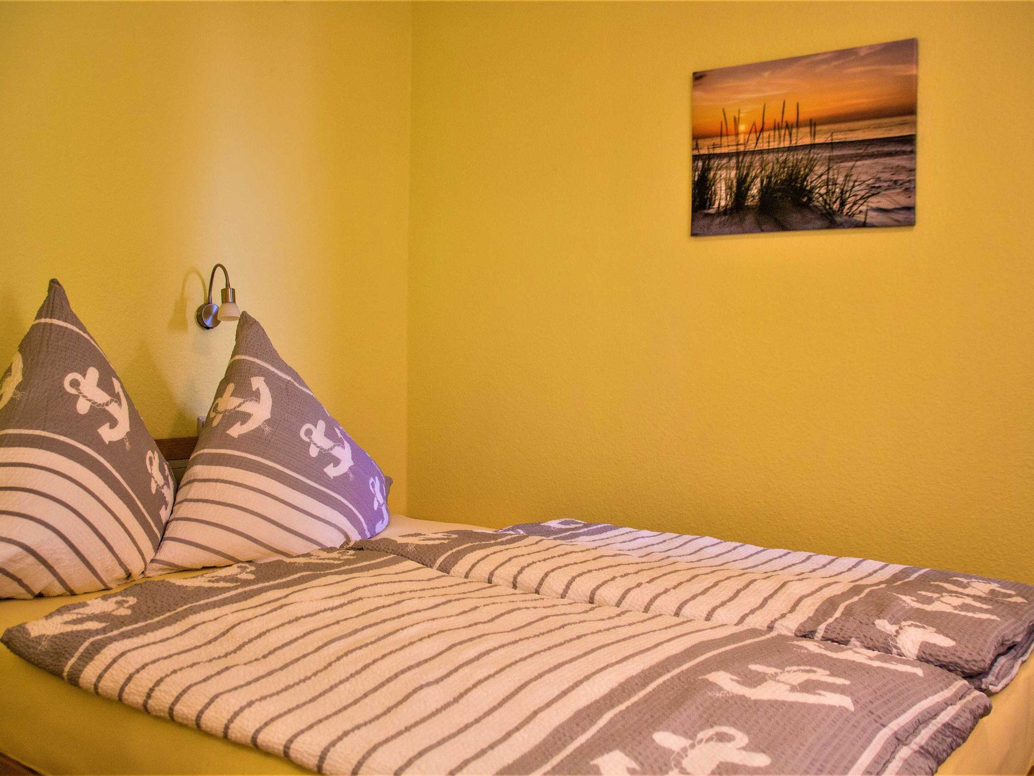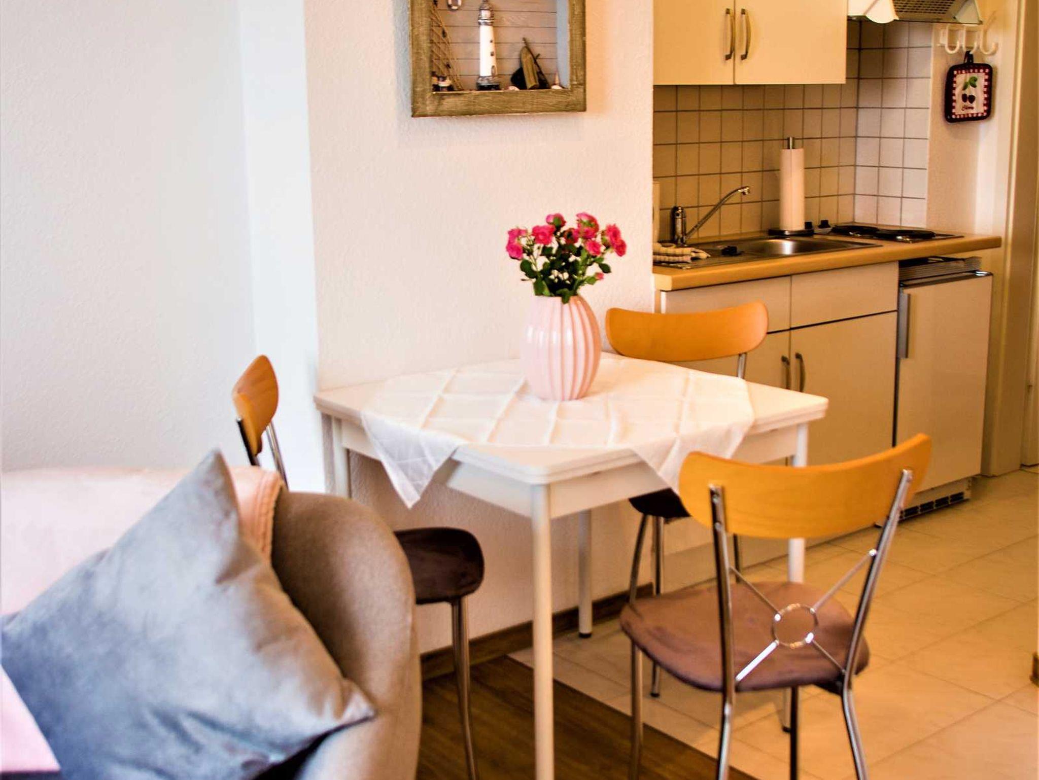 Im Wohnzimmer befindet sich auch eine kleine Küchenzeile mit Herd, Abzugshaube, Kühlschrank und Kaffeemaschine, Toaster und Esstisch mit Stühlen. Das Schlafzimmer (ohne Türabtrennung zum Wohnzimmer) verfügt über ein Doppelbett (1,40m) mit Ablagemöglichkeiten sowie einer Leselampe über dem Bett. Im modernen Bad finden Sie Dusche, Waschbecken und WC. Bei Ihrer Anreise sind die Betten selbstverständlich bereits mit Bettwäsche bezogen. Handtücher sowie Strandhandtücher bringen Sie bitte selbst mit.