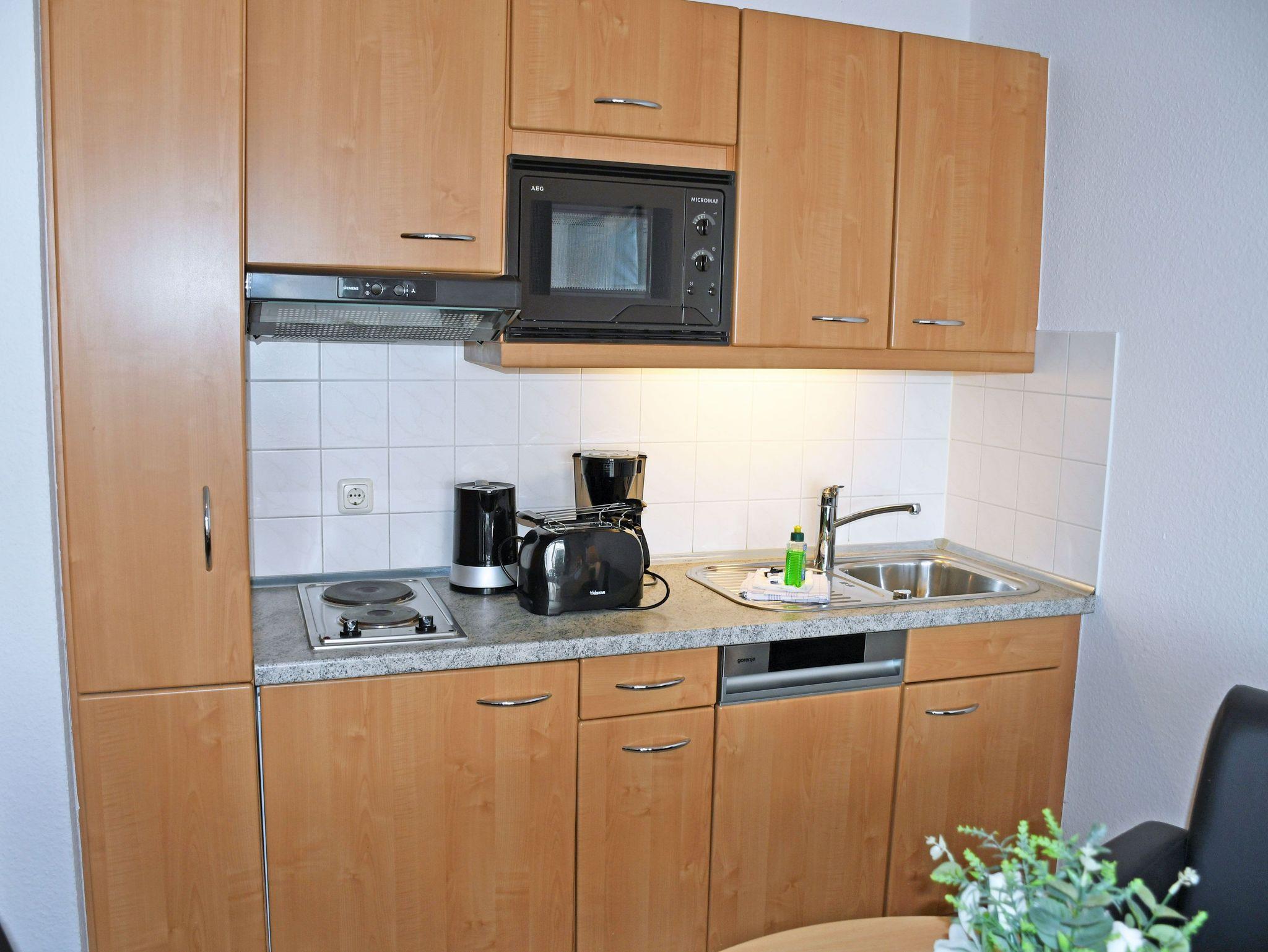Im Wohnraum integrierte Einbauküche, ausgestattet mit: 2-Platten-Kochfeld, Mikrowelle, Dunstabzugshaube, Kühlschrank mit Gefrierfach, Geschirrspüler, Toaster, Kaffeemaschine, Wasserkocher und Küchenutensilien