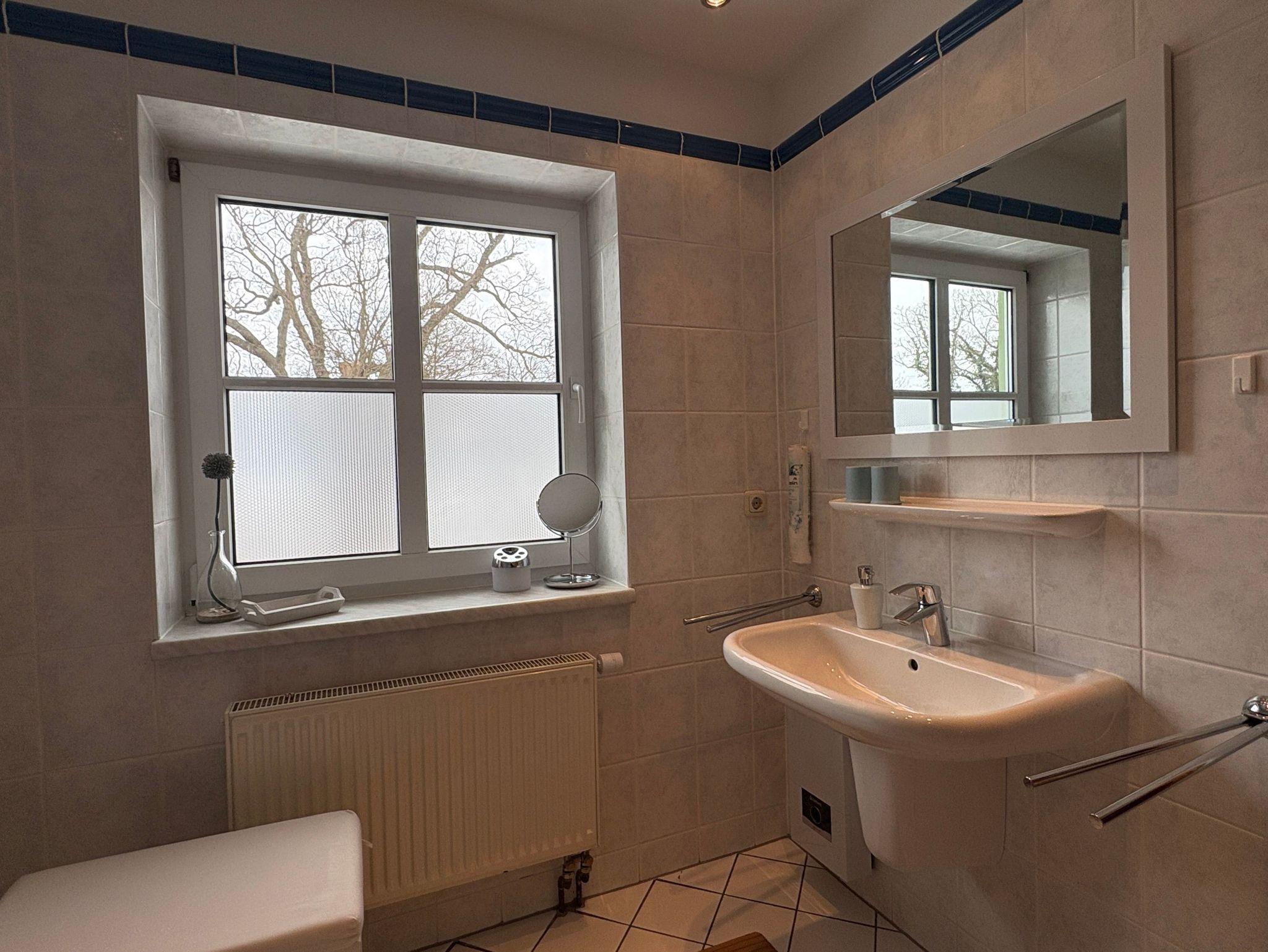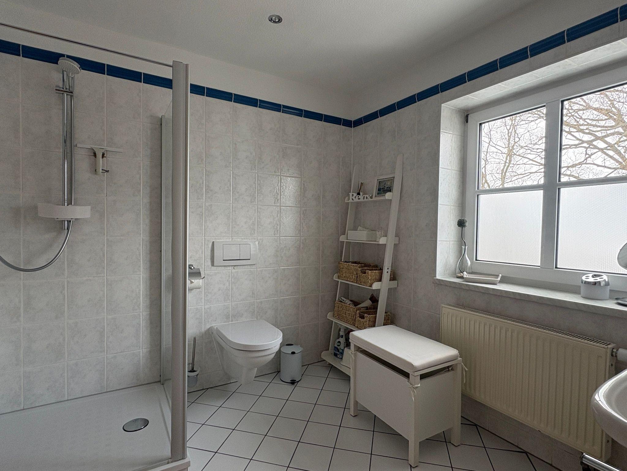 • Küche und Dusch-Bad. Das geräumige Badezimmer wurde 2022 modernisiert und hat jetzt einen fußbodenebenen Eintritt in die Dusche.