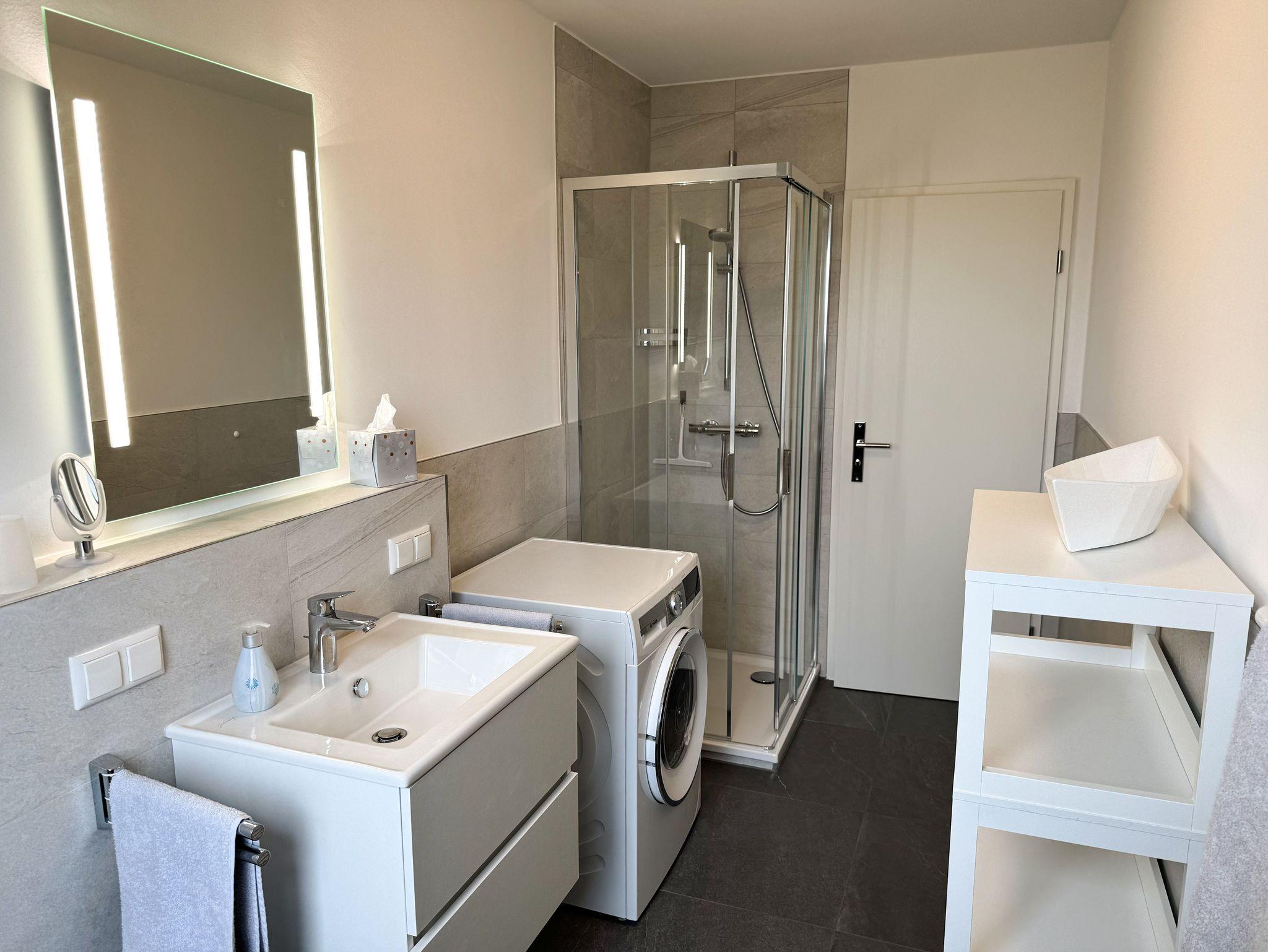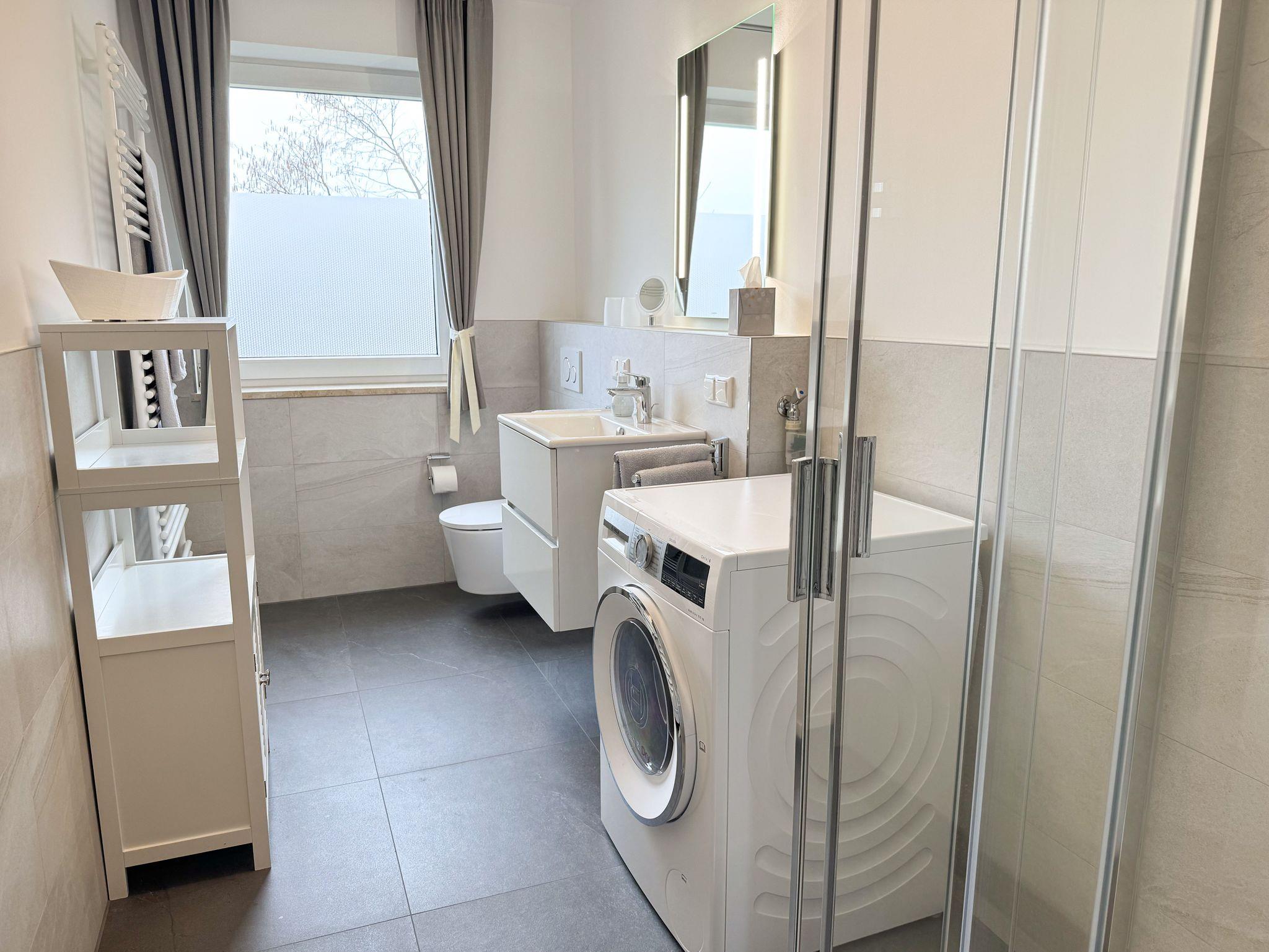 Im Bad befindet sich ein Wasch-Trockner.