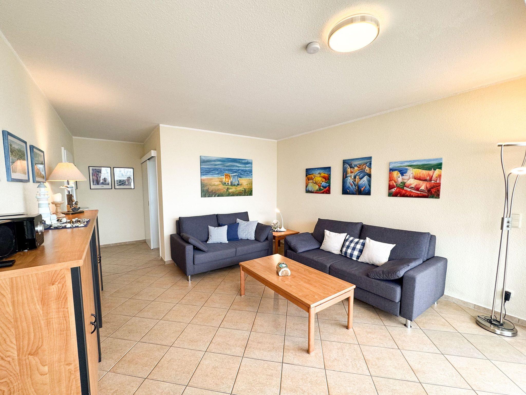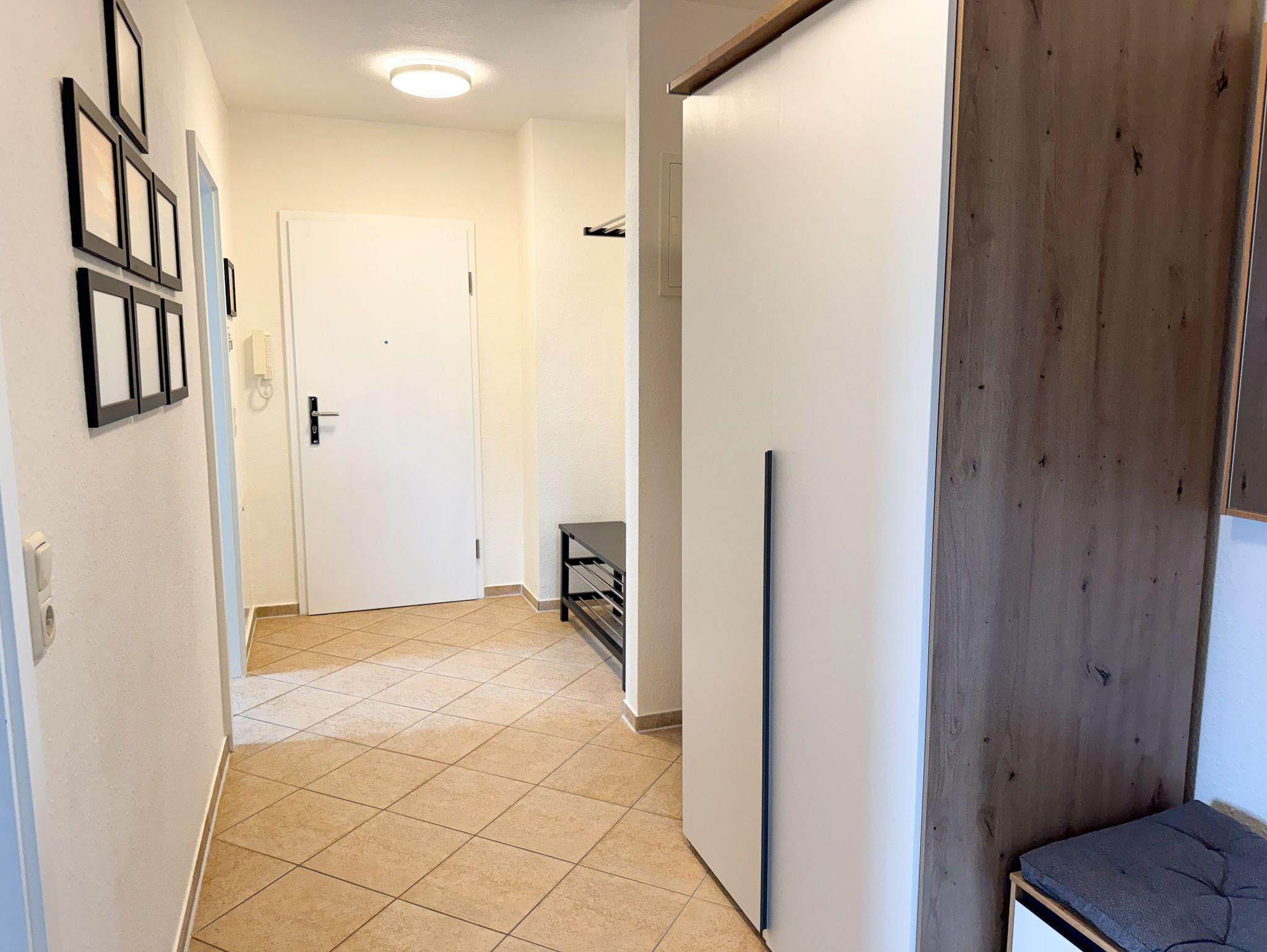 Aufgeteilt ist die Wohnung wie folgt: Schlafzimmer mit Doppelbett, Wohnzimmer mit gemütlicher Sitzecke inkl. Doppelbett-Schlafcouch und TV als auch kostenfreie Nutzung von WLAN. Das WLAN ist eine zusätzlich angebotene, kostenfreie Leistung und berechtigt nicht zur Mietminderung bei Einschränkung der Funktion. (Touristenzugang - nicht geeignet zum Herunter- bzw. Hochladen von großen Datenmengen)
