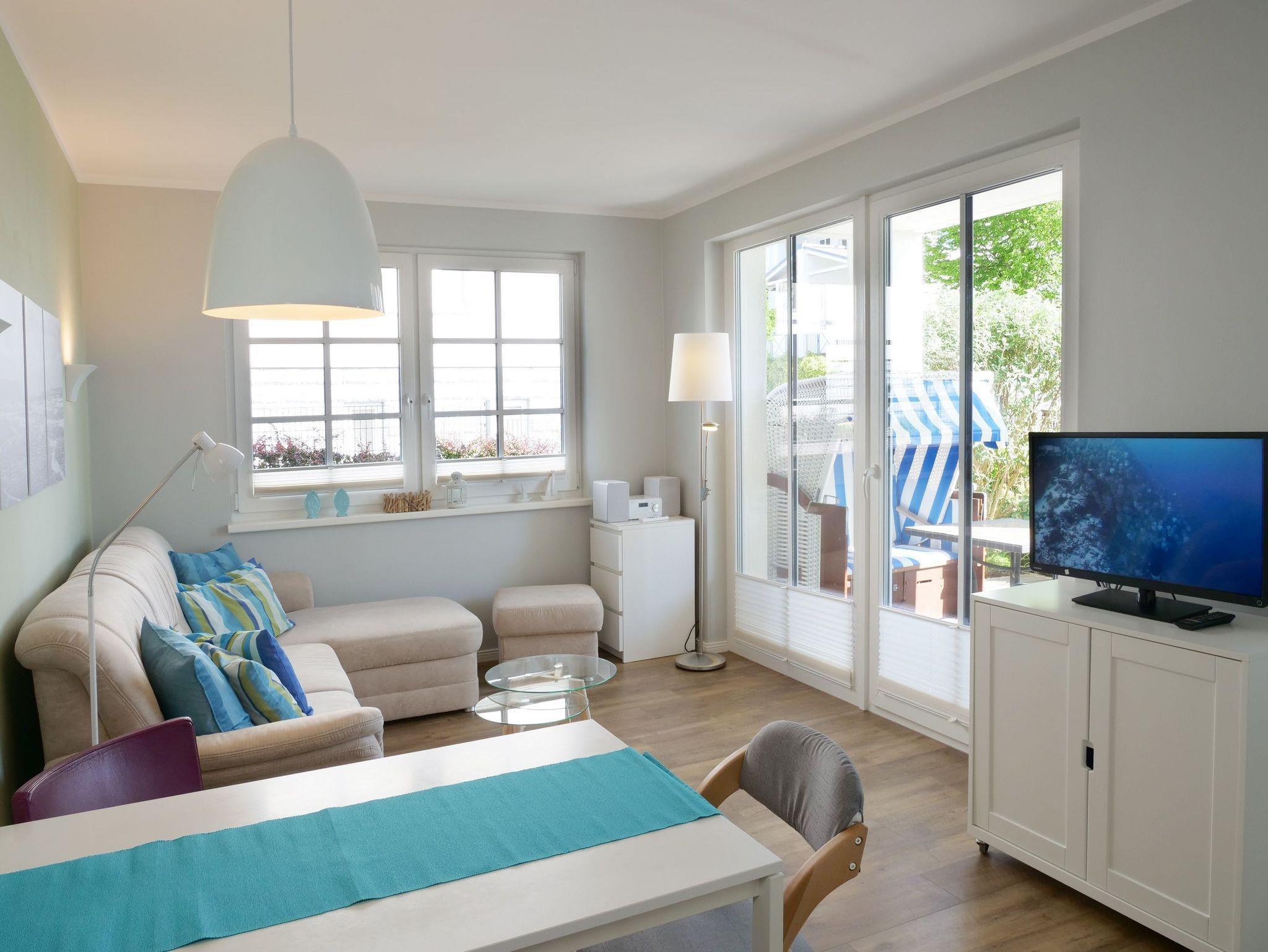 Diese sehr liebevoll und hochwertig eingerichtete 2-Raum-Ferienwohnung befindet sich im Erdgeschoss und verfügt über ca. 50 m² Wohnfläche. Die Nichtraucherwohnung ist ideal für max. 2 - 3 Personen geeignet. Auf der teilweise überdachten Terrasse (Ost) mit einem eigenen Strandkorb kann der Tag mit einem guten Frühstück in der Morgensonne beginnen. Die moderne und gemütliche Einrichtung wird unterstrichen durch eine geschmackvolle Farbgestaltung und erzeugt mit individuellen Rügen-Bildern ein sofortiges Urlaubsfeeling. Schöne Möbel kombiniert mit ansprechender Deko und auch die technische Ausstattung lassen keine Wünsche offen. Im Wohnzimmer sorgen eine gemütliche Couch (Aufbettung 3. Person/ 1,20m x 2,00m), eine Leselampe, der Esstisch und die in den Wohnbereich harmonisch integrierte Küchenzeile für eine angenehme Wohnatmosphäre. In der modern ausgestatteten Einbauküche erwarten Sie ein 4-Zonen-Cerankochfeld mit Backofen, ein Kühlschrank mit 3*-Gefrierfach, ein Toaster, ein Wasserkocher, eine Geschirrspülmaschine, eine Kaffeemaschine mit Thermoskanne sowie ein Delongi Kaffeevollautomat und diverse Küchenutensilien. Im Wohn- sowie im Schlafzimmer stehen Ihnen moderne Flachbildschirm-TV-Geräte zur Verfügung. Ein PEAQ-Micro-Audio-System mit Radio, CD-Player, Speicherkarten/USB-Wiedergabe sowie Bluetooth-Kopplung, ein DVD-Player sowie die kostenfreie Nutzung von WLAN runden das Angebot ab. Im ansprechenden Schlafzimmer sind ein Doppelbett (1,80m x 2,00m), 2 Nachttischkonsolen und ein Kleiderschrank vorhanden. Eine Fußbodenheizung sorgt für angenehme Temperaturen bei jeder Jahreszeit. Ein modernes und komfortabel ausgestattetes Bad mit ebenerdiger Dusche, WC, Waschtisch und Fön steht zur Verfügung. Über einen Fahrstuhl ist der zur Wohnung gehörende Tiefgaragenstellplatz Nr. 5 (Einfahrtshöhe 2,00m) im Untergeschoss zu erreichen. Dort befinden sich auch ein gemeinschaftlich genutzter Fahrradabstellraum und ein Waschraum mit Münzwaschmaschine und Münztrockner. Zur Erkundung der Umgebung stehen Ihnen zusätzlich 2 Fahrräder (1 Damen E-Bike und 1 Herren Trekking) zur Verfügung, was kein Vertragsbestandteil ist. Ein Haustier ist gegen eine Gebühr ein gern gesehener Gast. Die Erstausstattung eines Wäschepaketes (komplette Bettwäsche, 1 Duschhandtuch, 2 kleine Handtücher, 2 Geschirrhandtücher) können Sie bis 14 Tage vor Anreise gegen einen Aufpreis dazu buchen oder durch eigene ergänzen.