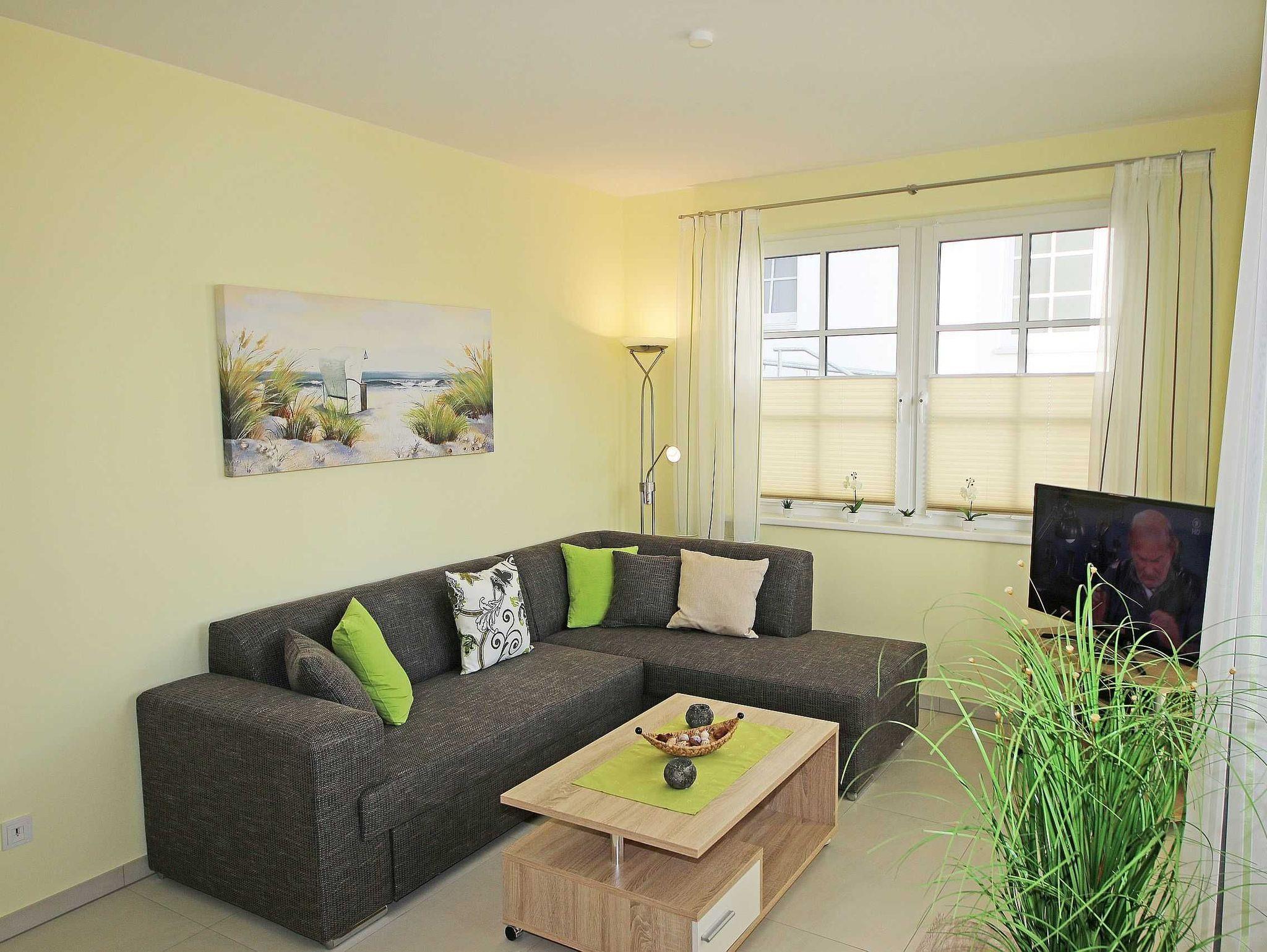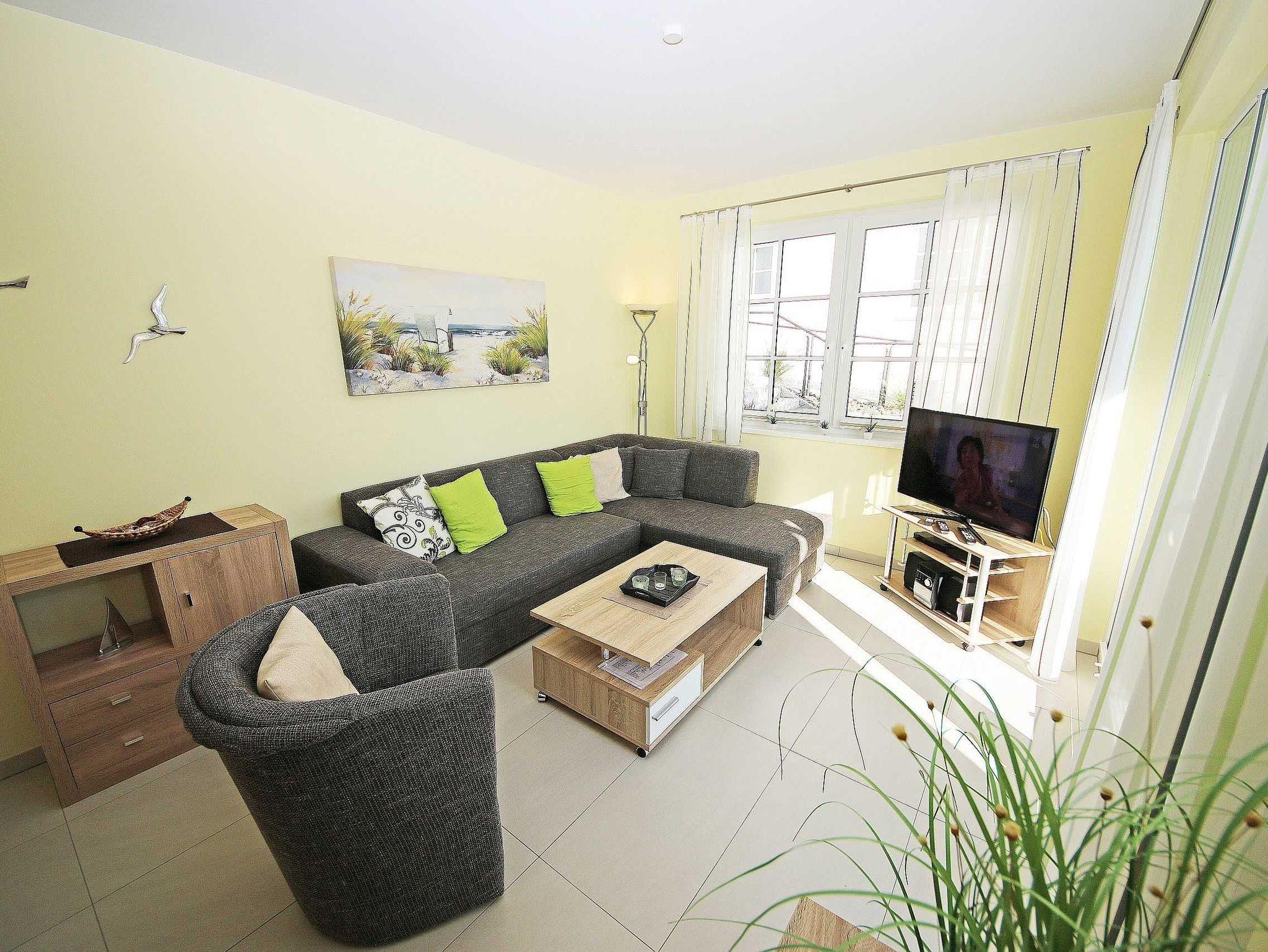 Die geschmackvoll eingerichtete 2-Raumferienwohnung (Nichtraucher) befindet sich im Erdgeschoss der Villa Antje. Durch die hellen, freundlichen Bodenfliesen und der in allen Räumen verlegte Fußbodenheizung ergibt sich eine angenehme Wohnatmosphäre. Der gemütliche Wohnbereich bietet für die 3. Person eine vollwertige Schlafcouch mit Ottomane (1,25m x 2,00m). Zusätzlich haben Sie einen Couchtisch, eine Leselampe sowie ein Smart-TV, Blu Ray Player und Mini-Stereo-Anlage. Das zweiflügelige Fenster im Wohnzimmer ist mit einem Insektenschutzgitter ausgestattet sowie das Fenster im Küchenbereich. Auch im Urlaub brauchen Sie in der Wohnung nicht auf einen Internetanschluss (WLAN) verzichten. Dieser ist für Sie inklusive! Die angrenzende Wohnküche mit Ceranfeld, Geschirrspüler, Kühlschrank mit Gefrierfach, Backofen, Wasserkocher, Kaffeemaschine, Toaster und diverse Küchenutensilien laden zum Kochen ein. Auf die überdachte Terrasse mit Süd-Ost-Ausrichtung, Möblierung und eigenem Strandkorb gelangen Sie durch den Wohnbereich. Das Schlafzimmer verfügt über ein Doppelbett (2 x 0,90 x 2,00m) mit Nachttischkonsolen, verstellbare Lattenroste, einen Kleiderschrank sowie Verdunklungsplissee. Im Schlafzimmer ist kein Platz für ein Kinderbett. Der komfortable Sanitärbereich wird durch einen ebenerdige Dusche, Handtuchheizkörper, Waschtisch, WC und Fön abgerundet. Das Schlafzimmer und das Duschbad verfügen jeweils über ein Insektenschutzgitter. Ein kleiner Abstellraum gehört zusätzlich zur Wohnung dazu. Über einen Fahrstuhl ist der zur Wohnung gehörende Tiefgaragenstellplatz (Nr. 3, Einfahrtshöhe 2,00m) im Untergeschoss zu erreichen. Ein allgemeiner Waschraum mit Waschmaschine und Trockner gegen Gebühr kann von allen Hausgästen genutzt werden sowie ein gemeinschaftlicher Fahrradabstellraum. Haustiere sind in der Wohnung nicht erlaubt. Die Erstausstattung von Bettwäsche ist pro Person inklusive. Ein Handtuchpaket ( 1 Duschhandtuch, 2 kleine Händehandtücher, sowie 2 Geschirrhandtücher) können Sie bis 14 Tage vor Anreise gegen einen Aufpreis dazu buchen bzw. durch Eigenmitnahme ergänzen.