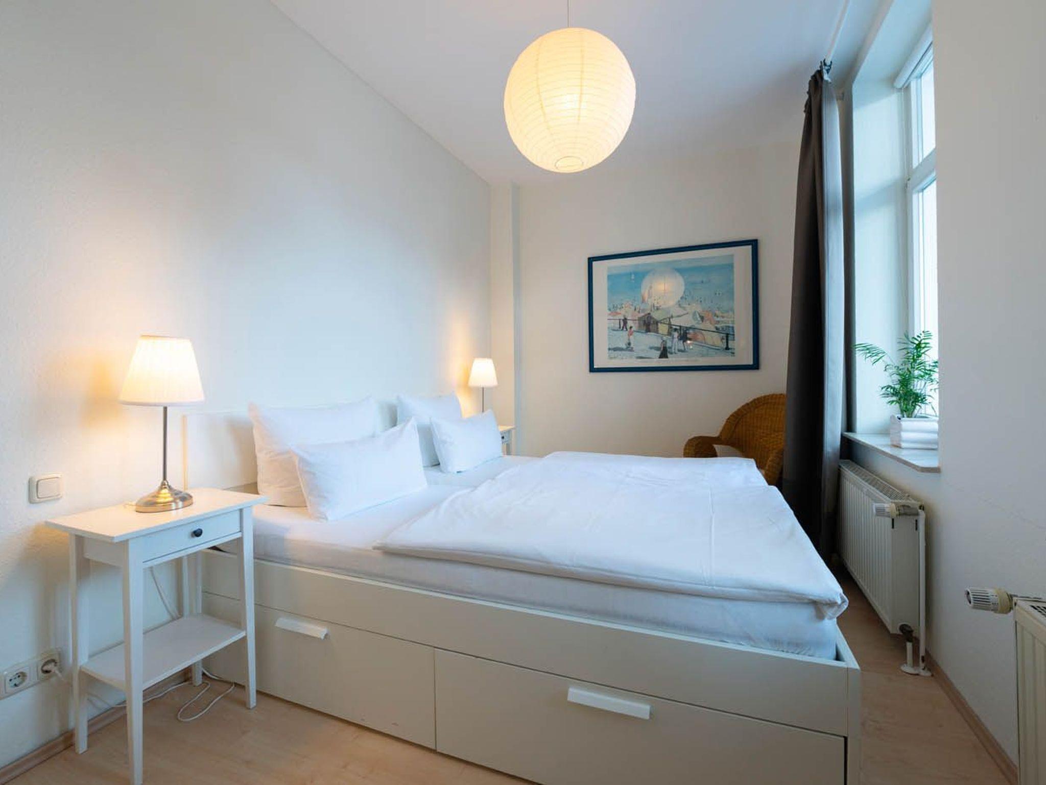 * Schlafzimmer mit einem Doppelbett (180 x 200 cm), 2 Nachttische mit Nachttischlampe und 1 Kleiderschrank