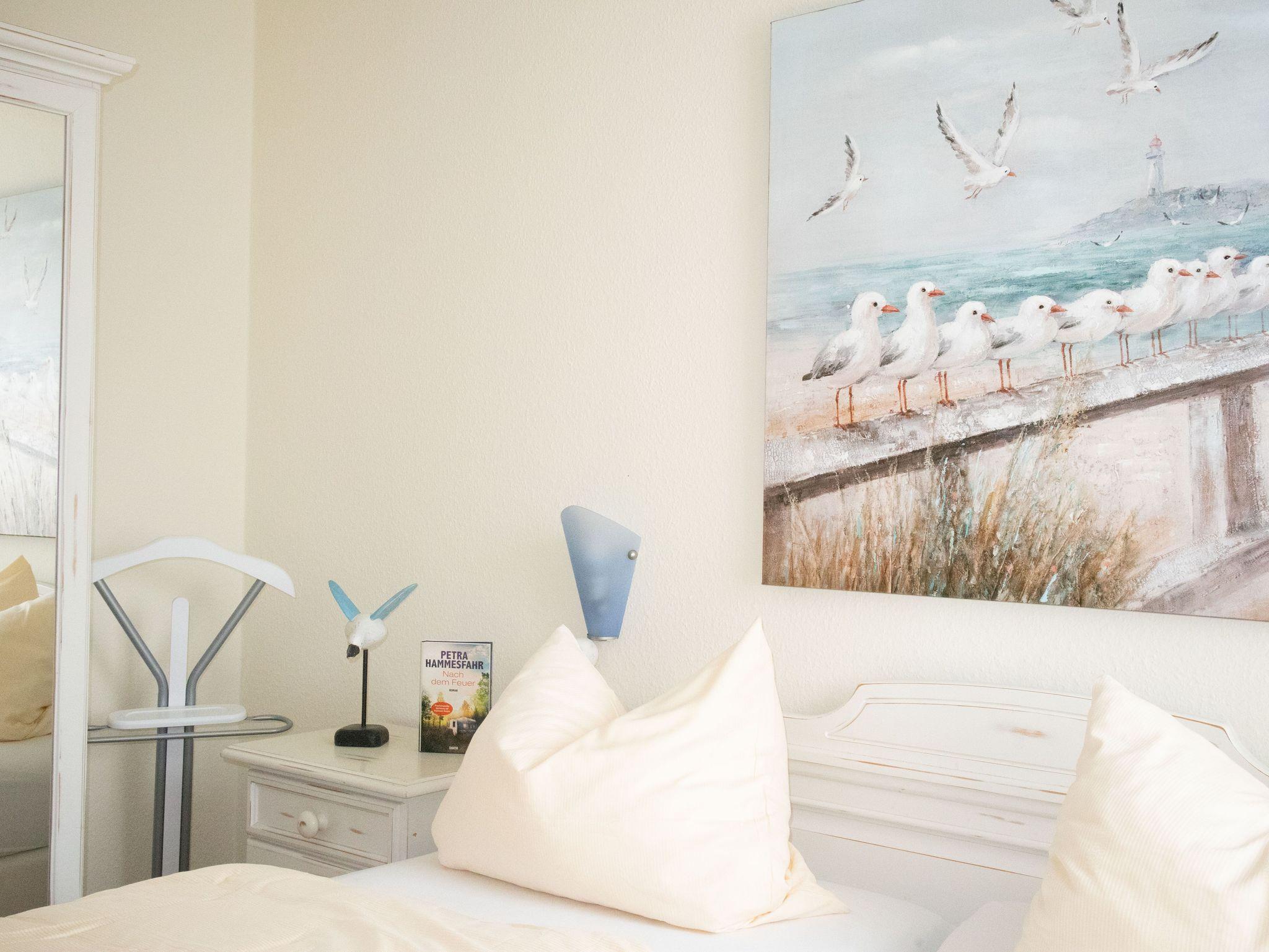Im Schlafzimmer bietet Ihnen ein Boxspringbett ausreichend Platz für einen erholsamen Schlaf. Ihre Urlaubskleidung können Sie im geräumigen Kleiderschrank unterbringen.
