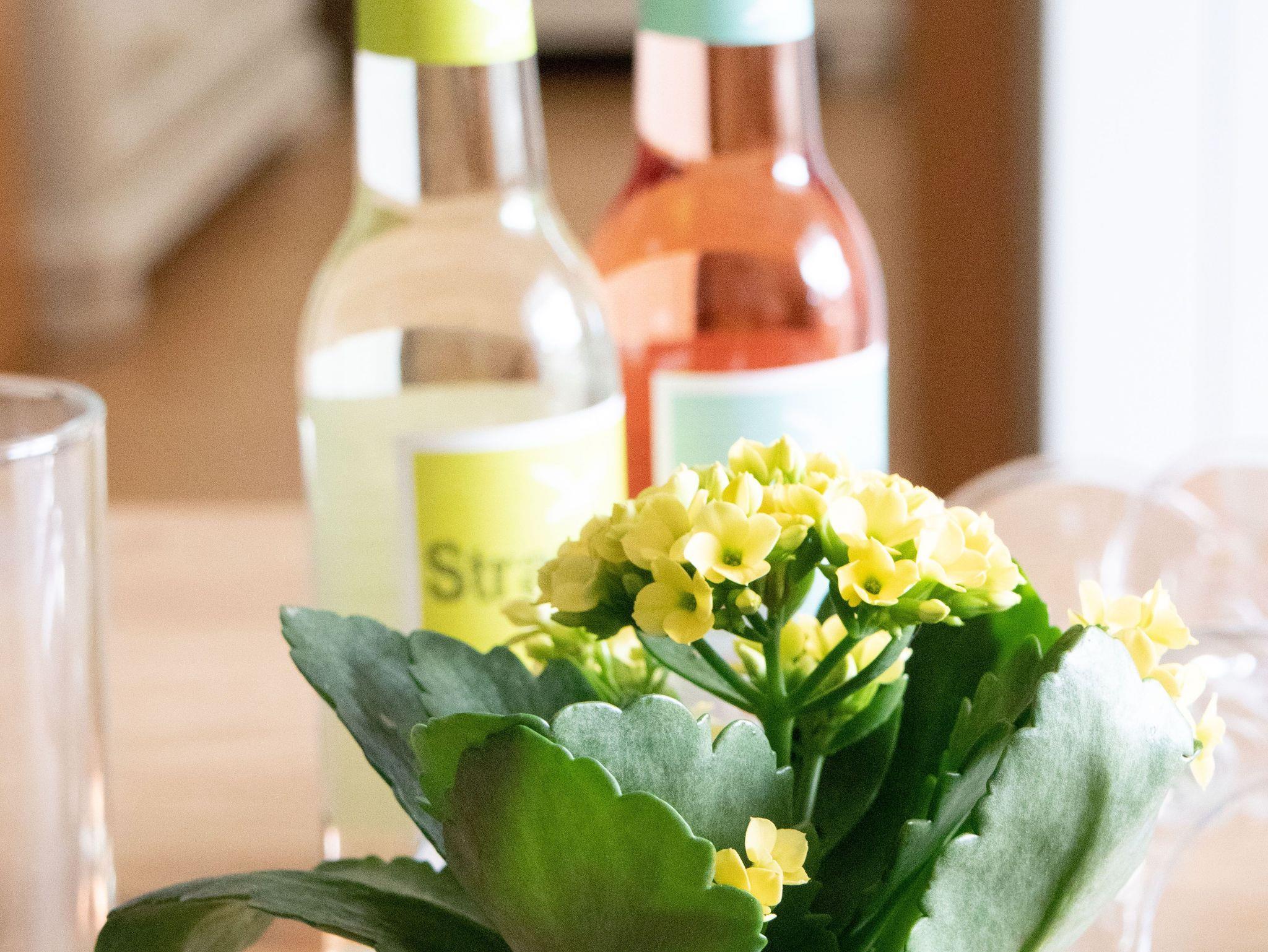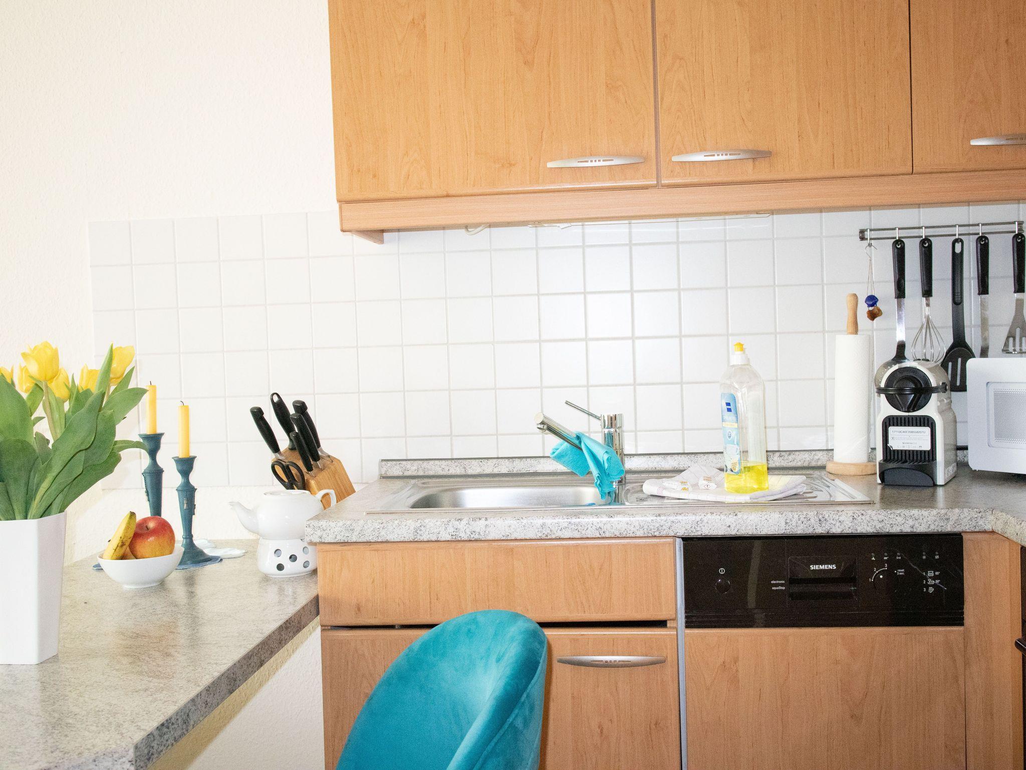 Die hier angrenzende Küchenzeile ist mit einem Kühlschrank mit Gefrierfach, einem Geschirrspüler und einem Backofen mit Kochfeld ausgestattet. Eine Kaffeemaschine, ein Toaster, ein Eierkocher und ein Wasserkocher stehen Ihnen hier selbstverständlich zur Verfügung.