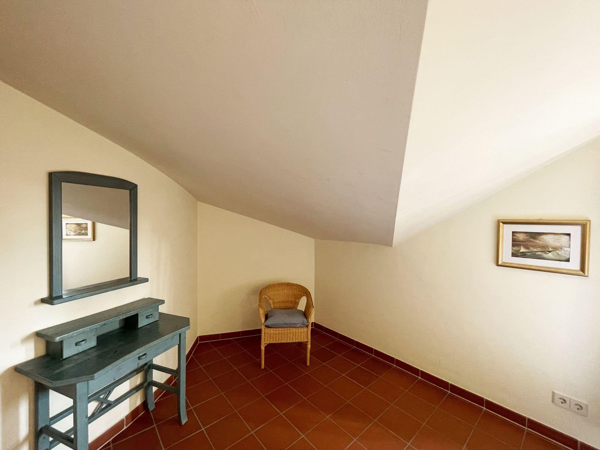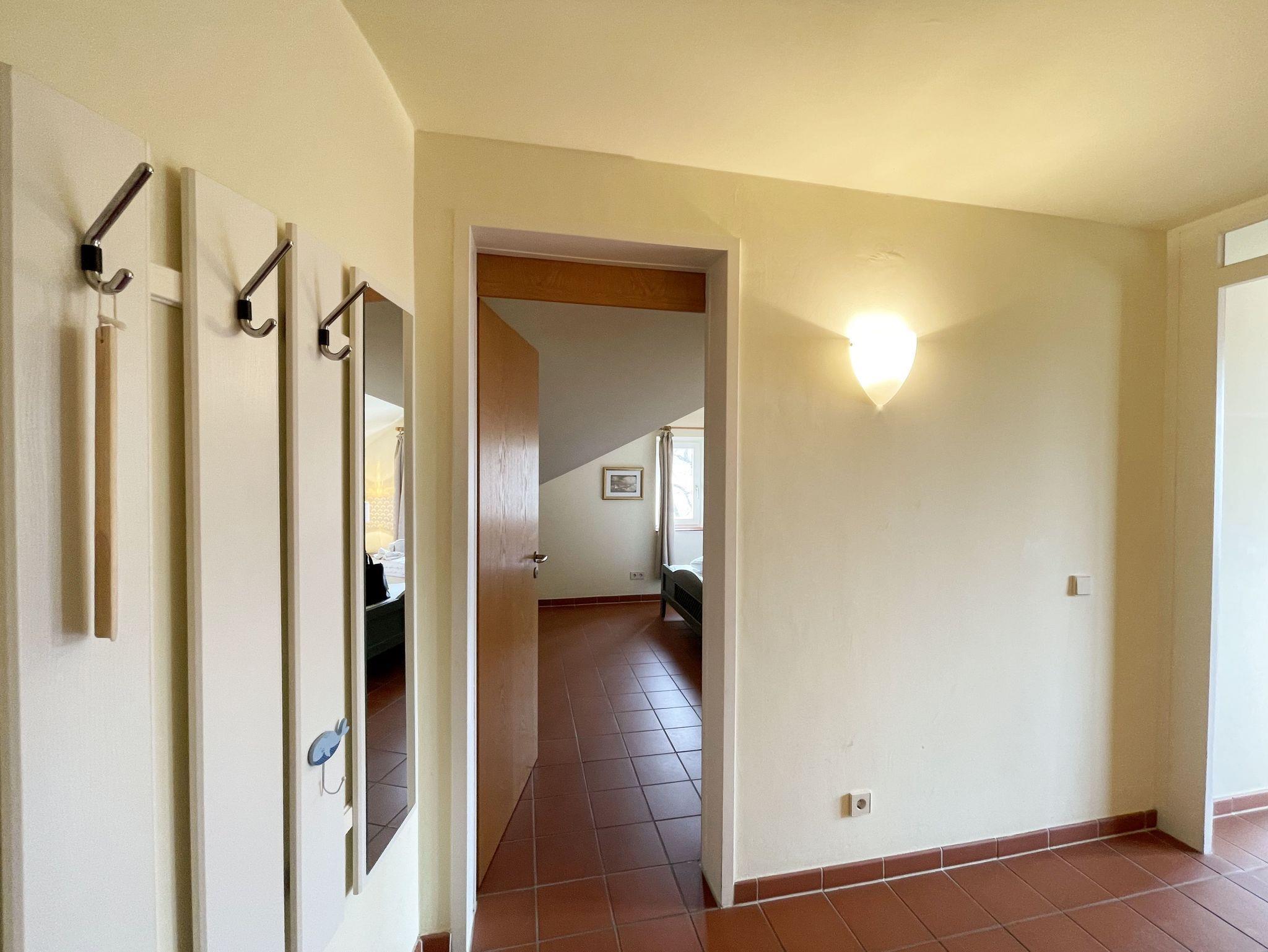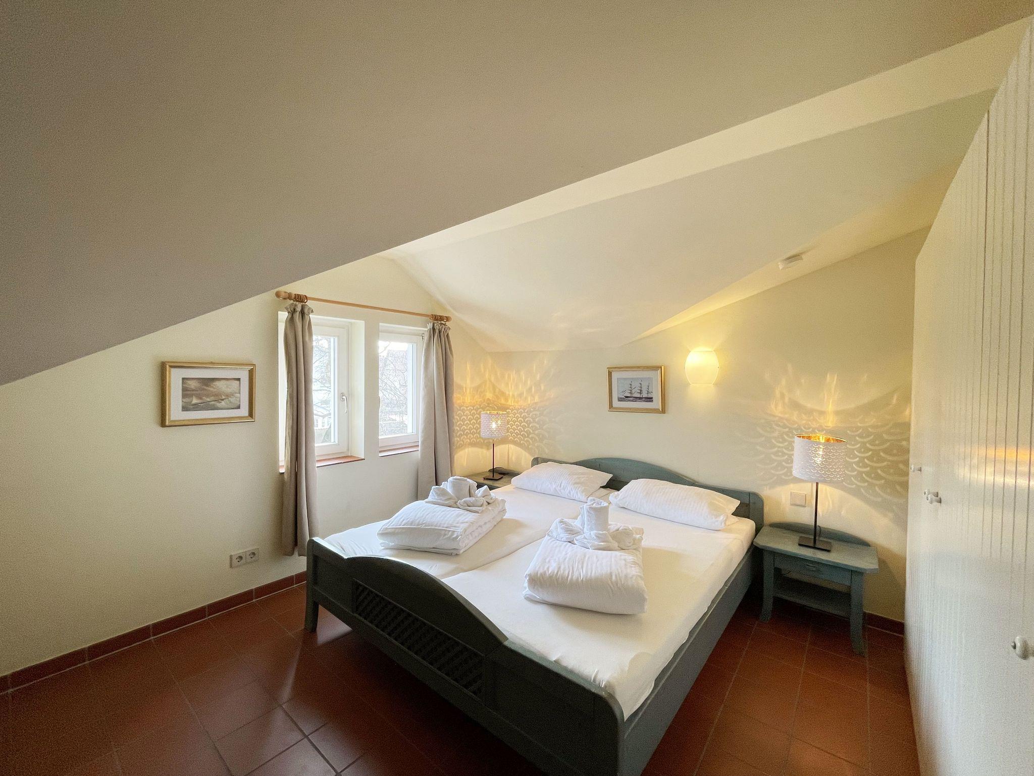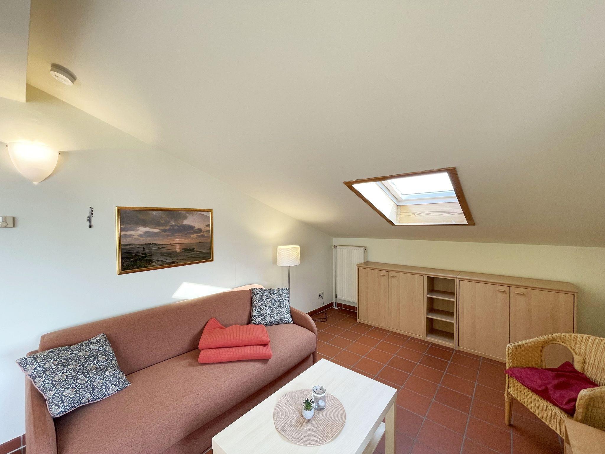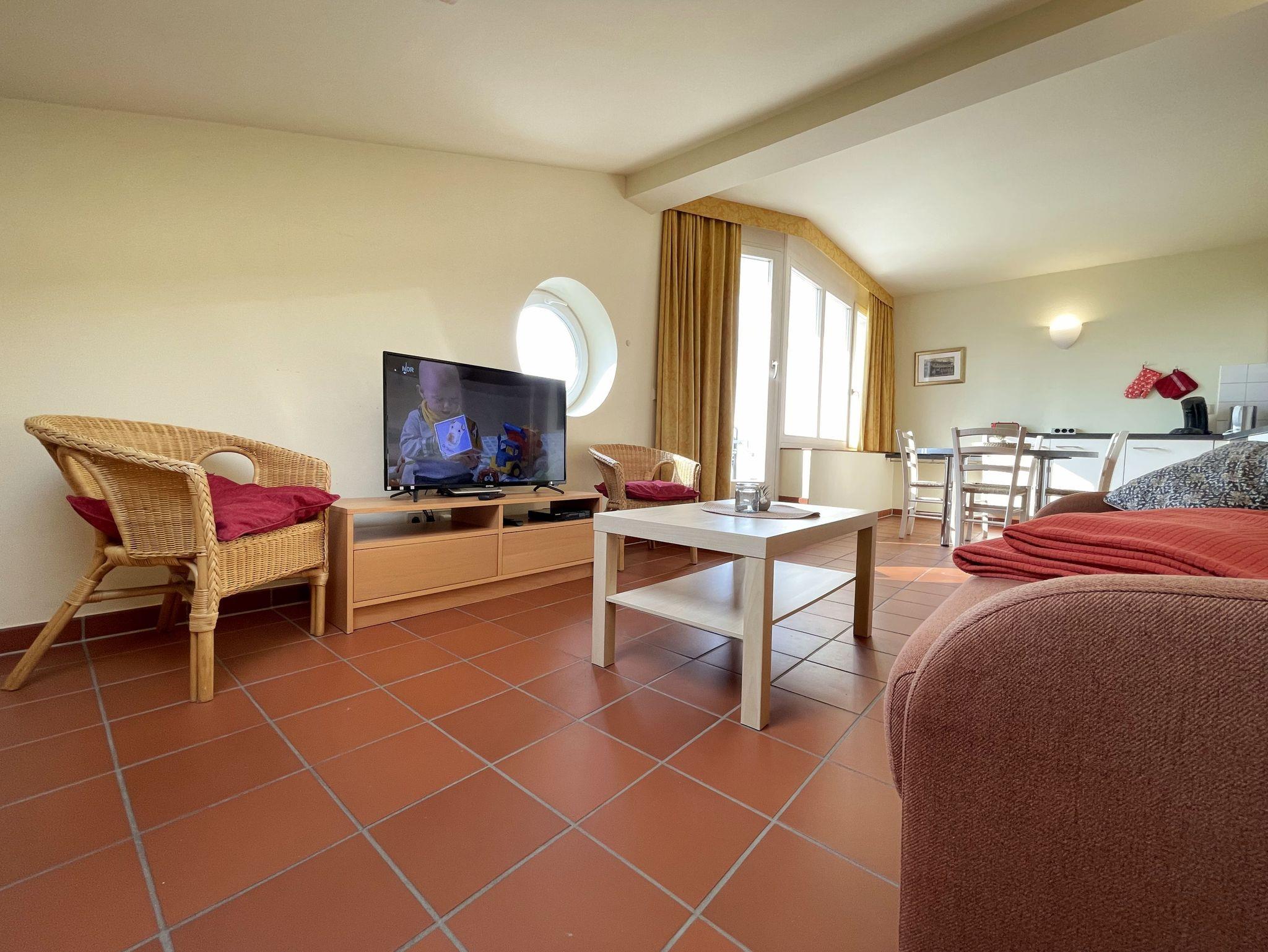 Die geräumige, nach Süd-West ausgerichtete 2-Zimmerwohnung ist etwa 40 qm groß und befindet sich im Dachgeschoss. Das Appartement ist für 2 bis 4 Personen geeignet. Im Wohnbereich finden Sie eine komfortable Schlafcouch (1,60m x 1,95m), einen LED-Fernseher, einen Essplatz für 4 Personen sowie die Küchenzeile. Sie ist mit Cerankochfeld, Spülmaschine, Backofen, Kaffeemaschine, Wasserkocher, Toaster, Kühlschrank mit Eisfach und allen wichtigen Küchenutensilien ausgestattet. An den Wohnbereich grenzt die nach Westen gerichtete, bestuhlte und sonnige Loggia mit Blick auf einen kleinen Park. Das gemütliche Schlafzimmer verfügt über ein Doppelbett (2 x 0,90 x 2,00 m) mit 7-Zonen-Matratzen, einen Kleiderschrank und eine Spiegelkommode. Das Bad ist mit WC, Waschbecken und Föhn ausgestattet. Die geräumige Dusche ist ebenerdig zu begehen und mit Glaswänden abgetrennt. In der kühleren Jahreszeit wärmt die angenehme Fußbodenheizung in allen Räumen den Terracottaboden. Auch im Urlaub brauchen Sie auf einen WLAN-Zugang nicht verzichten. Dieser ist für Sie inklusive vorhanden. Ein eigener Stellplatz Nr. 31 für Ihr Fahrzeug befindet sich hinter dem Haus. In einem separaten Raum können mitgebrachte oder geliehene Fahrräder abgeschlossen werden. Auch 1 Vierbeiner ist gegen eine Gebühr ein gern gesehener Gast. Die Erstausstattung eines Wäschepaketes (komplette Bettwäsche, 1 Duschhandtuch, 1 kleines Handtuch) können Sie bis 14 Tage vor Anreise dazu buchen oder durch eigene ergänzen. Ab 2 gebuchten Paketen erhalten Sie einmalig 1 Geschirrhandtuch und 1 Duschvorleger hinzu.