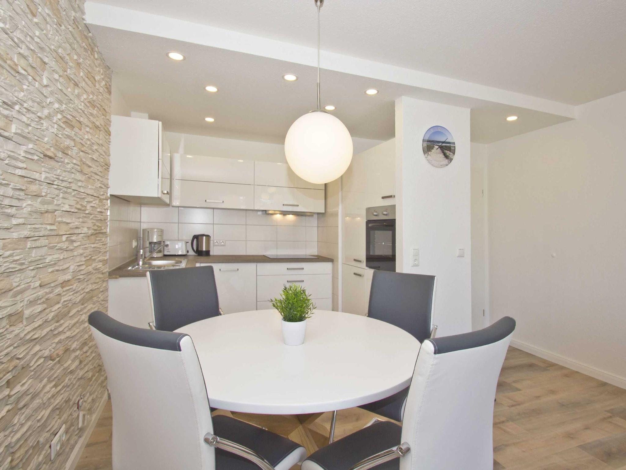 Kochen und Essen wird in der offenen Küche der Ferienwohnung in Göhren auf der Insel Rügen zu einem echten Leckerbissen. Der hell und freundlich konzipierte Raum im Raum schließt direkt an den Wohnbereich an und hält alles bereit, was Sie brauchen: ein hochwertiges Cerankochfeld mit vier Platten, einen Backofen sowie einen Toaster, einen Wasserkocher und eine Kaffeemaschine. Ein Kühlschrank ist ebenso vorhanden wie reichlich Küchenutensilien. Abgerundet wird die Küchenausstattung durch den Geschirrspüler, der den Abwasch für Sie erledigt. So können Sie in Ihrem Urlaub vollauf entspannen und müssen sich nicht um Nebensächlichkeiten kümmern. Ob Sie in der Ferienwohnung frühstücken, zu Mittag oder zu Abend essen: Der runde Esstisch mit vier modernen Sesseln bietet der ganzen Familie Platz.