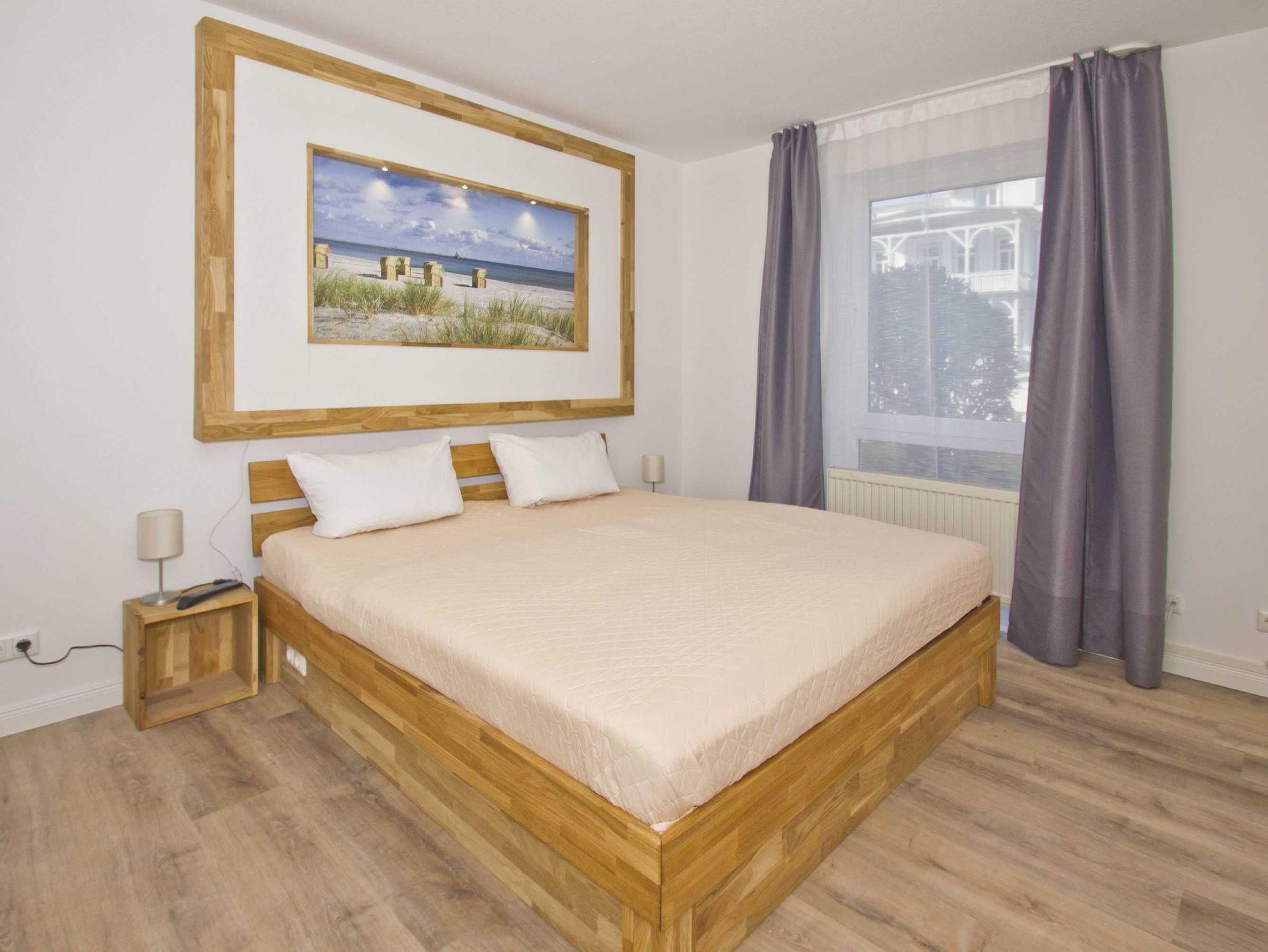 In der Ferienwohnung gibt es zwei Schlafzonen: zum einen das ausziehbare Schlafsofa im Wohnbereich und zum anderen das separate Schlafzimmer. Letzteres beherbergt ein 180 x 200 Zentimeter großes Doppelbett im charmanten Holzlook mit zwei dazu passenden kleinen Nachttischen. Über dem Bett erinnert Sie ein mächtig erwärmendes Bild an die pure Schönheit des Ortes, in dem Sie sich momentan aufhalten: Der Anblick des prächtigen Strandes vor dem weiten Meer geleitet Sie sicherlich in berauschende Träume. Des Weiteren finden Sie in der Räumlichkeit einen weißen Kleiderschrank und einen kleineren Flachbild-TV, der gegenüber des Schlafgemachs leicht erhöht angebracht ist.