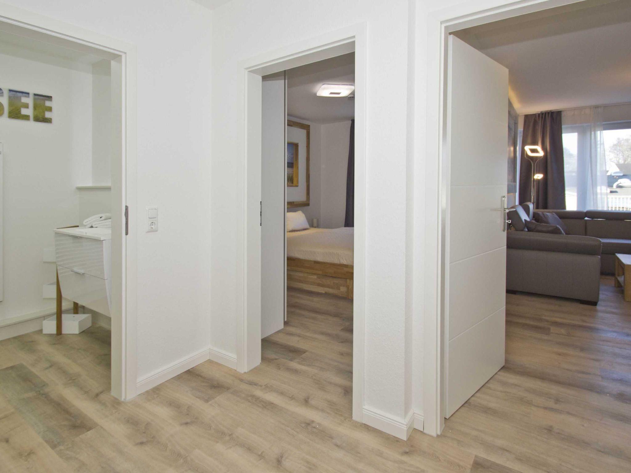Wie der Rest der Ferienwohnung im Haus Nordstrand ist auch das Badezimmer sehr hell gestaltet. Die edle Kombination aus reinem Weiß und ausstrahlungsreichen Holztönen beschert Ihnen am Morgen vor den bevorstehenden Abenteuern einen stimmungsvollen Start in den Tag und am Abend nach den betörenden Erlebnissen an der Ostsee einen runden Abschluss. Apropos Ostsee: Beim Duschen in der modernen Kabine mit flachem Einstieg haben Sie die Möglichkeit, gedanklich schon oder wieder im Meer zu baden - dank der attraktiven Wandgestaltung über der Heizung. Zudem umfasst das Badezimmer der Ferienwohnung ein WC und ein Waschbecken mit eckigem Spiegel sowie praktischen Ablageflächen und Verstauungsoptionen für Ihre Kosmetika.