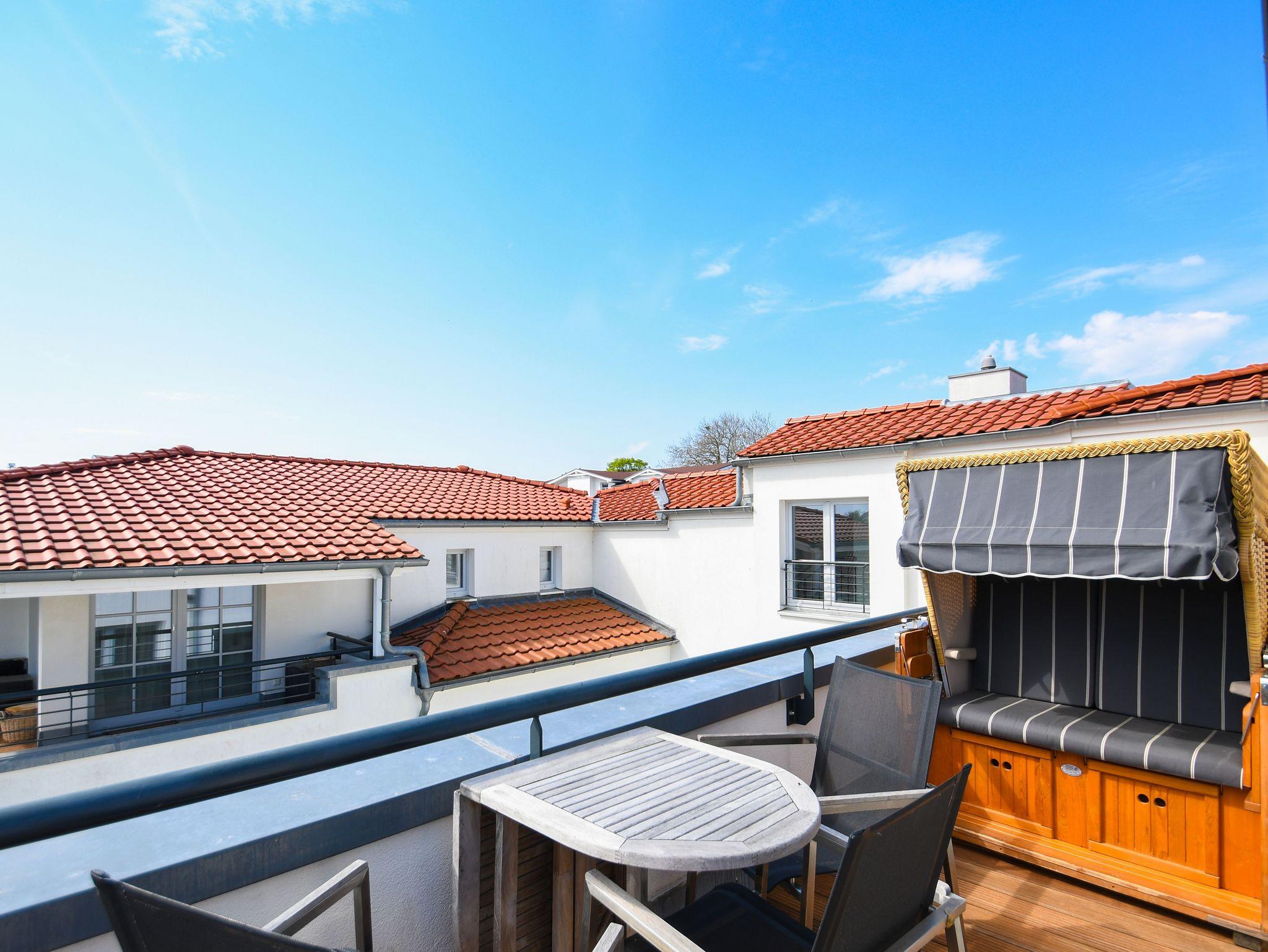 • Vom Wohnzimmer aus gelangen Sie auf den großen Balkon mit Meerblick und Strandkorb. Wem es hier zu warm werden sollte, weicht auf den kleineren Schlafzimmerbalkon in Nord-Westausrichtung aus. Auch hier stehen bequeme Sitzmöbel für den Nachmittagskaffee bereit.