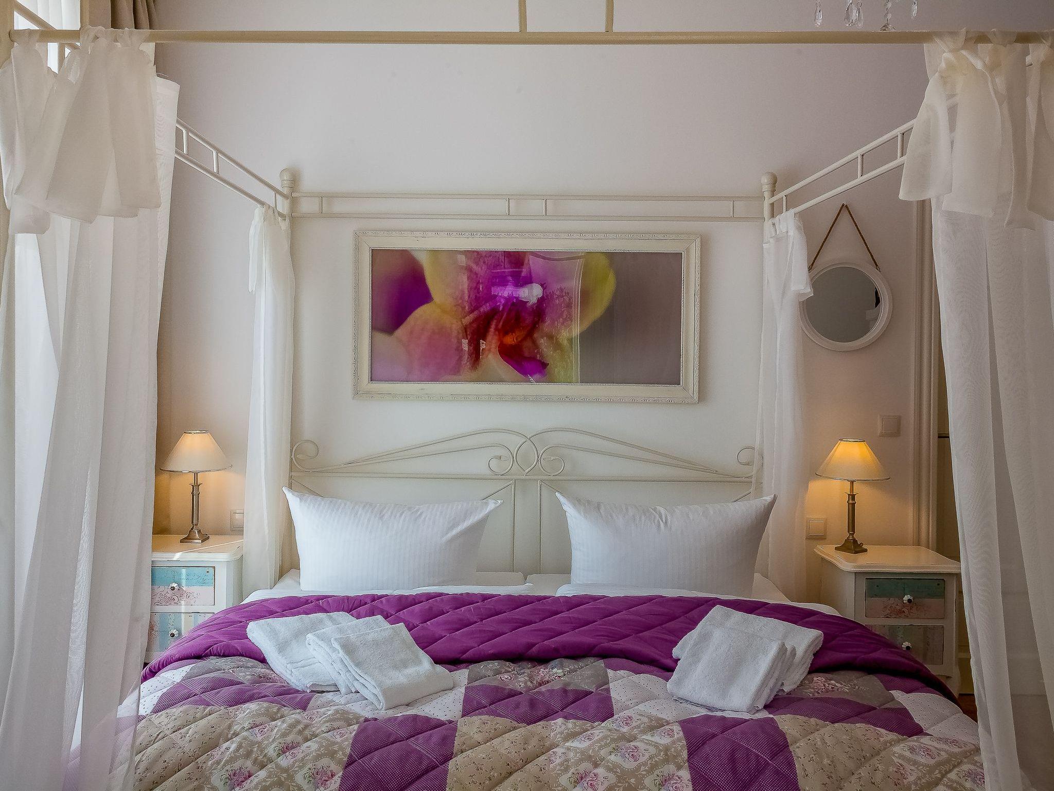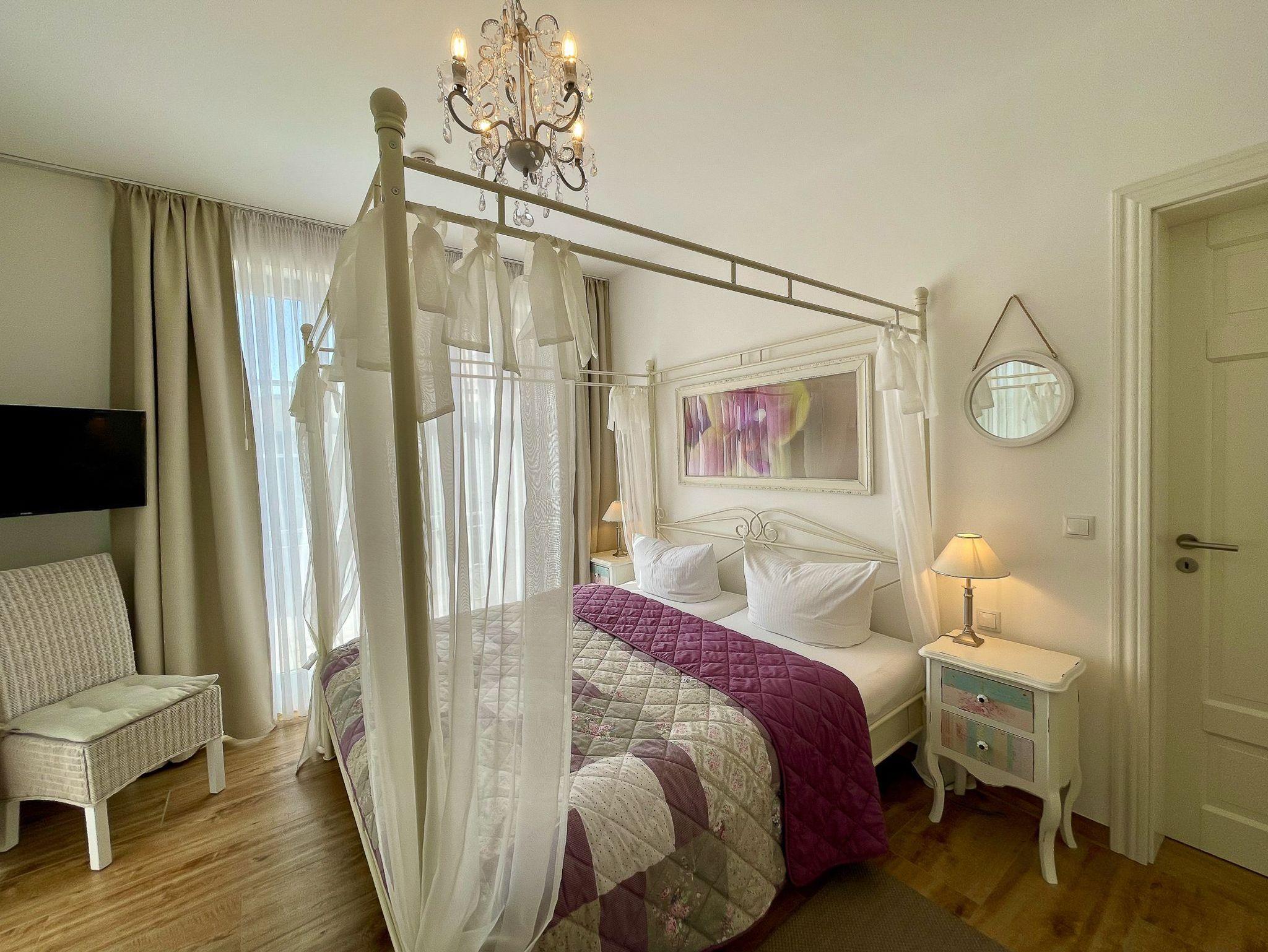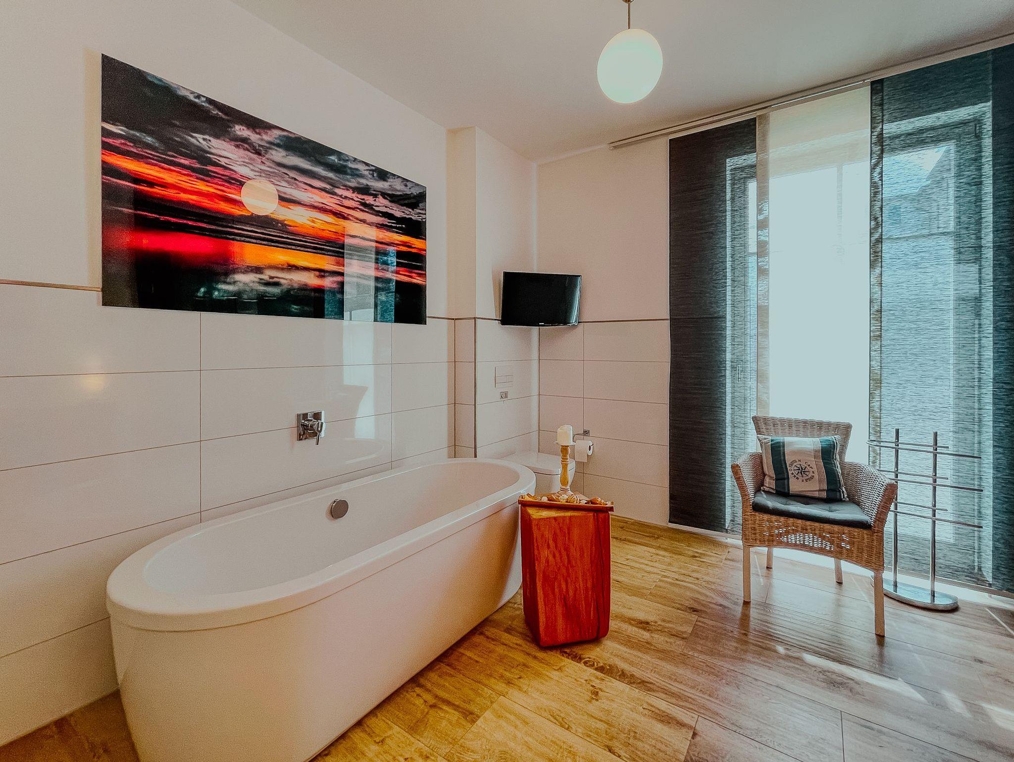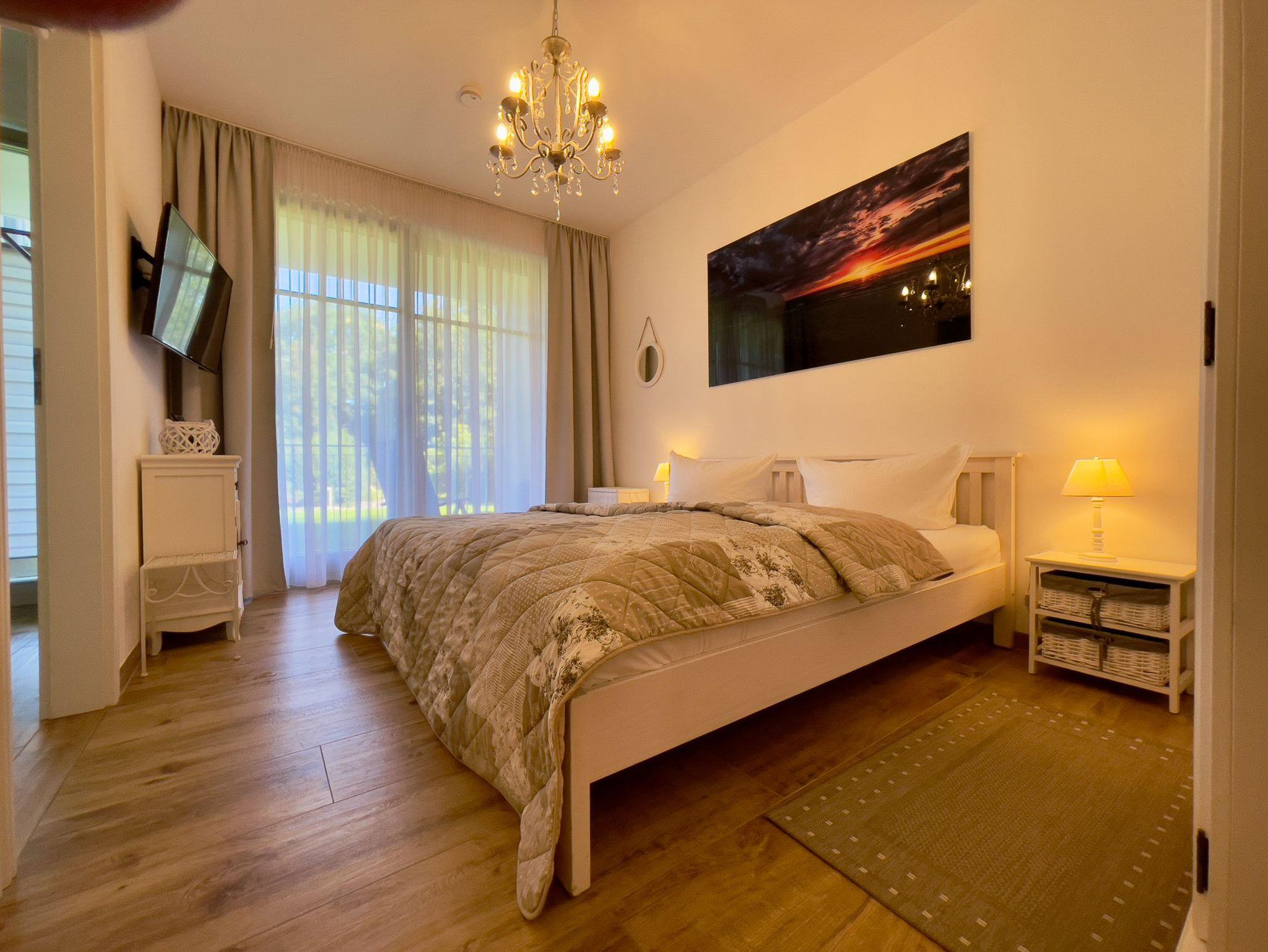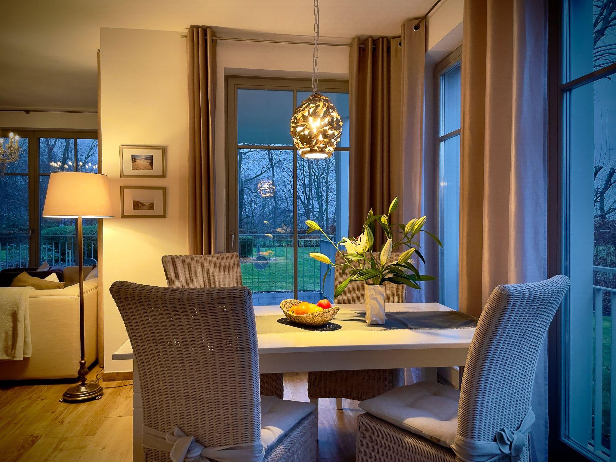Die exklusive Ausstattung der FeWo Strand-Idyll mit eigener Sauna, Badewanne, großen Wellness- und Regenduschen, W-LAN mit Smart-TV's und vielen anderen Ausstattungsmerkmalen eignet sich auf Grund der zwei Schlafzimmer mit je einem separaten Bad besonders für Familien (auch mit großem Kind und Schwiegerkind), zwei befreundeten Pärchen (2 Parkplätze vorhanden) oder Familien mit Personen, die es vom Auto bis in die Wohnung bequem haben wollen (ebenerdig/ breite Türen). Sie können zwei Terrassen nutzen. Auf Grund der Fußbodenheizung, der Sauna, dem Kamin und der freistehenden Badewanne eignet sich diese Wohnung auch für einen entspannten Urlaub in der Neben- oder Wintersaison. Die Wohnung liegt auf der ruhigen Seite einer Ostseearchitektur-Villa mit Blick auf den Küstenwald. Das Rauschen der Ostseewellen und das Singen der Vögel wird Sie entspannen?