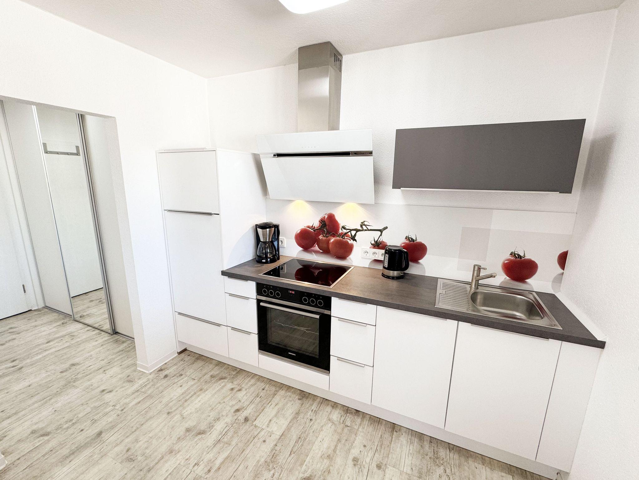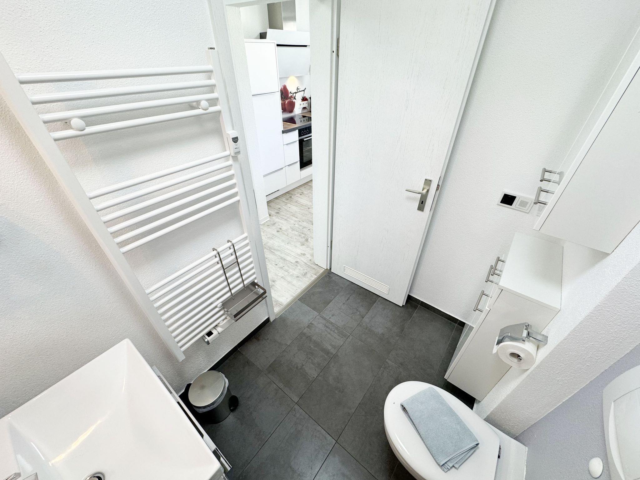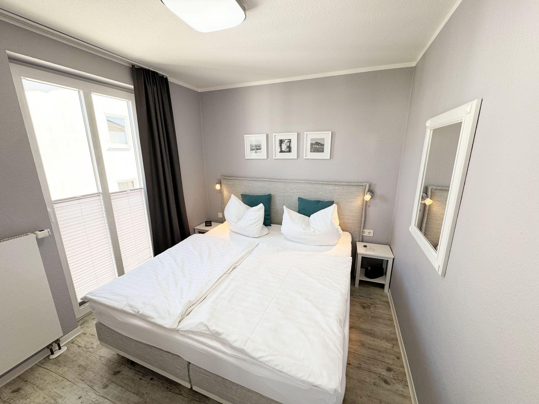 Die Nichtraucherwohnung 31 befindet sich im 2. Obergeschoss und ist ca. 40 m² groß. Sie ist in einem modernen Design hell und Allergiker freundlich gestaltet und komfortabel für max. 2 Personen + 1 Kleinkind bis 3 Jahre im Kinderreisebett eingerichtet. Der freundliche Eingangsbereich bietet einen deckenhohen Einbauschrank mit viel Platz für Ihre Kleidung und einem sehr großen Spiegel. Außerdem finden Sie hier eine Schuhablage mit Sitzbank. Im lichtdurchfluteten Wohnbereich lässt es sich nach einem erlebnisreichen Urlaubstag wunderbar relaxen, hier finden Sie eine hochwertige Couch, einen Couchtisch, eine Leselampe, einen Essbereich mit 2 bequemen Freischwingstühlen sowie einen Smart-TV mit Sky (Auswahl von Sport, Film, Dokumentation) und ein CD-Radio. Mit einem spannenden Buch (eine Auswahl von Büchern finden Sie in der Wohnung) oder einem guten Glas Wein können Sie den Tag ausklingen lassen. Auch im Urlaub brauchen Sie auf einen WLAN-Zugang (20 Mbit) nicht verzichten, denn dieser ist für Sie inklusive. Vom Wohnbereich gelangen Sie auf den ca. 12 m² großen und bestuhlten Balkon (Nordost), welcher Sie zum sonnigen Frühstück oder zur Entspannung auf den bequemen Sonnenliegen einlädt. Die offene und moderne Küchenzeile ist mit allem Komfort und hochwertigen Elektrogeräten ausgestattet. Dazu gehören Mikrowelle, Backofen, Induktionskochfeld, Geschirrspüler, Kühlschrank mit Gefrierfach, Toaster, Wasserkocher, Dolce Gusto Maschine, Kaffeemaschine und diverse Küchenutensilien. In dem geschmackvoll eingerichteten Schlafzimmer können Sie in dem Boxspringbett (1,80m x 2,00m) mit komfortablen Topper und Nachttischablagen wunderbar neue Energie tanken. Für einen erholsamen Schlaf sorgt hier ein Verdunkelungsvorhang. Das innenliegende Bad, welches durch die Beleuchtung sehr hell erscheint, ist komplett eingerichtet. Es beinhaltet neben Waschbecken mit Unterschrank, eine Dusche mit sehr niedrigem Einstieg, ein WC, einen separaten Badschrank, ein eingebautes Radio, einen Föhn, einen Kosmetikspiegel, einen Handtuchheizkörper sowie große Ablageflächen. Alle Fenster sind mit Plissees versehen worden. Die Wohnung verfügt über einen PKW-Stellplatz in der Schulstrasse, ca. 4 Gehminuten entfernt. Zusätzlich haben Sie einen Waschmaschinen/Trocknerraum im Haus den Sie exklusive nutzen können. Haustiere sind in der Wohnung nicht erlaubt. Die Erstausstattung eines Wäschepaketes (komplette Bettwäsche, 1 Duschhandtuch, 2 kleine Handtücher, 2 Geschirrhandtücher) können Sie bis 14 Tage vor Anreise gegen einen Aufpreis dazu buchen oder durch eigene ergänzen.