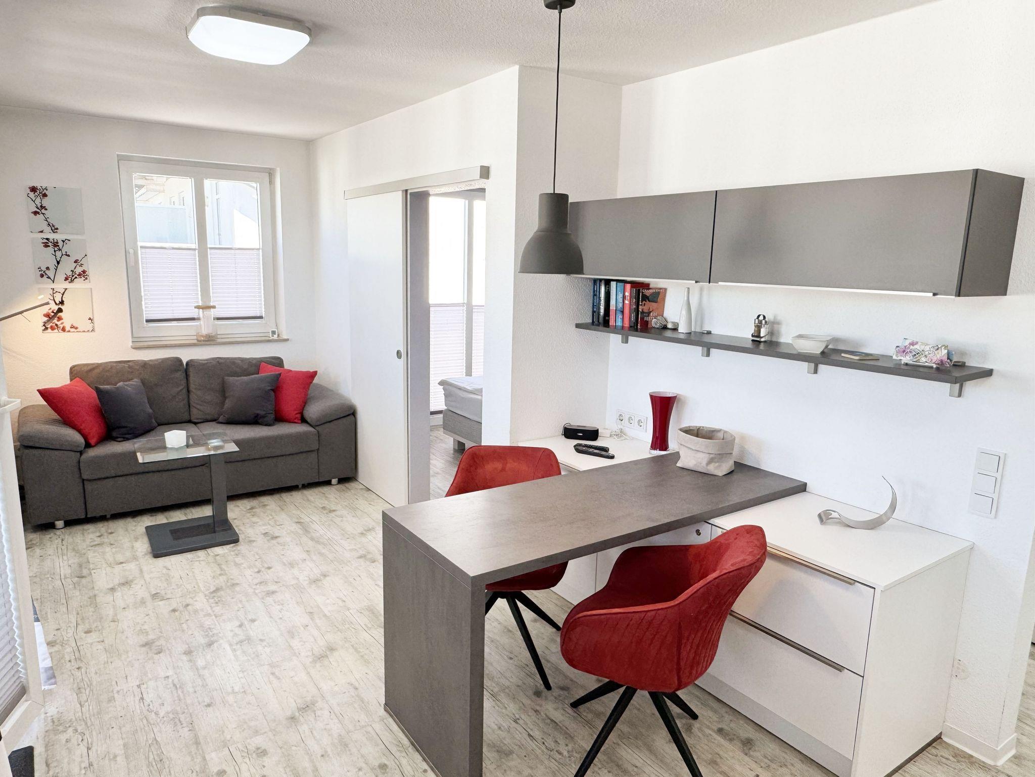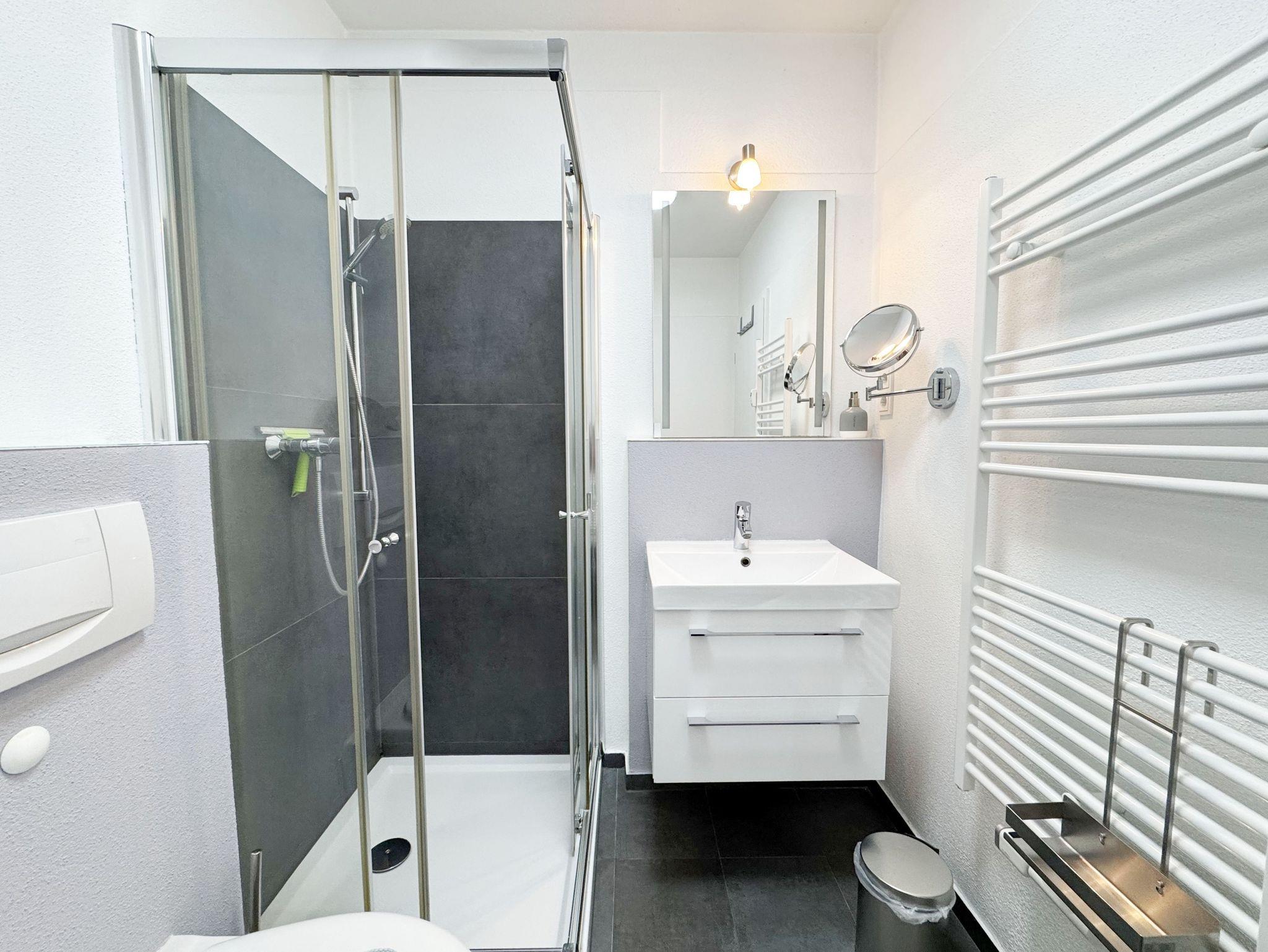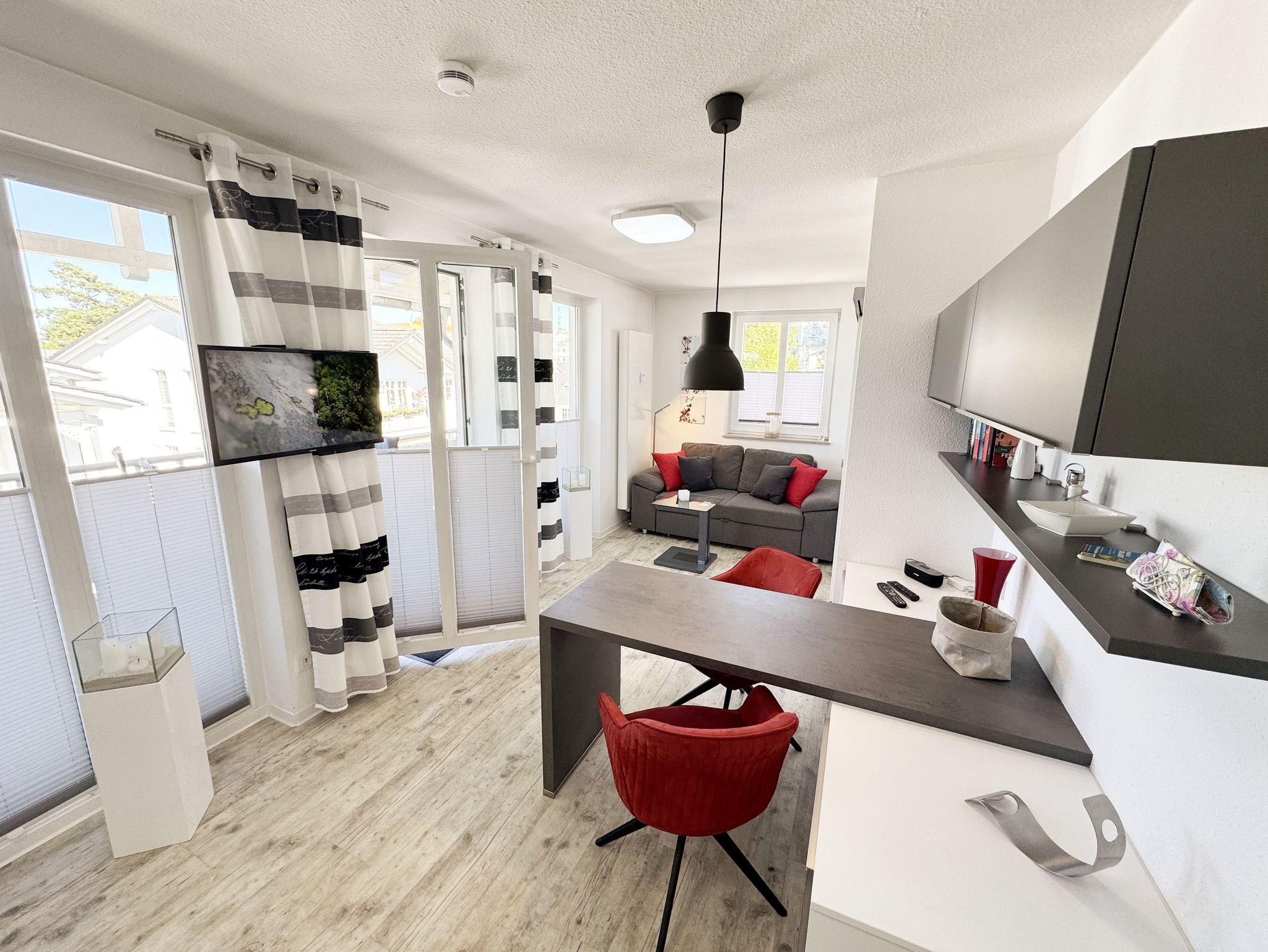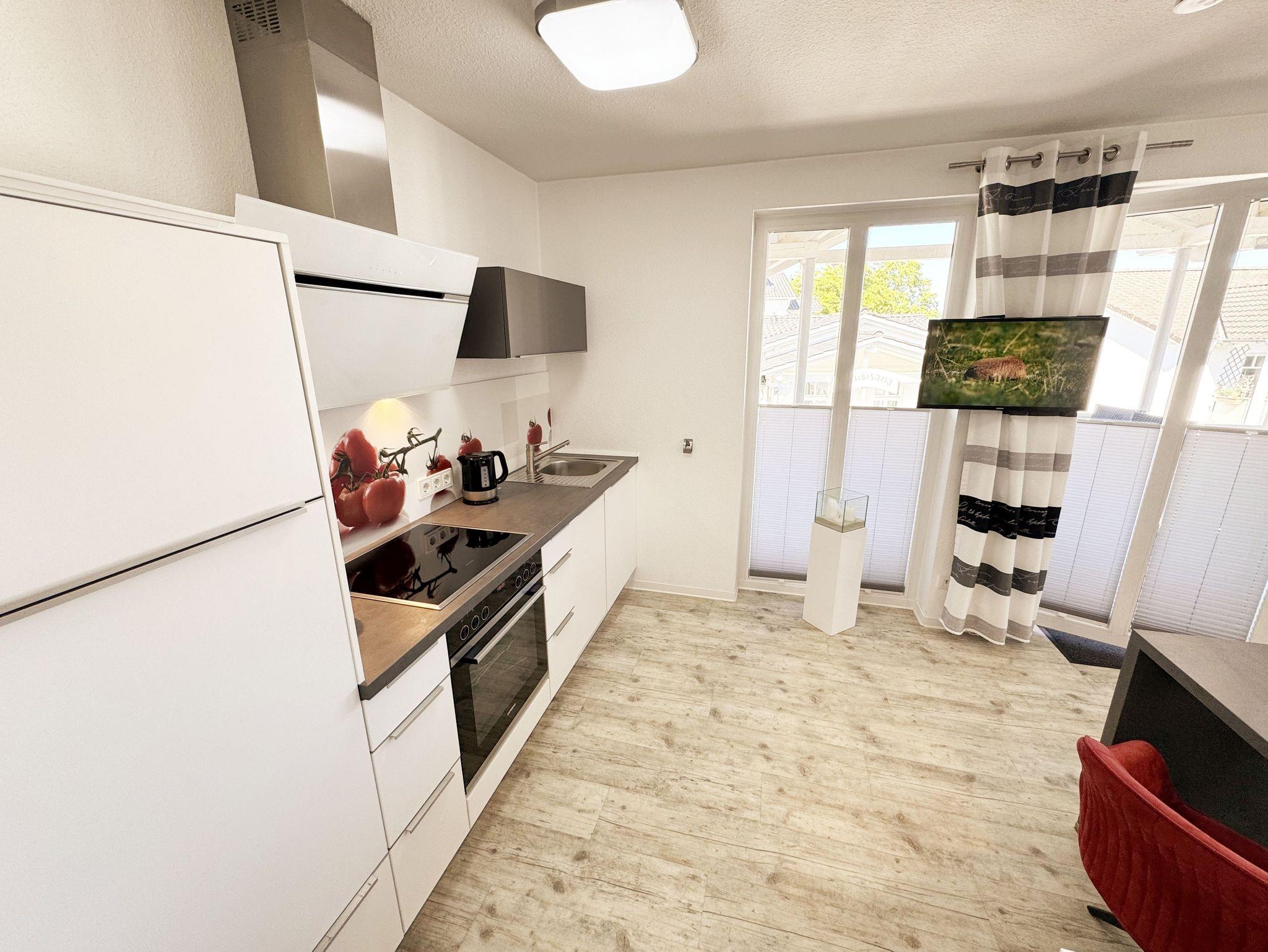 Die Nichtraucherwohnung 31 befindet sich im 2. Obergeschoss und ist ca. 40 m² groß. Sie ist in einem modernen Design hell und Allergiker freundlich gestaltet und komfortabel für max. 2 Personen + 1 Kleinkind bis 3 Jahre im Kinderreisebett eingerichtet. Der freundliche Eingangsbereich bietet einen deckenhohen Einbauschrank mit viel Platz für Ihre Kleidung und einem sehr großen Spiegel. Außerdem finden Sie hier eine Schuhablage mit Sitzbank. Im lichtdurchfluteten Wohnbereich lässt es sich nach einem erlebnisreichen Urlaubstag wunderbar relaxen, hier finden Sie eine hochwertige Couch, einen Couchtisch, eine Leselampe, einen Essbereich mit 2 bequemen Freischwingstühlen sowie einen Smart-TV mit Sky (Auswahl von Sport, Film, Dokumentation) und ein CD-Radio. Mit einem spannenden Buch (eine Auswahl von Büchern finden Sie in der Wohnung) oder einem guten Glas Wein können Sie den Tag ausklingen lassen. Auch im Urlaub brauchen Sie auf einen WLAN-Zugang (20 Mbit) nicht verzichten, denn dieser ist für Sie inklusive. Vom Wohnbereich gelangen Sie auf den ca. 12 m² großen und bestuhlten Balkon (Nordost), welcher Sie zum sonnigen Frühstück oder zur Entspannung auf den bequemen Sonnenliegen einlädt. Die offene und moderne Küchenzeile ist mit allem Komfort und hochwertigen Elektrogeräten ausgestattet. Dazu gehören Mikrowelle, Backofen, Induktionskochfeld, Geschirrspüler, Kühlschrank mit Gefrierfach, Toaster, Wasserkocher, Dolce Gusto Maschine, Kaffeemaschine und diverse Küchenutensilien. In dem geschmackvoll eingerichteten Schlafzimmer können Sie in dem Boxspringbett (1,80m x 2,00m) mit komfortablen Topper und Nachttischablagen wunderbar neue Energie tanken. Für einen erholsamen Schlaf sorgt hier ein Verdunkelungsvorhang. Das innenliegende Bad, welches durch die Beleuchtung sehr hell erscheint, ist komplett eingerichtet. Es beinhaltet neben Waschbecken mit Unterschrank, eine Dusche mit sehr niedrigem Einstieg, ein WC, einen separaten Badschrank, ein eingebautes Radio, einen Föhn, einen Kosmetikspiegel, einen Handtuchheizkörper sowie große Ablageflächen. Alle Fenster sind mit Plissees versehen worden. Die Wohnung verfügt über einen PKW-Stellplatz in der Schulstrasse, ca. 4 Gehminuten entfernt. Zusätzlich haben Sie einen Waschmaschinen/Trocknerraum im Haus den Sie exklusive nutzen können. Haustiere sind in der Wohnung nicht erlaubt. Die Erstausstattung eines Wäschepaketes (komplette Bettwäsche, 1 Duschhandtuch, 2 kleine Handtücher, 2 Geschirrhandtücher) können Sie bis 14 Tage vor Anreise gegen einen Aufpreis dazu buchen oder durch eigene ergänzen.