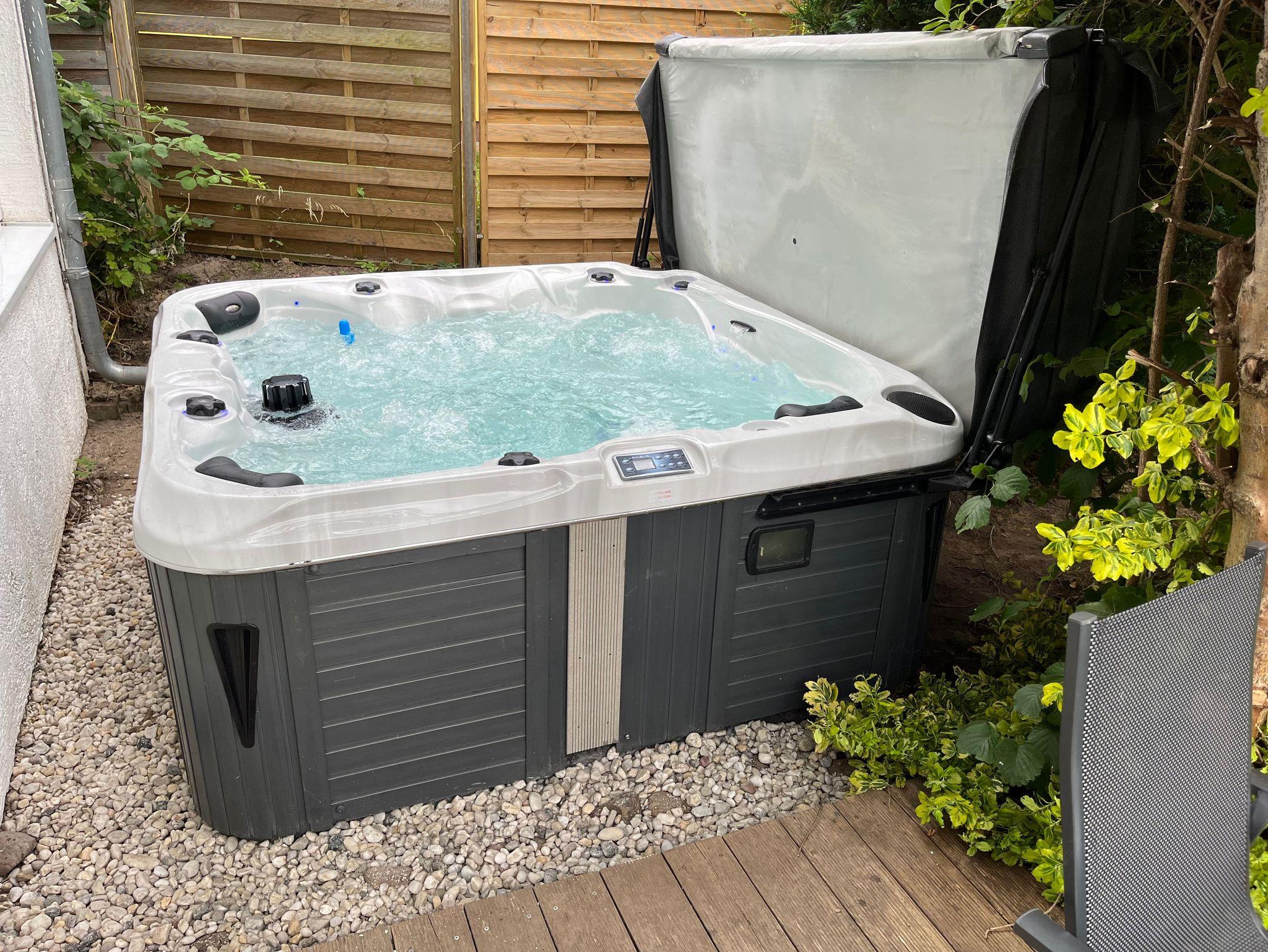 Haus mit Whirlpool zur alleinigen Nutzung und Wärmekabine, Schlafzimmer, Dachterrasse und Terrasse im Erdgeschoss, Wohnzimmer, Bad und Küche, Stellplatz und schnellem Wlan.