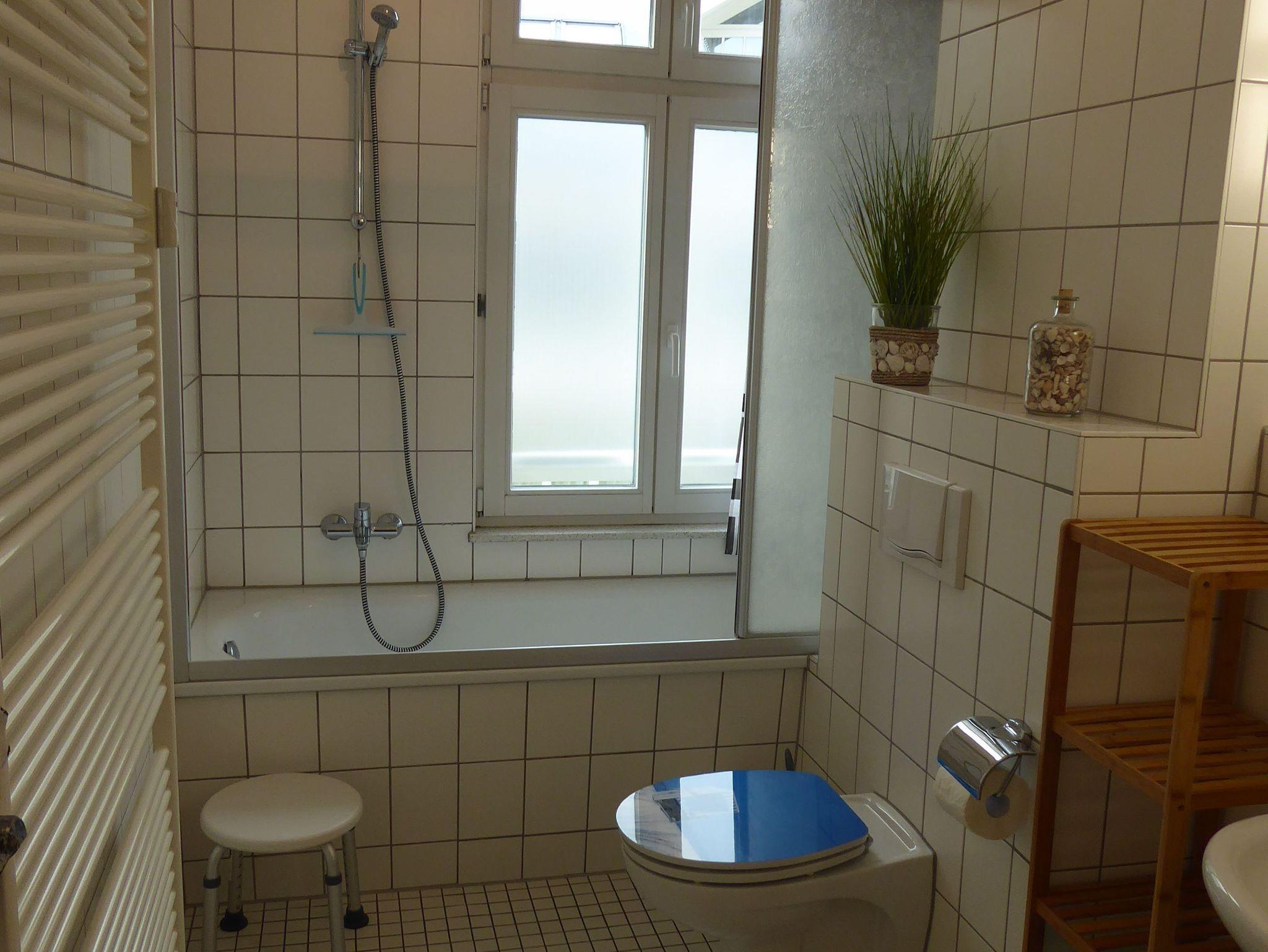 Badezimmer: Badewanne/ Dusche, großer beleuchteter Spiegel, Fön, Waschbecken, WC, Handtuchheizkörper