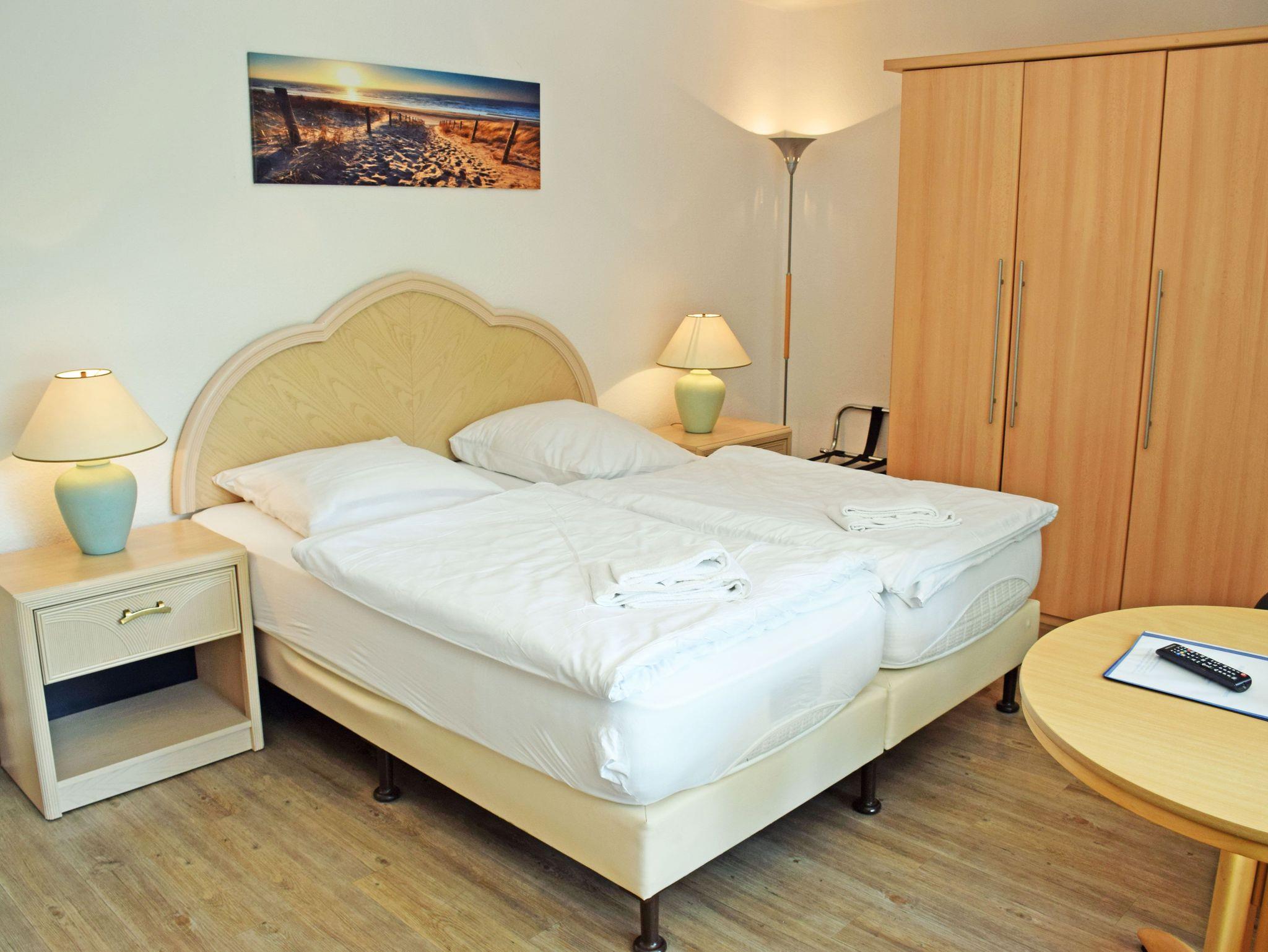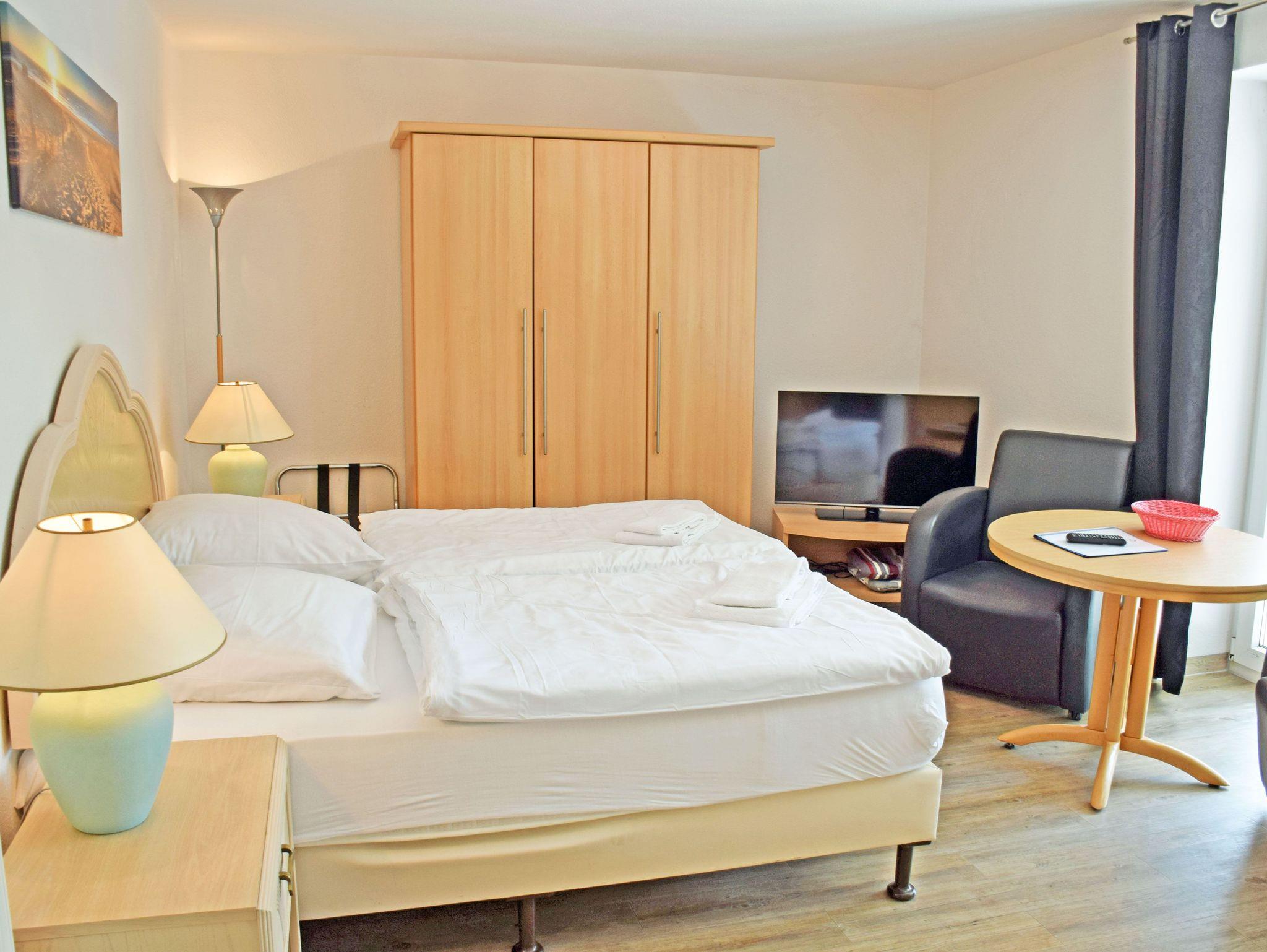 kombinierter Wohn-/Schlafraum mit Doppelbett (180 x 200 cm), Nachttischen, großem Kleiderschrank, Tisch mit 2 Ledersesseln, Anrichte mit TV, Kofferablage