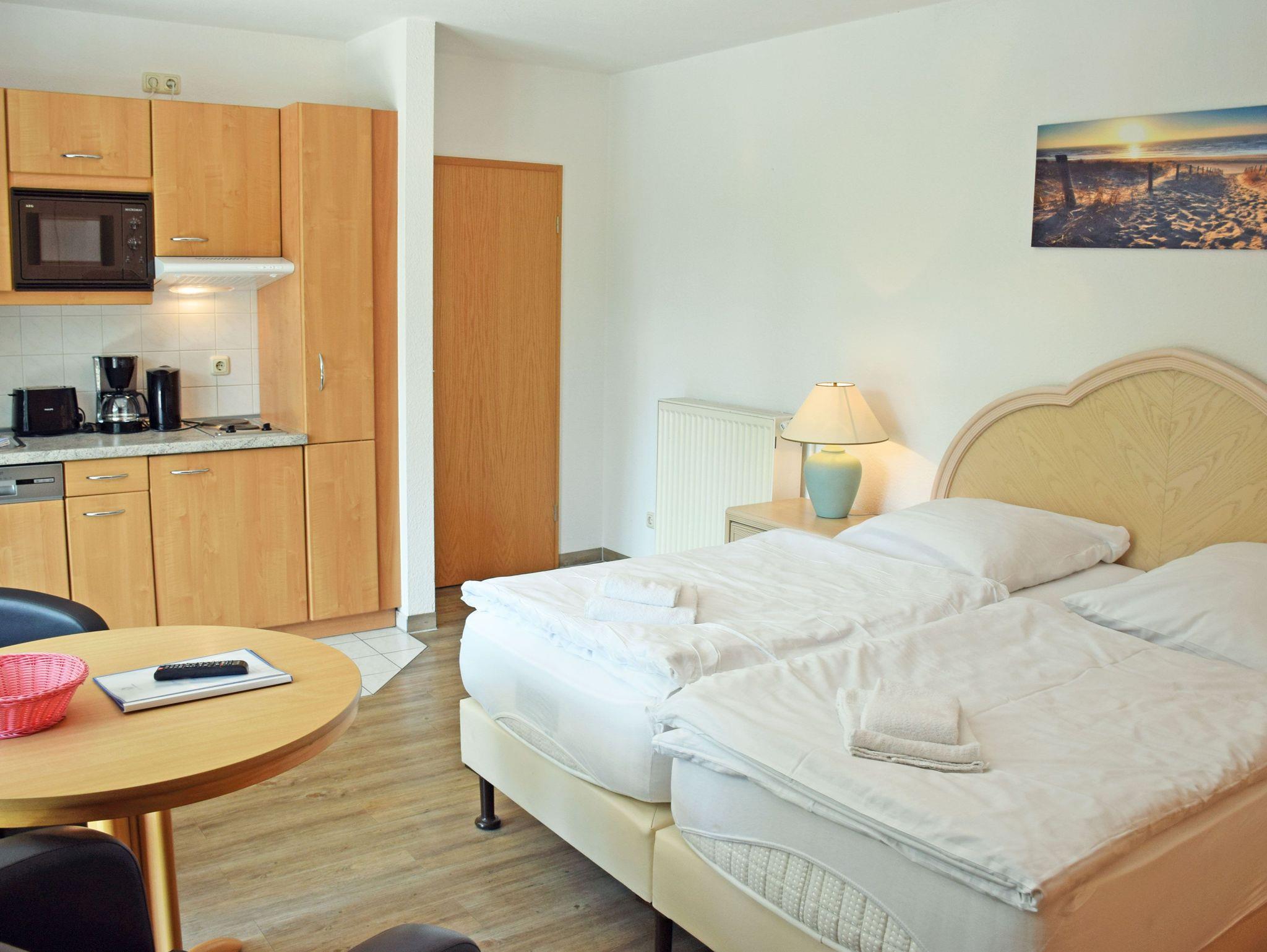 Unsere ruhig gelegenen, hellen und lichtdurchfluteten 1-Raum-Ferienwohnungen mit Balkon oder Terrasse sind wie folgt ausgestattet: