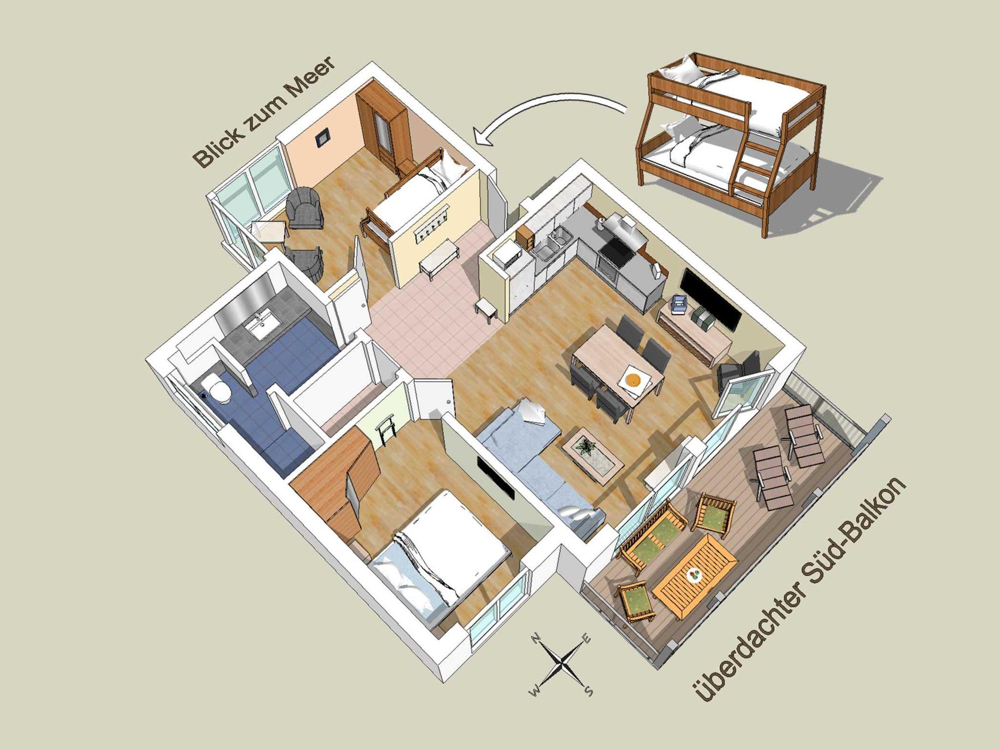 Moderne Wohnung in Villa Bergfrieden Süd mit Meerblick, Sauna und überdachtem Südbalkon nahe Strand und Natur.