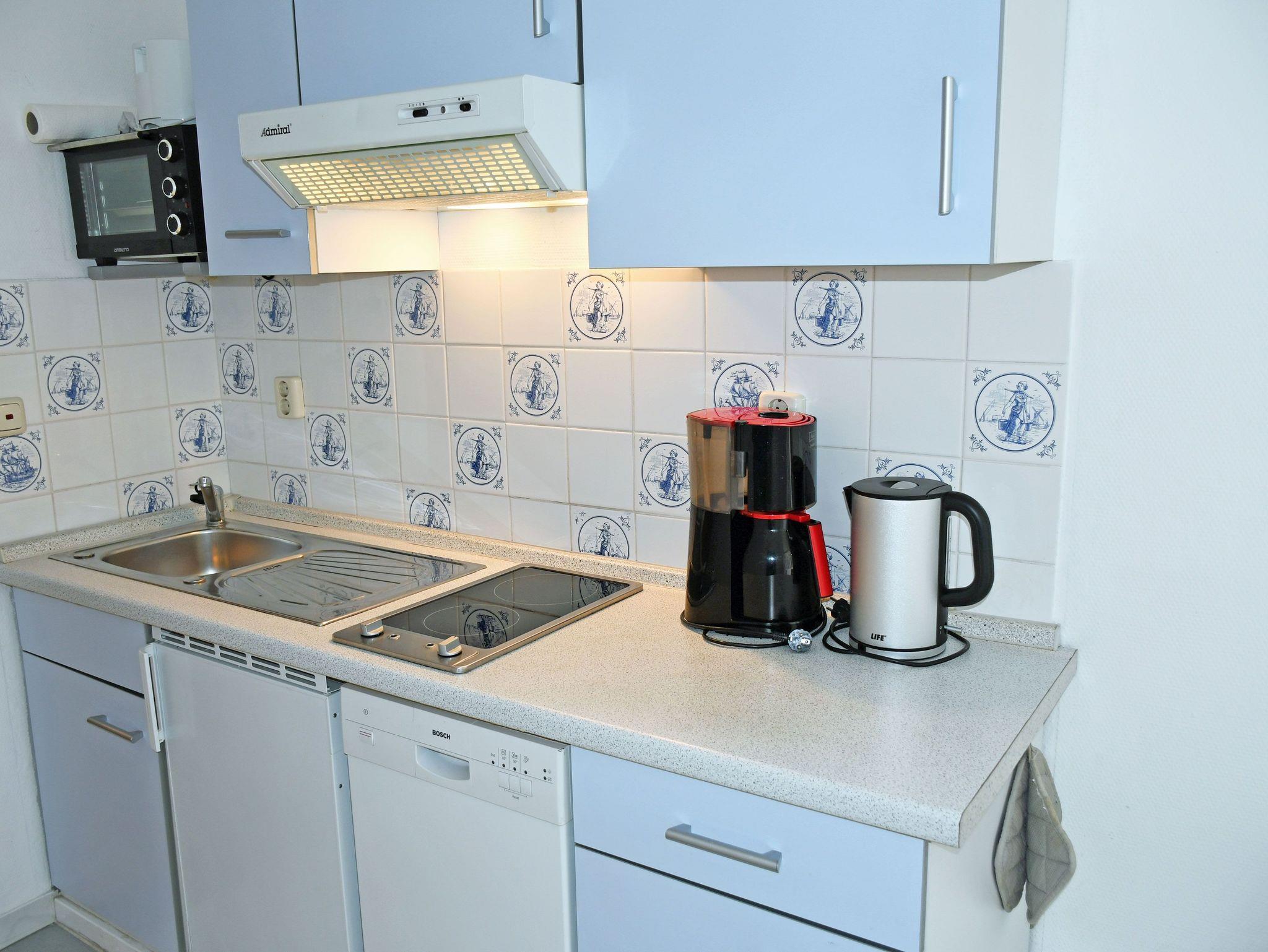 * separate Einbauküche mit 2- Platten-Kochfeld, Backofen, Kühlschrank mit Gefrierfach, Toaster, Kaffeemaschine,