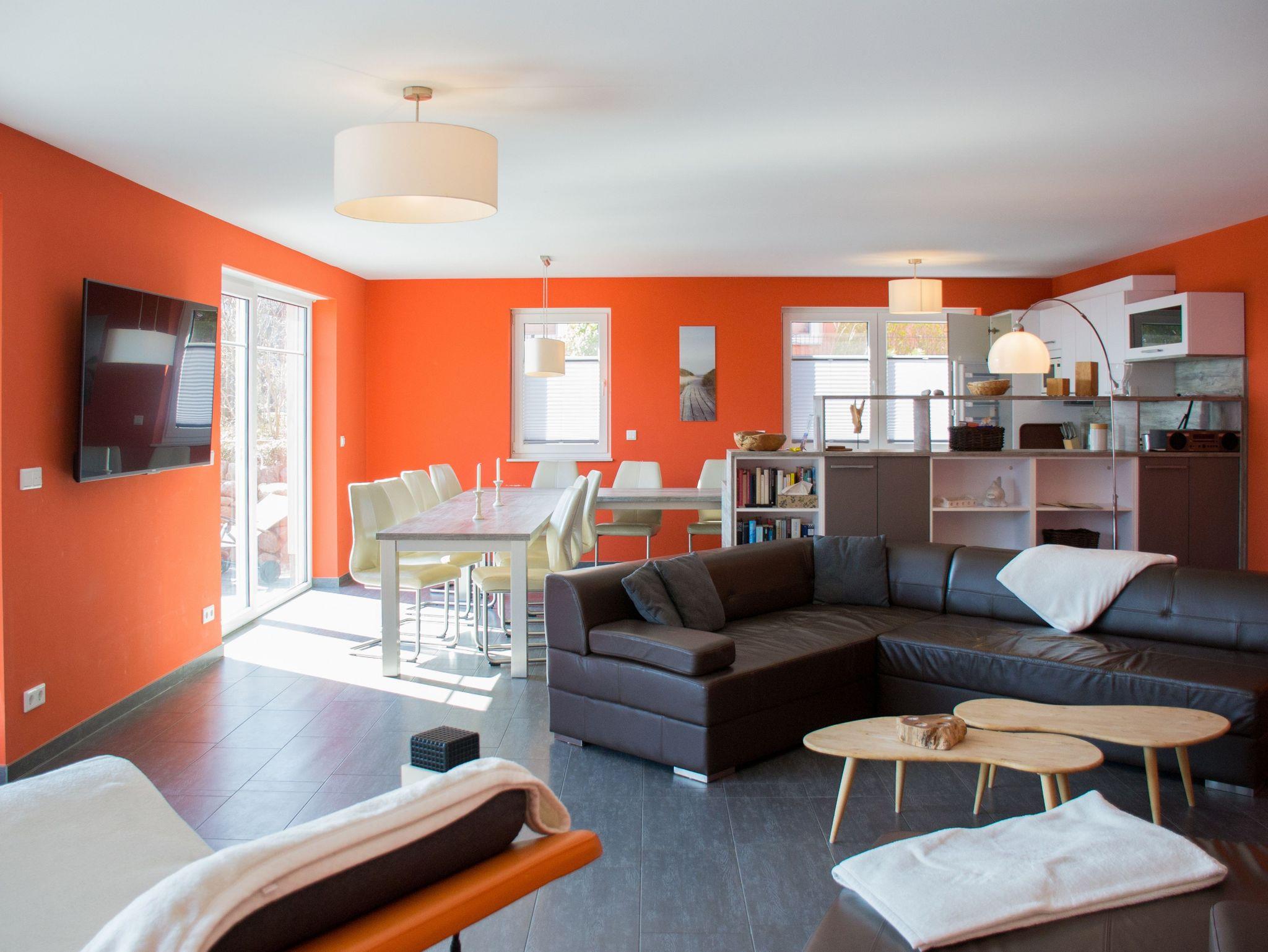 geräumiges Wohnzimmer mit einer großen offenen Küche und 2 modernes