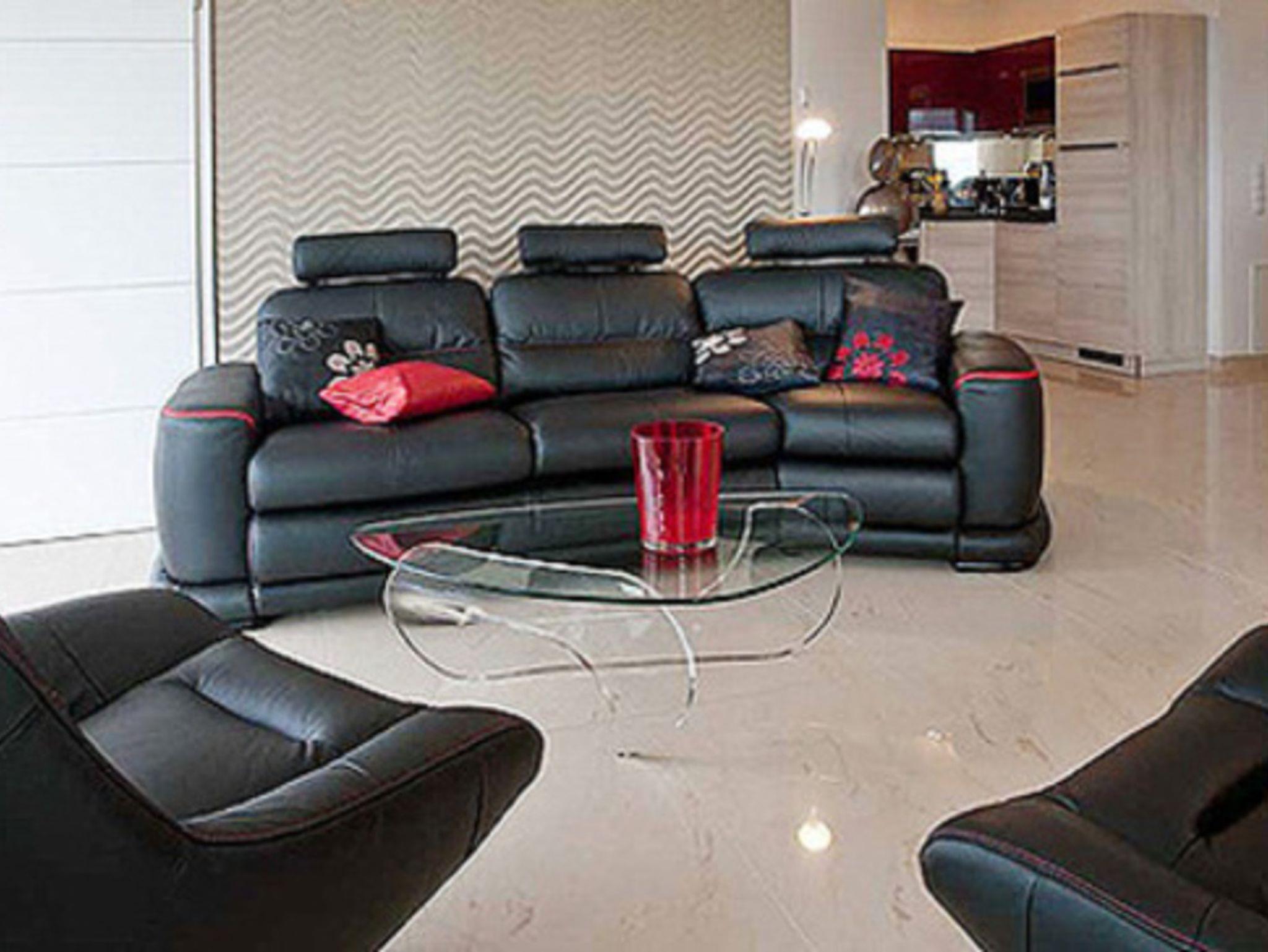 Eine Sitzgruppe in schwarzem Leder ist mit Blick ins Grüne ausgerichtet.